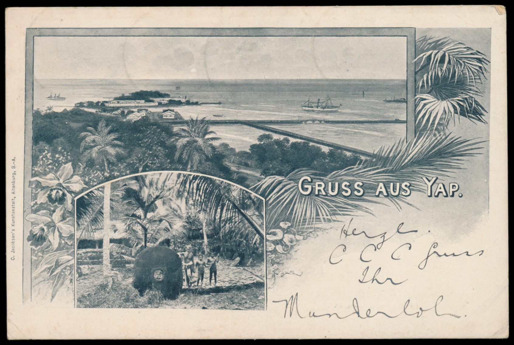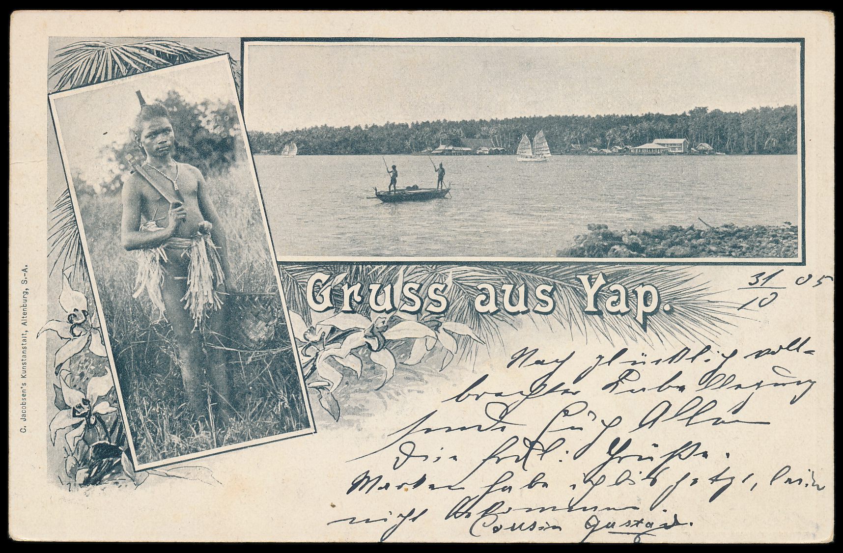 Zweibild-Ansichtskarte "Gruss aus Yap" - Eingeborener / Panorama von Yap, Frankatur 5 Pf., Stempel Yap 24.11.05, nach Geestemünde, Bedarf