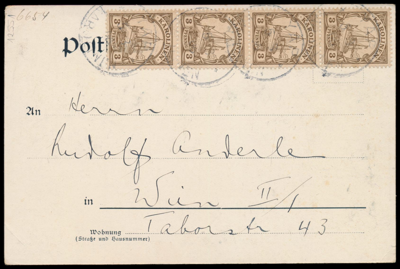 4 x 3 Pf. mit Stempel Yap 5.5.06 auf Zweibild-Ansichtskarte "Gruss aus Yap" als Drucksache nach Wien
