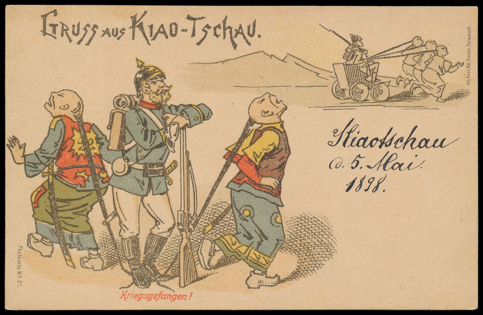 mehrfarbige Spott-Ansichtskarte "Gruss aus Kiao-Tschau. - Kriegsgefangen" , Postkarte No. 31, Lith. Anst. Val. Sachs, Darmstadt, ungelaufen