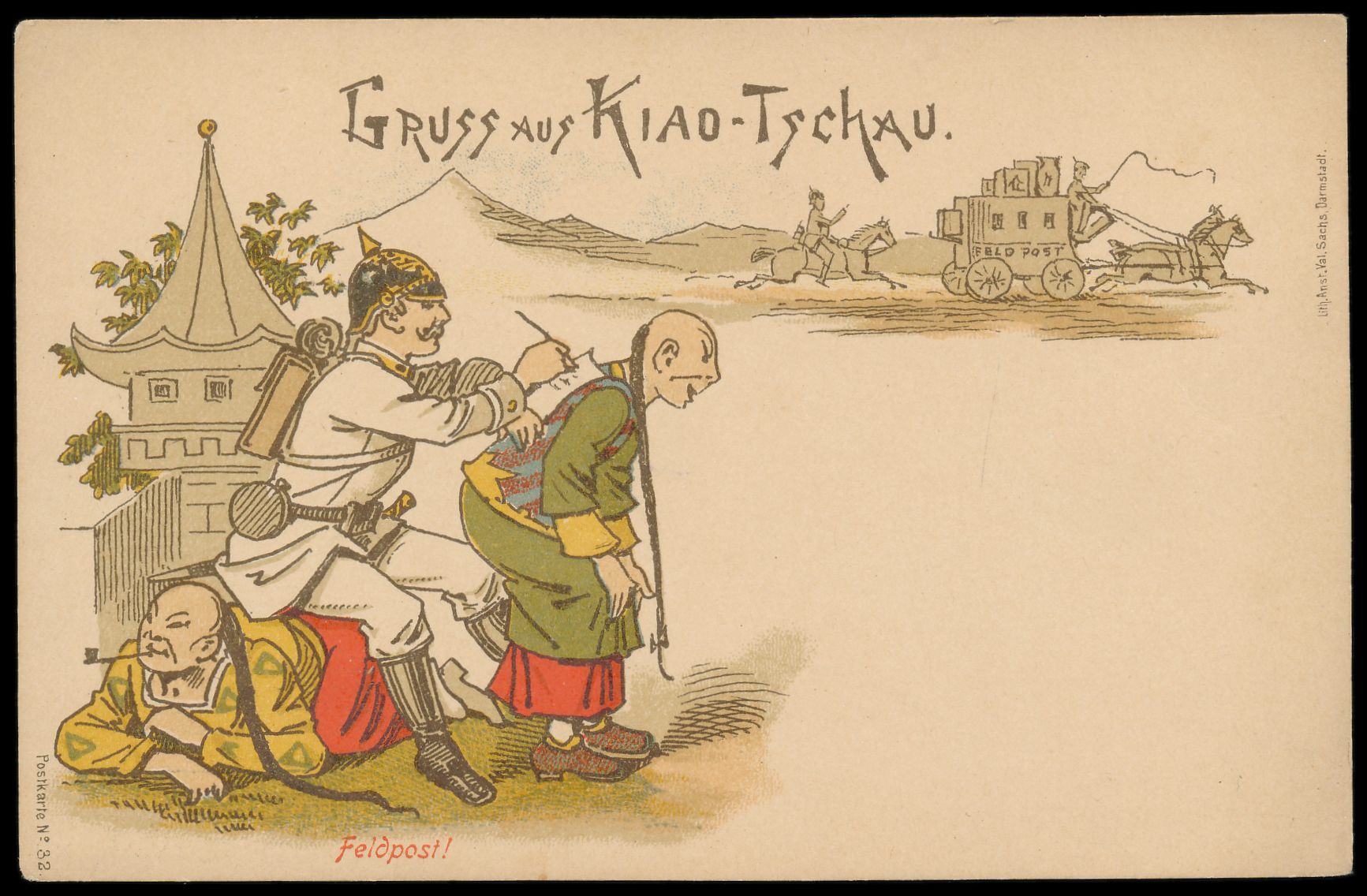 mehrfarbige Spott-Ansichtskarte "Gruss aus Kiao-Tschau. - Feldpost" , Postkarte No. 32, Lith. Anst. Val. Sachs, Darmstadt, ungelaufen