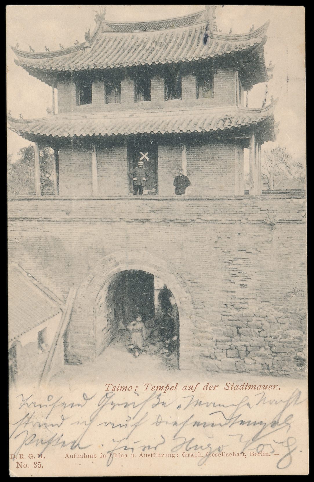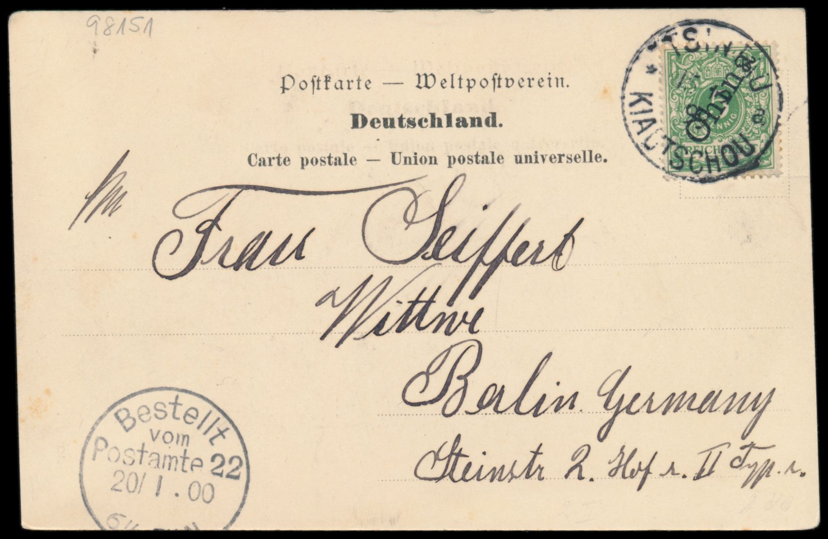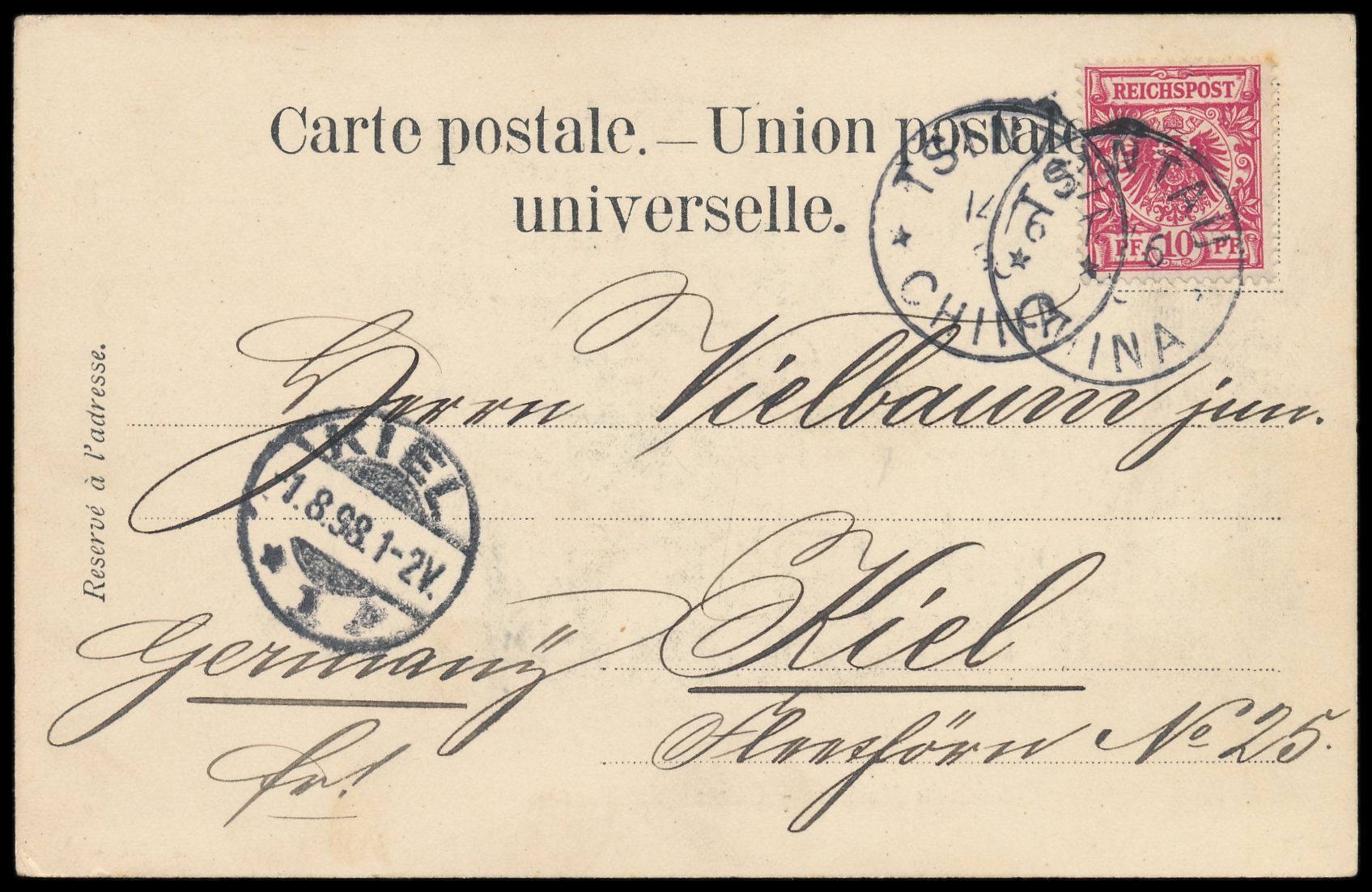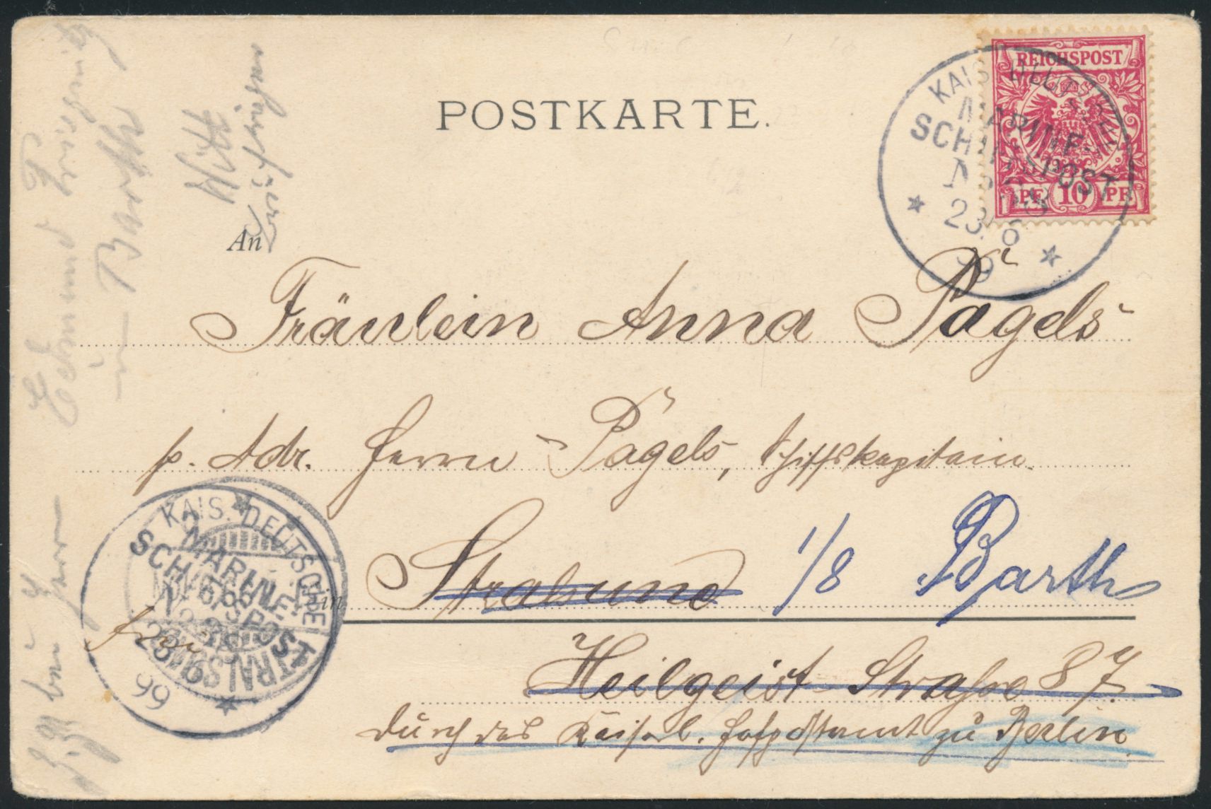 Stempel MSP No. 38 23.6.99, S.M.S. Gefion in Tsingtau, zwei Abschläge auf Ansichtskarte Kiautschou. Eingang zum Offiziers-Yamen des Ostlagers, Frankatur Dt. Reich 10 Pf., nach Stralsund, Ankunftstempel 31.7.99, nachgesandt nach Barth, langer Bedarfstext
