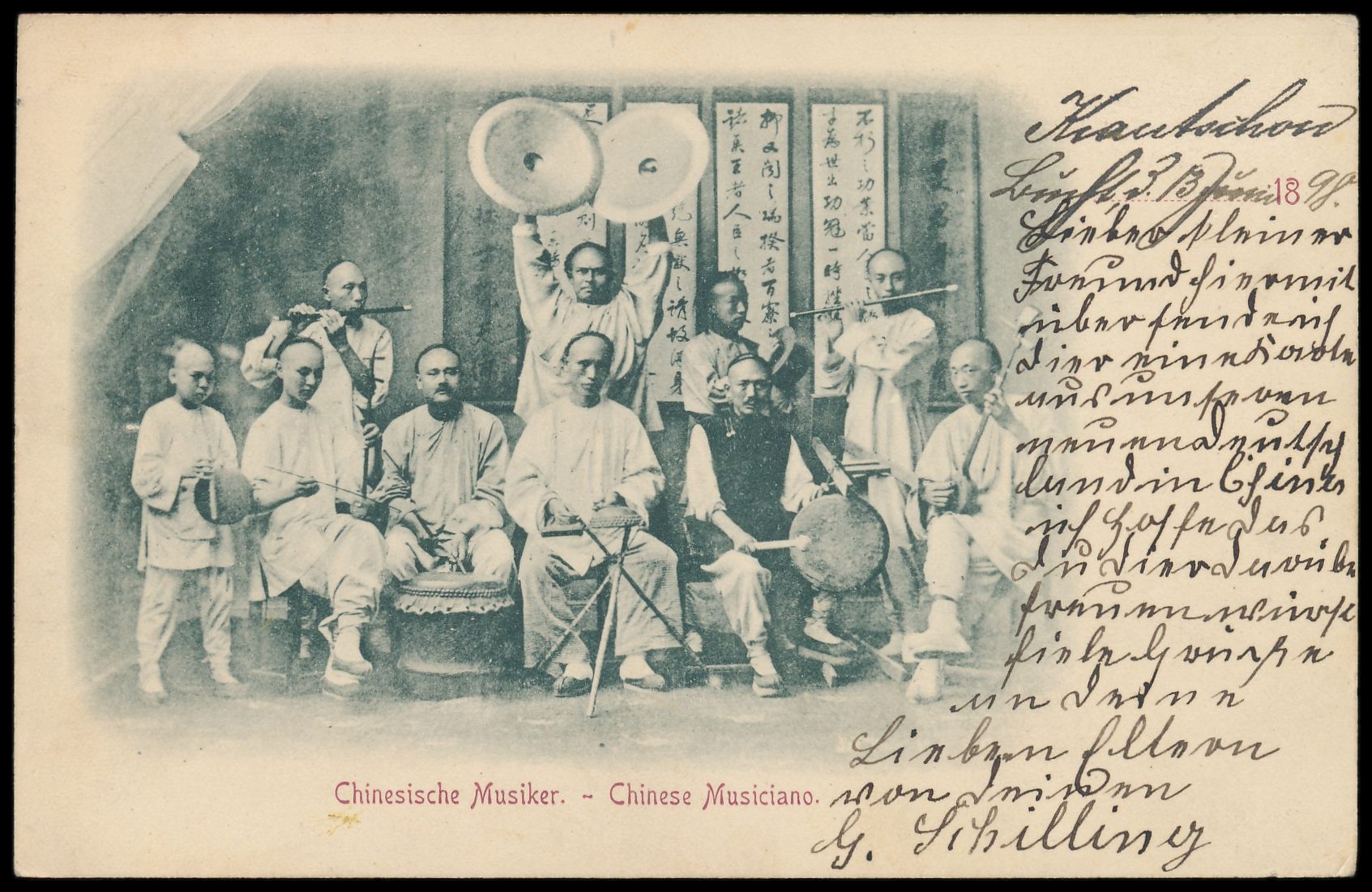 Stempel Tsintau / China 14.6.98 auf Ansichtskarte Chinesische Musiker, Vorläufer-Frankatur Dt. Reich 10 Pf., nach Kiel, Ankunftstempel 1.8.98, Bedarf