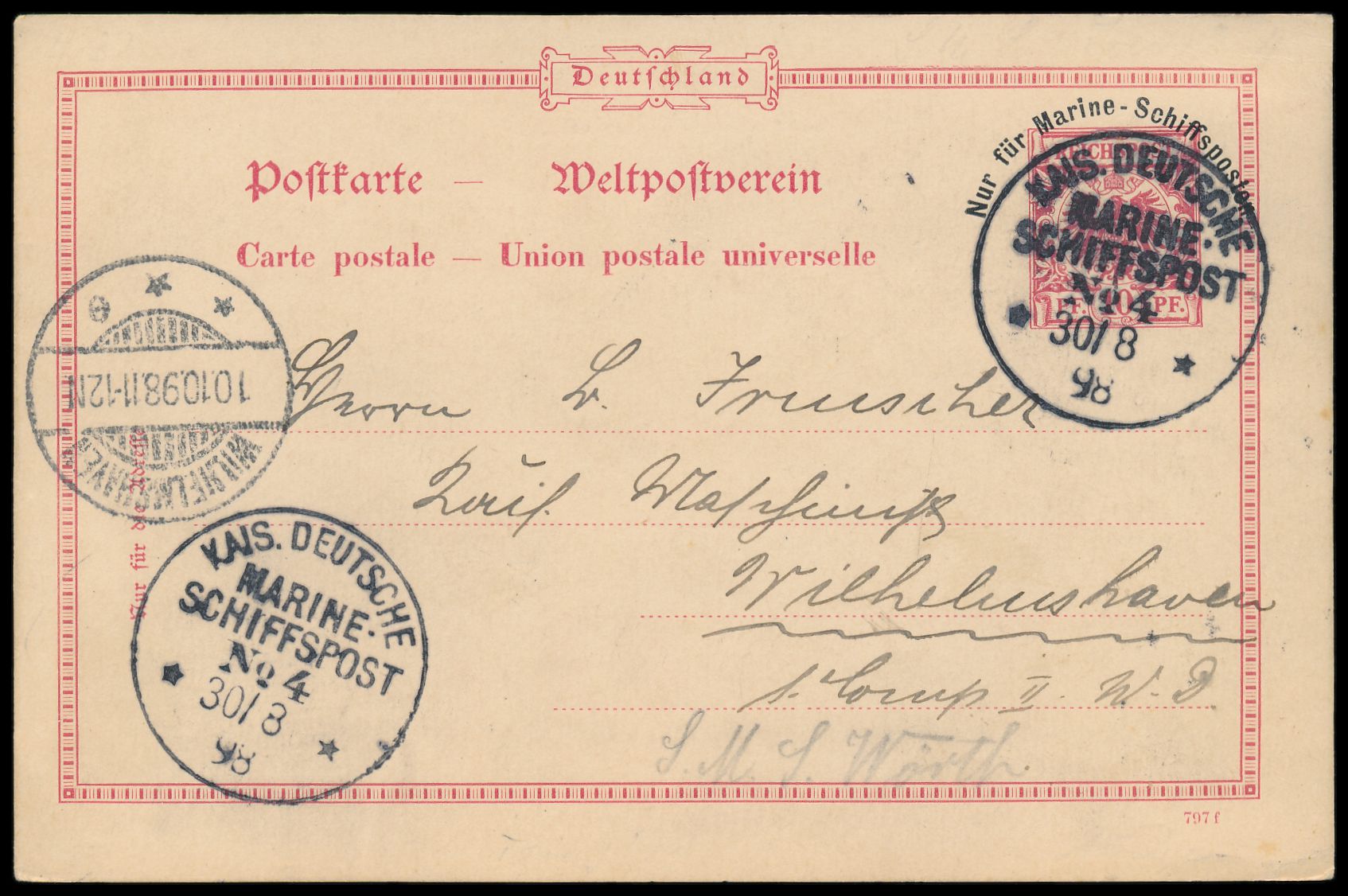 Stempel MSP No. 4 30.8.98, S.M.S. Irene in Tsingtau, 2 klare Abschläge auf MSP-Ganzsache nach Wilhelmshaven, Ankunftstempel 10.10.98, Bedarf