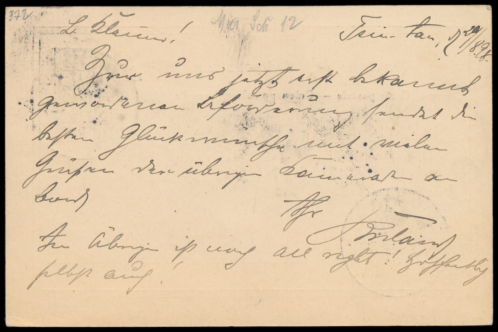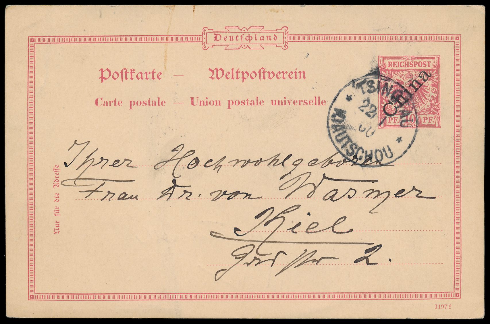 Stempel Tsintanfort Marine-Feldpost 11.3.98, vermutlich Letzttag vor der Aptierung, auf Dt. Reich-Ganzsache 10 Pf. an Firma Melchers & Co. in Shanghai, geschrieben "Rheede von Tsingtau 11.3.98 an Bord S.M.S. Kaiser ....", Bedarf