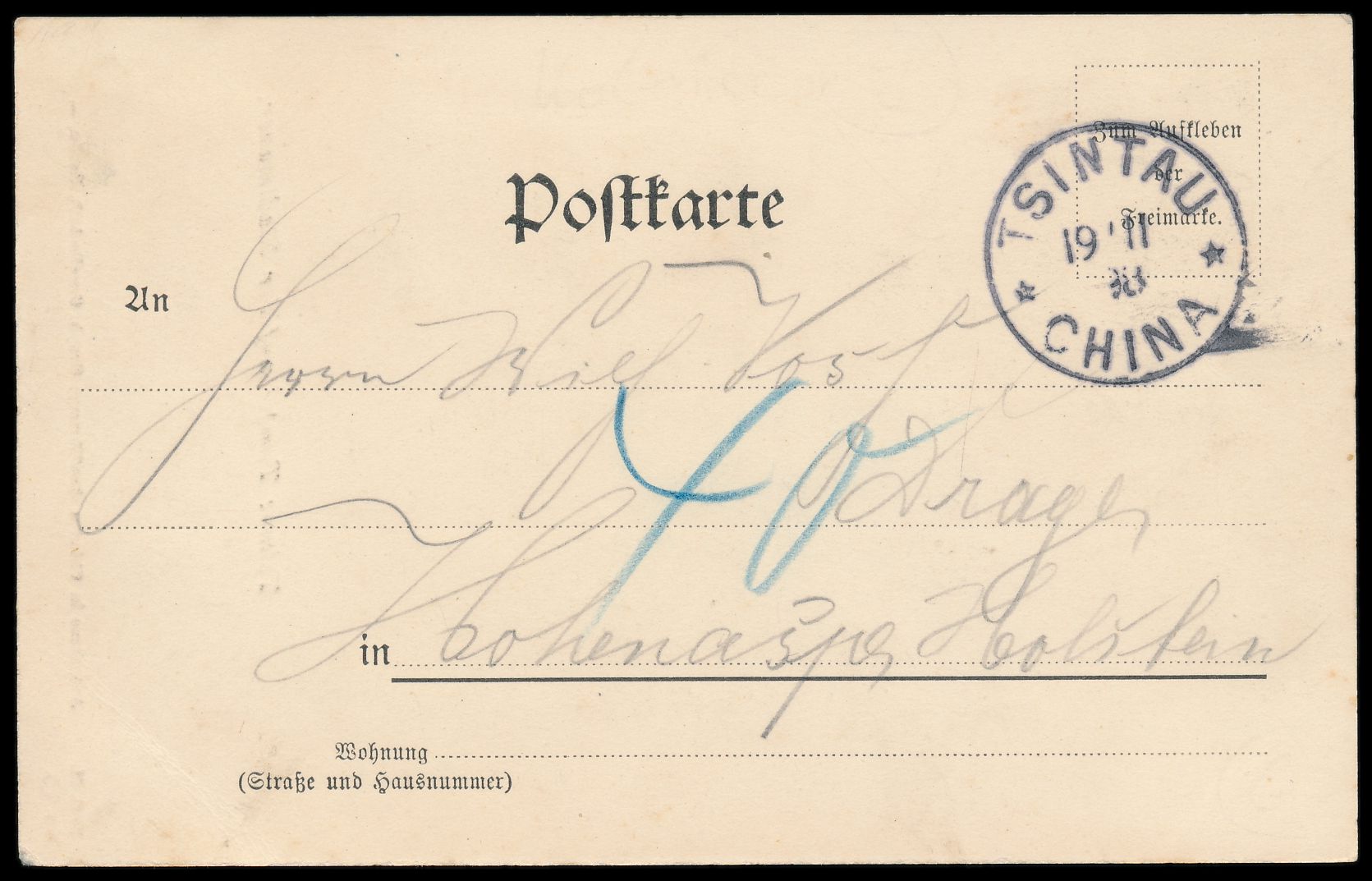 Ganzsache Dt. Post in China 10 Pf. mit rückseitigem Textzudruck "Gruss aus Tsintau" und mehrfarbiger chinesischer Tuschezeichnung: Chinesin mit Fächer und blühendem Strauch, gedruckte Verlagsangabe "Verlag von Sietas, Plambeck & Co., Tsintau", Stempel Tsingtau 22.1.00, nach Kiel, Bedarf