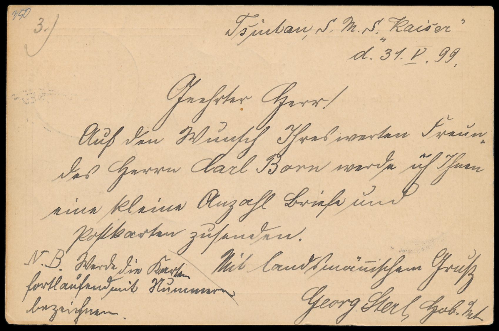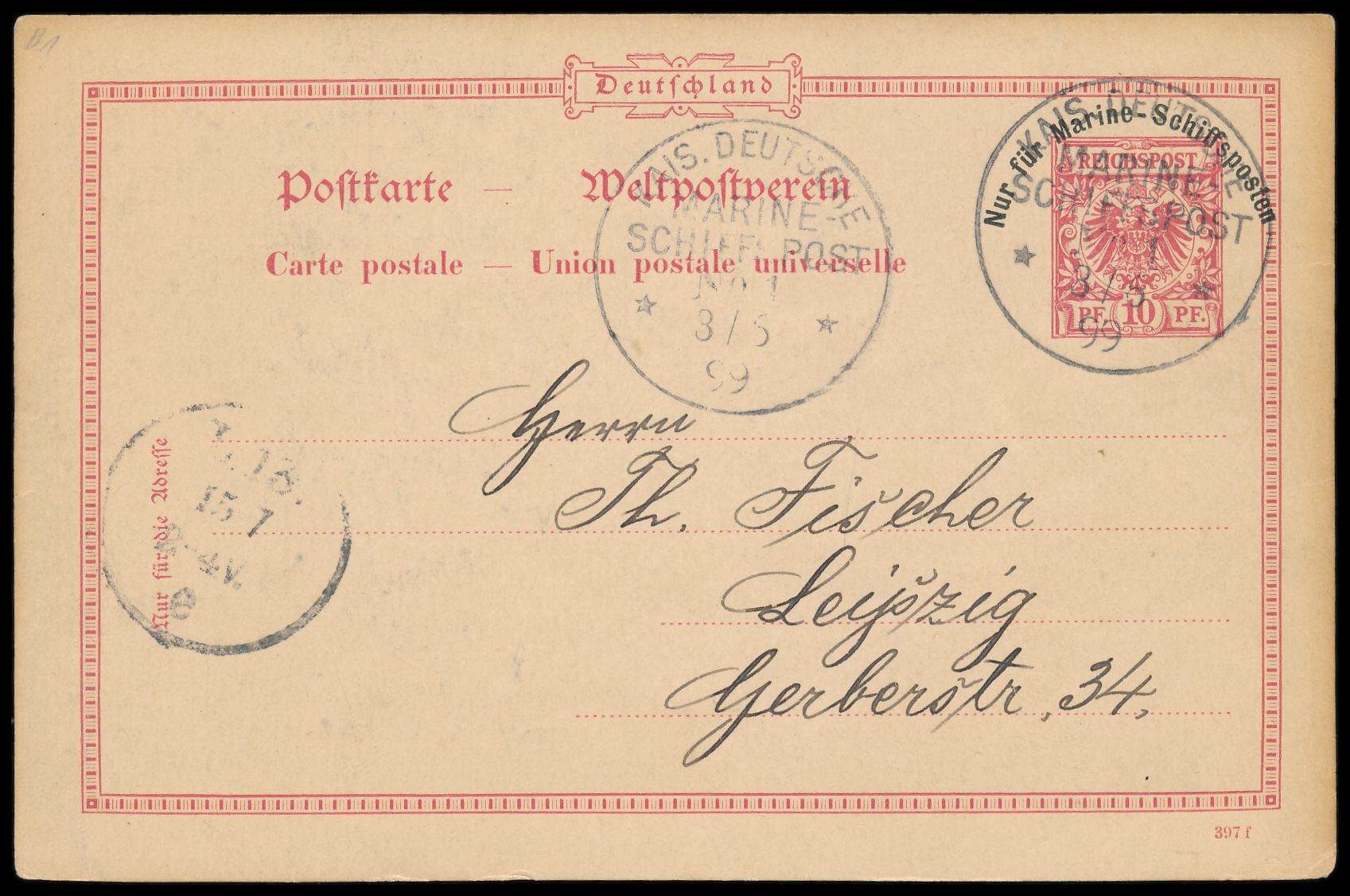 Stempel MSP No. 1 3.6.99, S.M.S. Kaiser während der Liegezeit in Tsingtau, zwei Abschläge auf MSP-Ganzsache nach Leipzig, Ankunftstempel 15.7.99, Bedarf