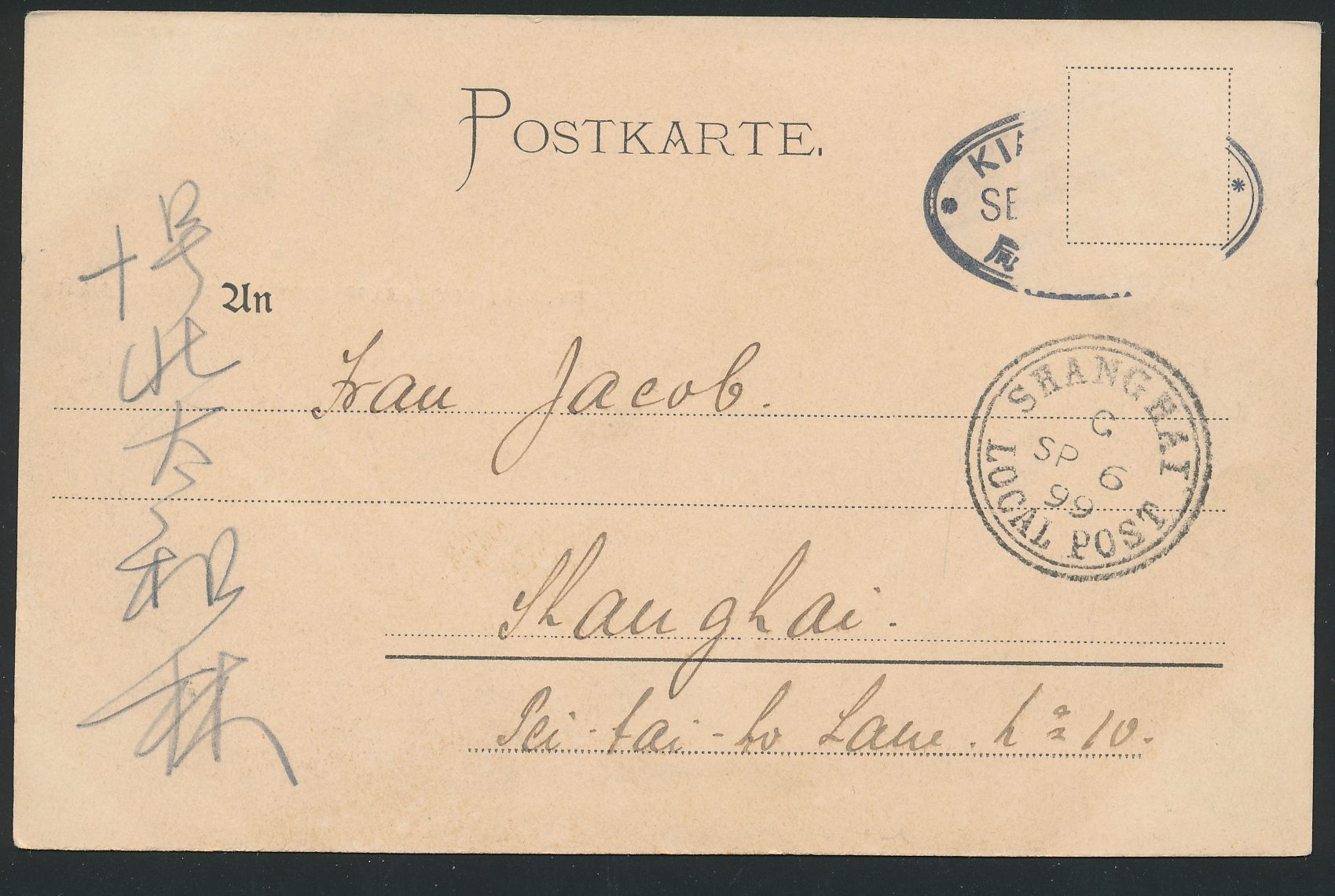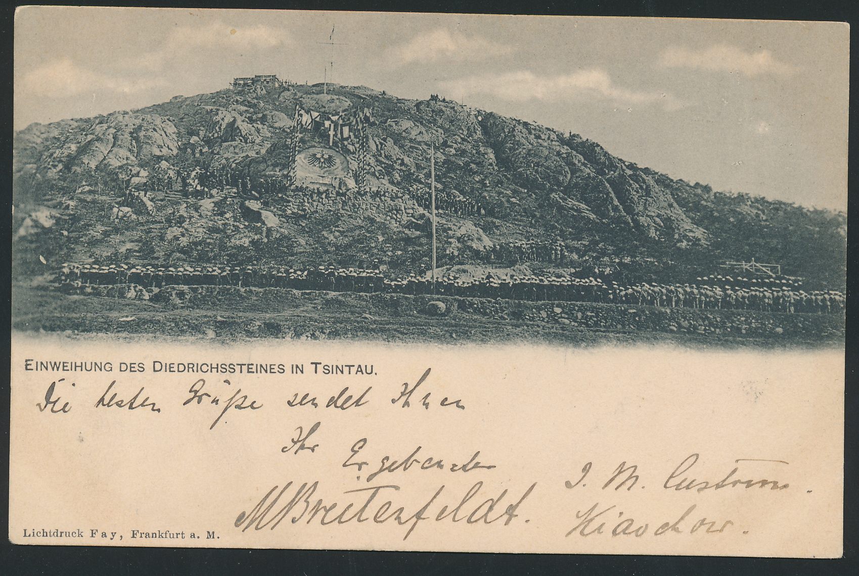 Ansichtskarte Einweihung des Diedrichsteines in Tsintau, Druckvermerk "Lichtdruck FAY, Frankfurt a. M.", chinesische Frankatur abgefallen, nach Shanghai, Ankunftstempel Shanghai Local Post 6.9.99