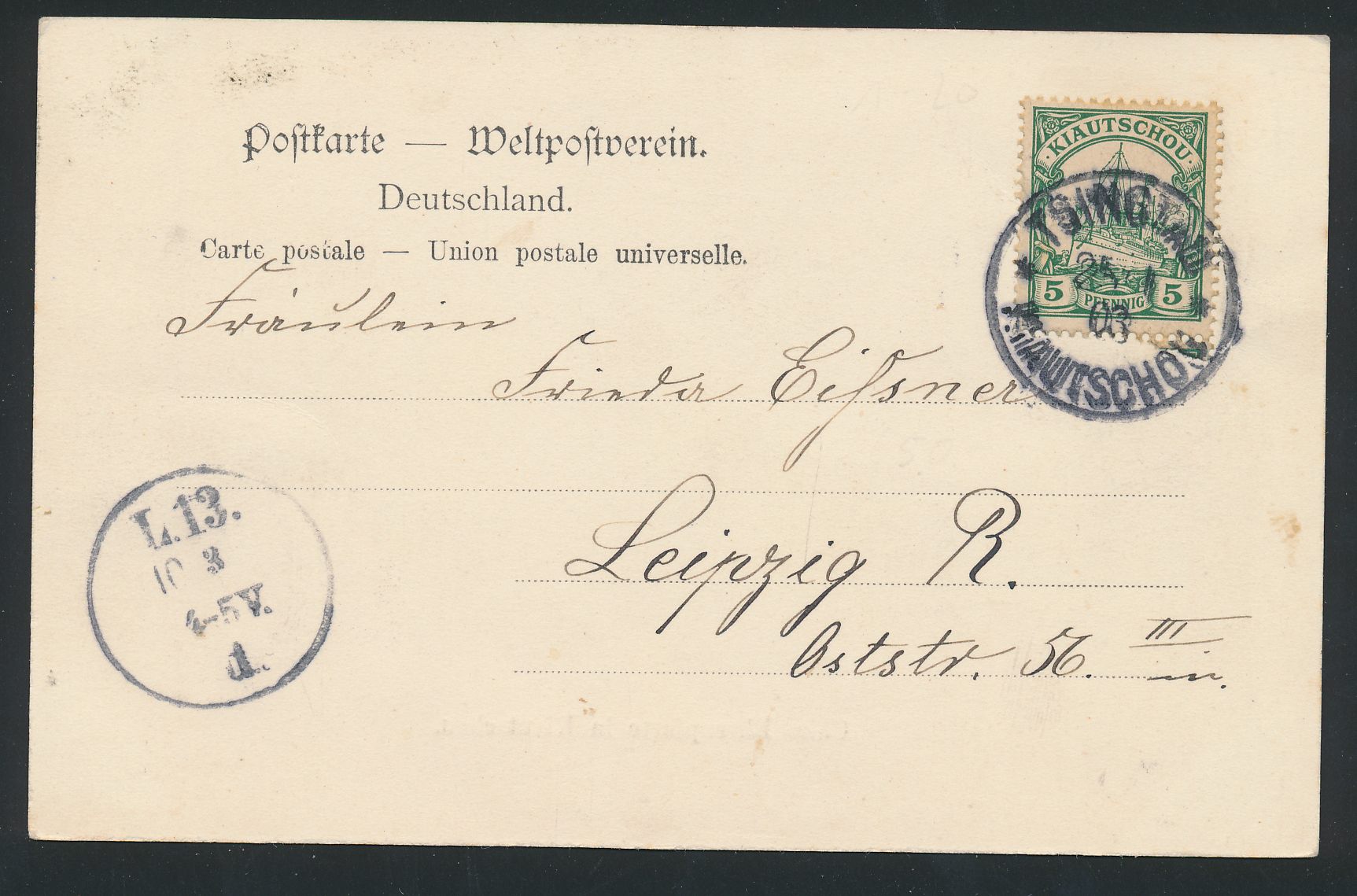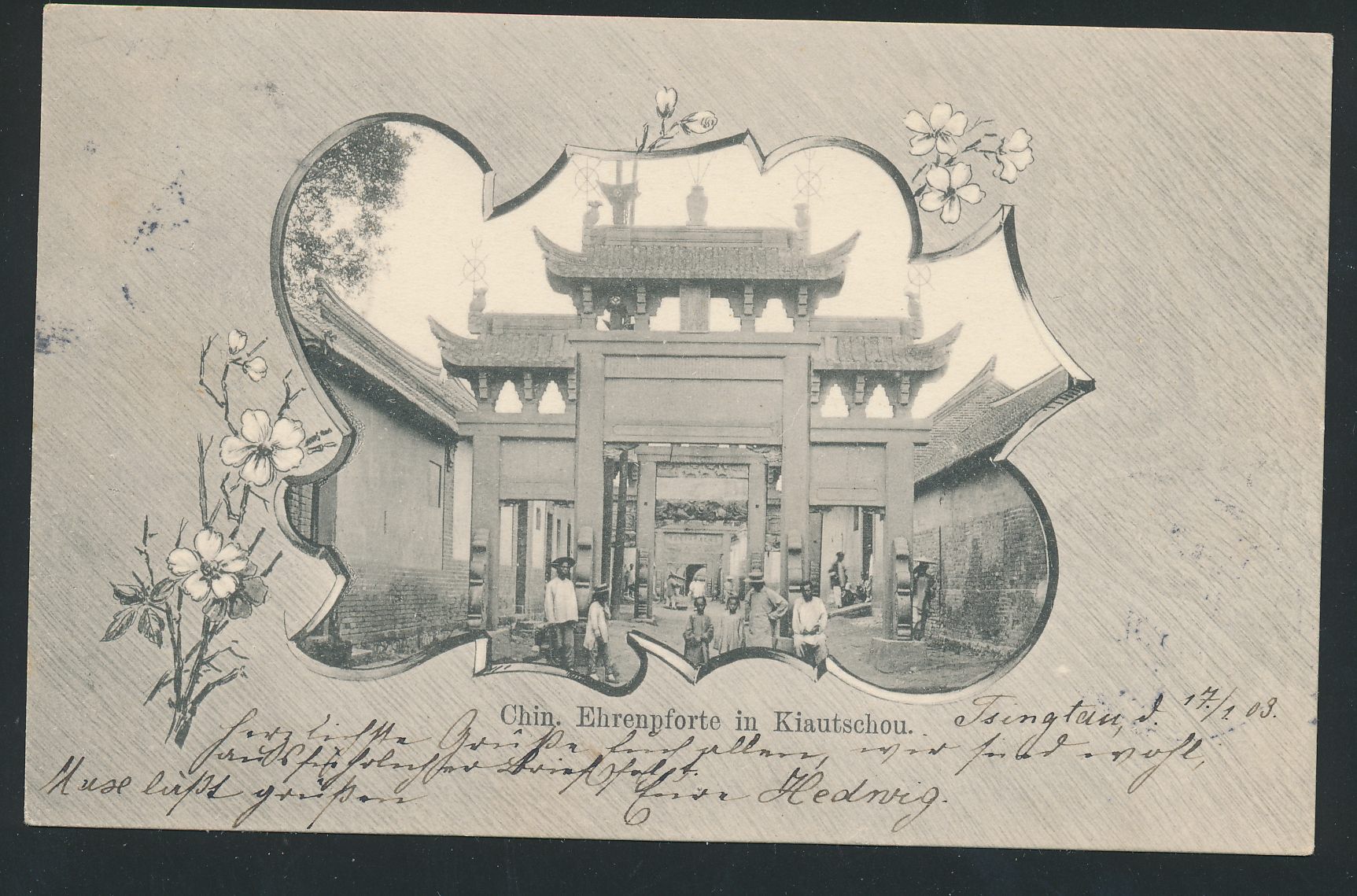 Ansichtskarte Chin. Ehrenpforte in Kiautschou im Zierrahmen, Frankatur 5 Pf., Stempel Tsingtau 25.1.03, nach Leipzig, Ankunftstempel 10.3., Bedarf