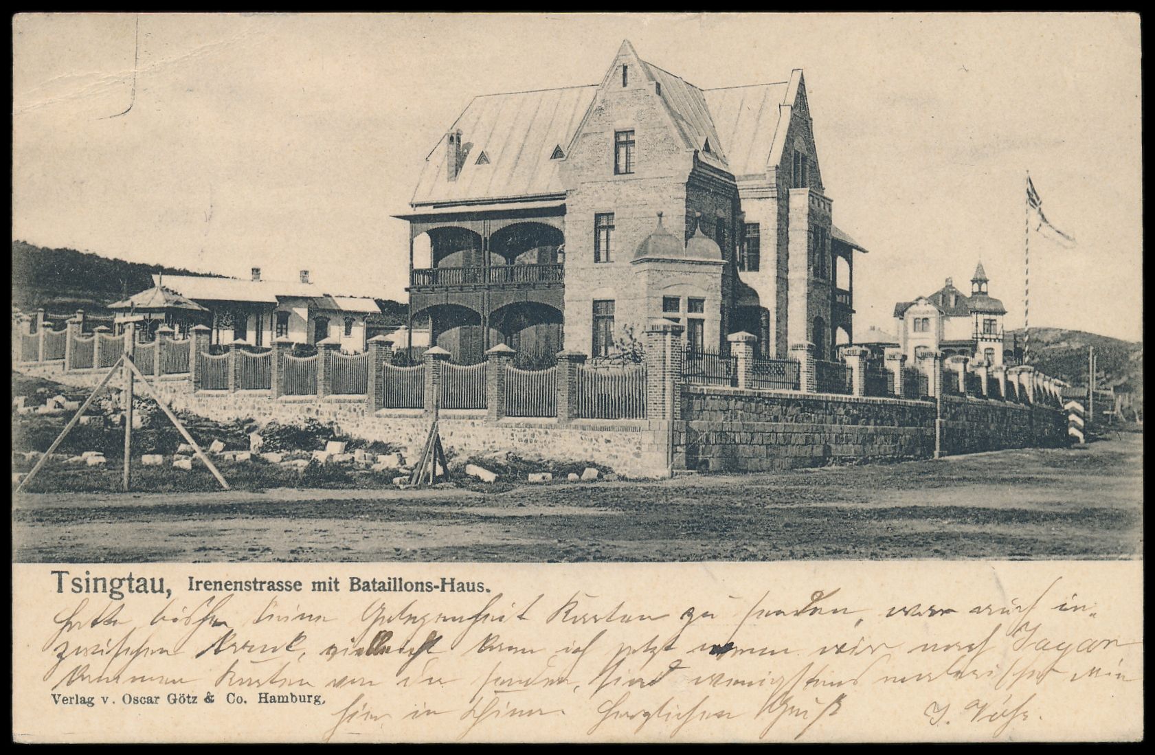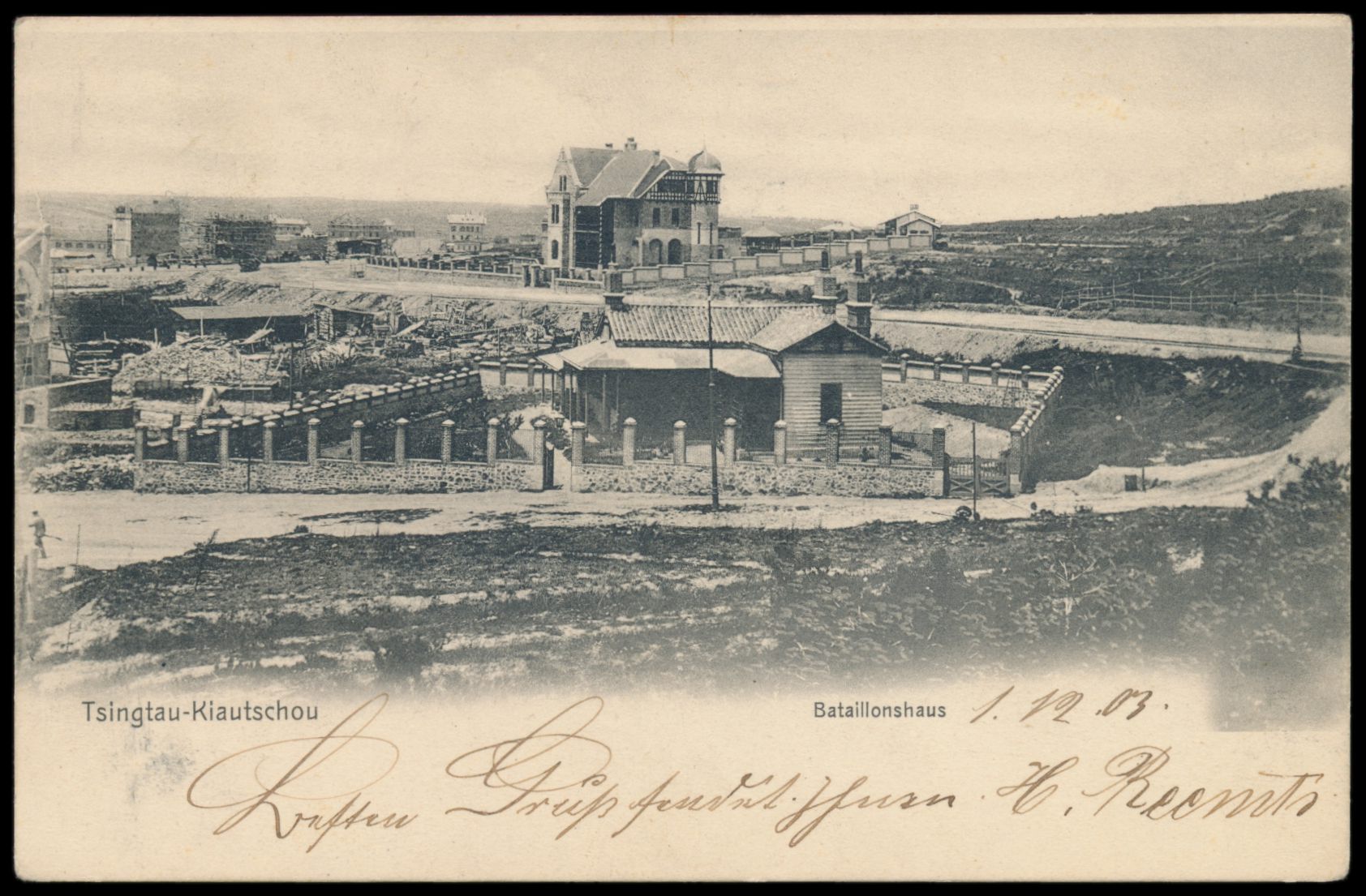 Ansichtskarte Tsingtau - Bataillonshaus, ohne Verlagangabe, Frankatur 5 Pf., Stempel Tsingtau 4.2.03, nach Hannover, Bedarf