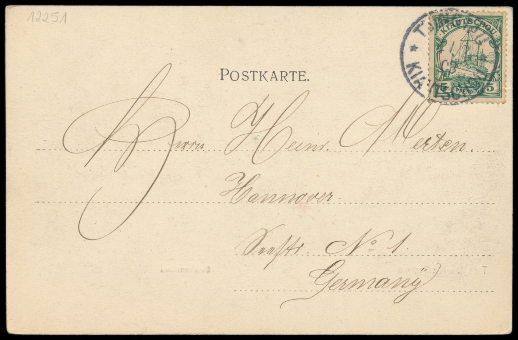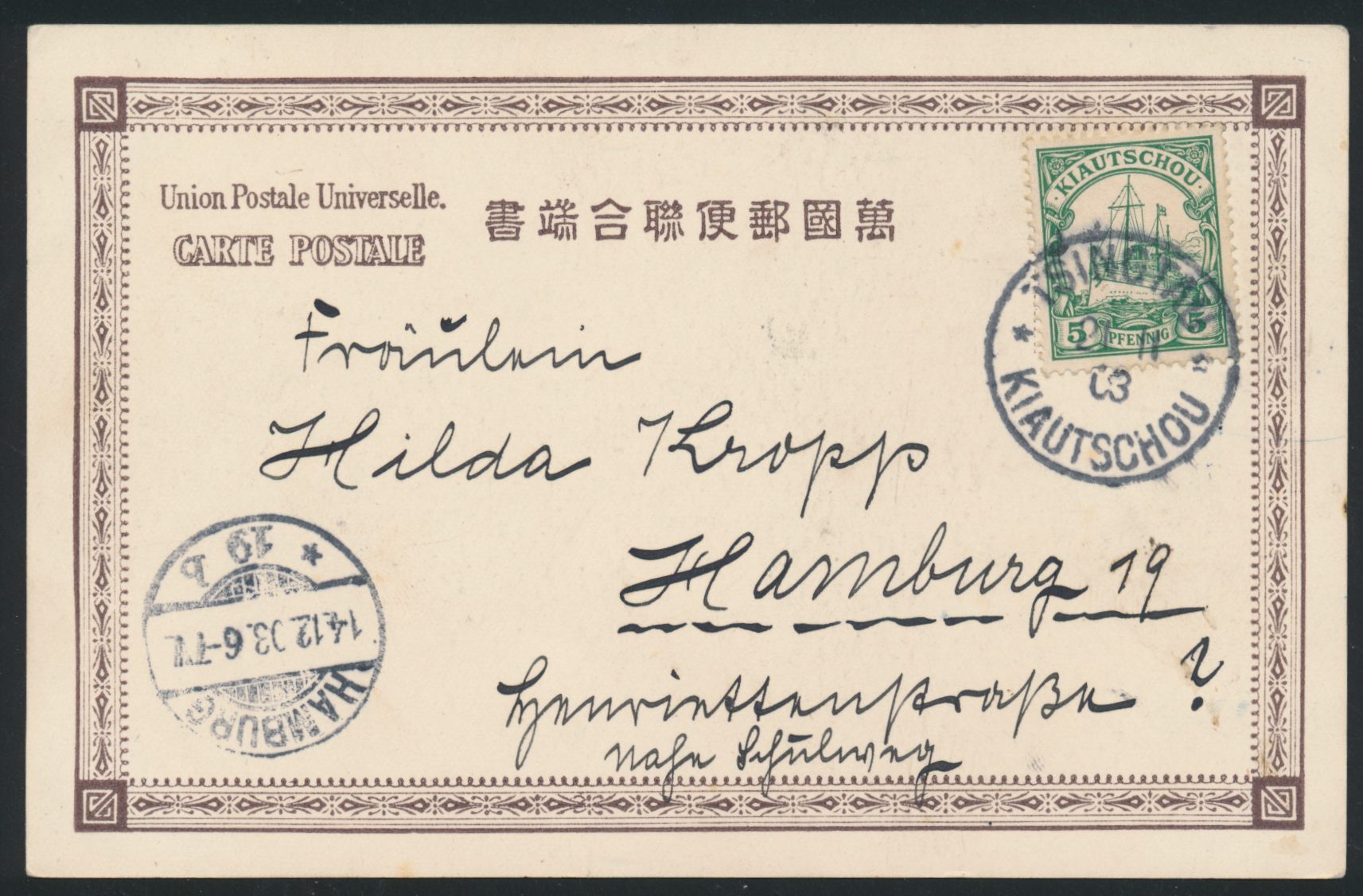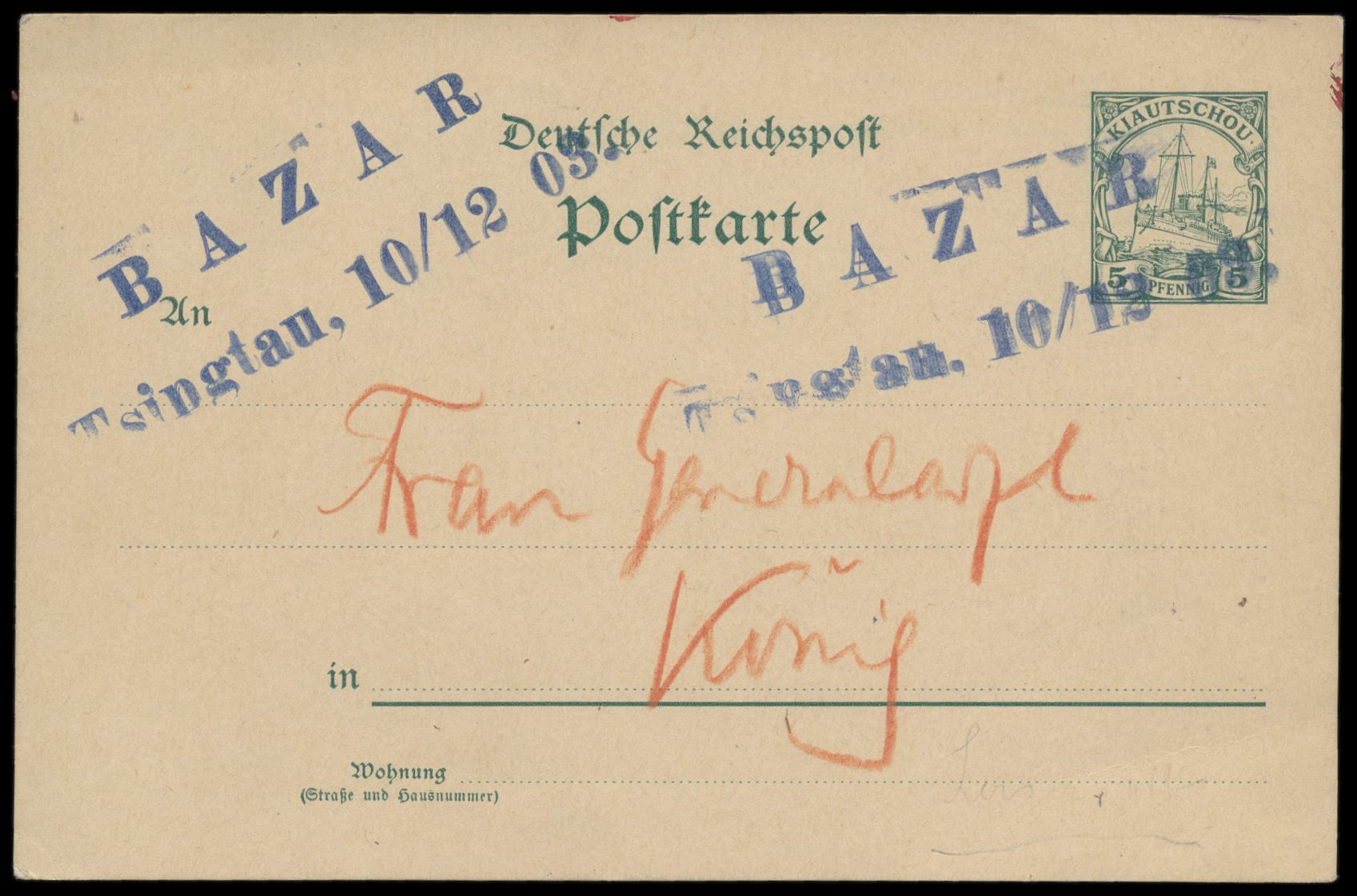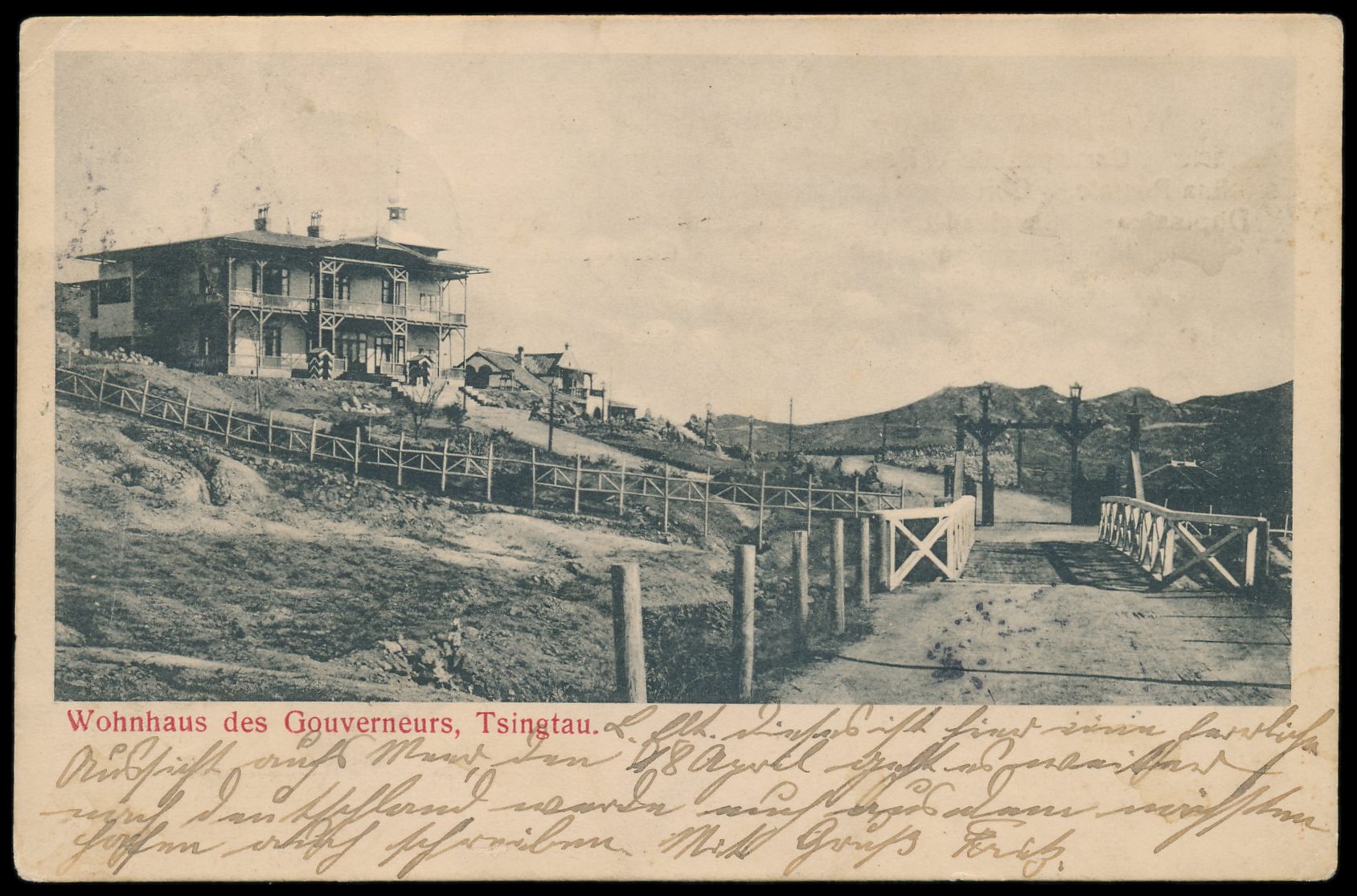 Ansichtskarte Wohnhaus des Gouverneurs, Tsingtau, Frankatur 5 Pf., Stempel Tsingtau 27.3.03, Absenderangabe "... z. Z. D. Neckar", nach Hamburg, Bedarf