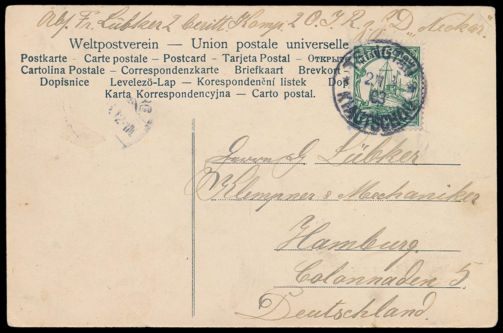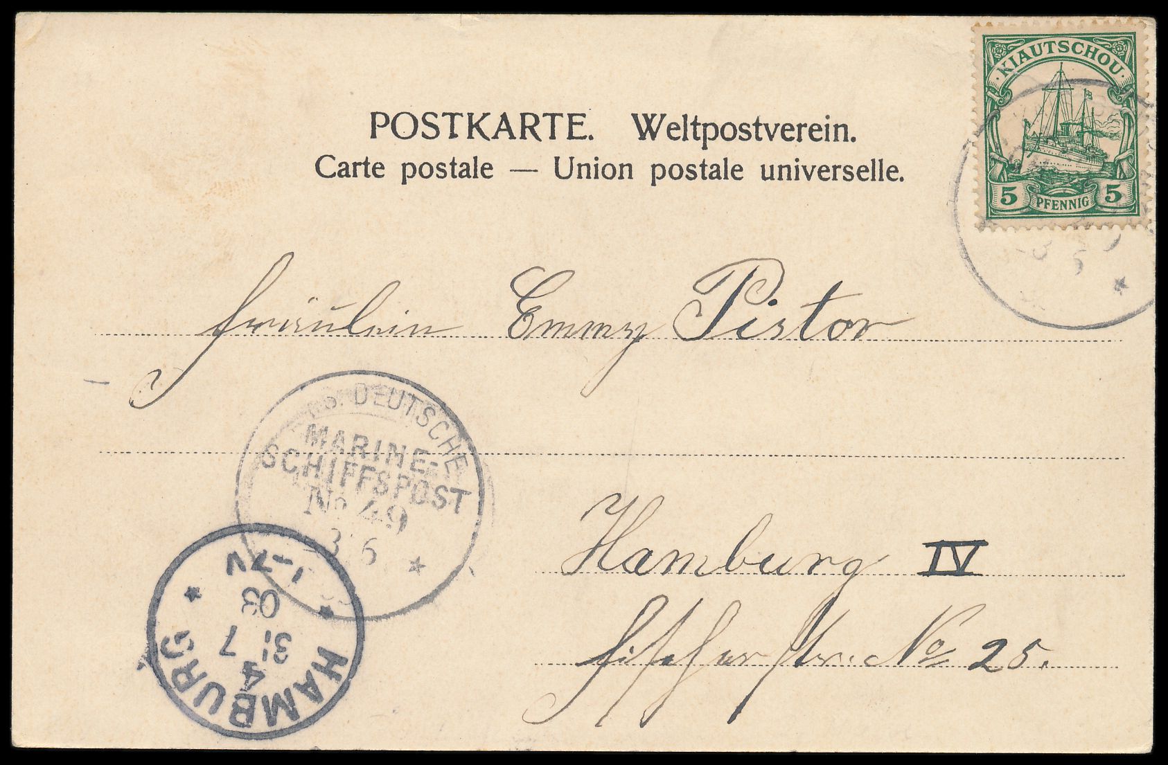 Stempel MSP No. 49 23.6.03, NDL-Dampfer Main, während der Liegezeit in Tsingtau, laut Stempel-Katalog Verwendung bisher nicht bekannt, Ablösungstransport, zwei Abschläge auf Ansichtskarte Tsingtau - Irenenstrasse mit Bataillons-Haus nach Hamburg, Ankunftstempel 31.7.03, Bedarf