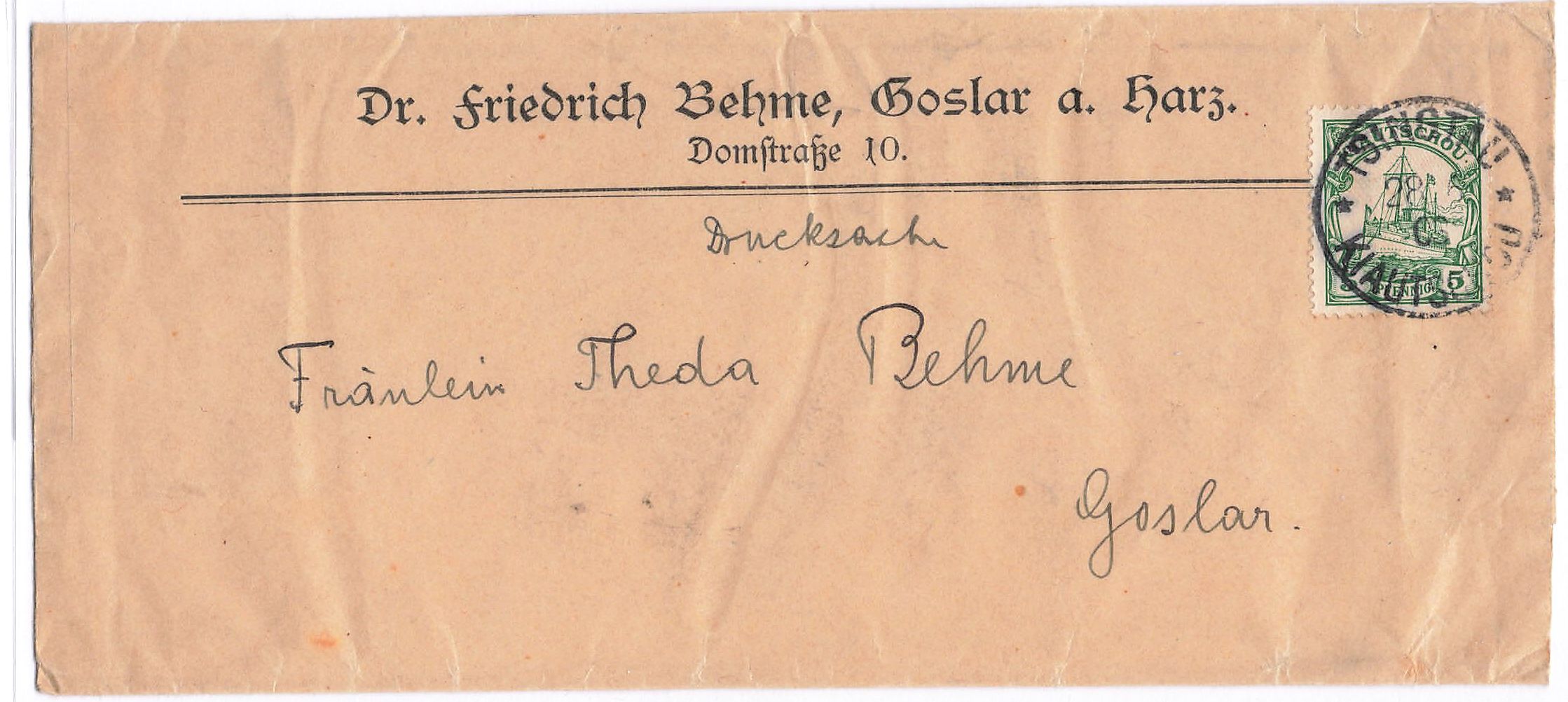 Zwei Briefe einer Korrespondenz aus Tsingtau über Sibirien nach Deutschland: Brief mit Russische Post in China 1 Kop. und 3 x 3 Kop. mit Stempel Tschifu 27.7.1903 und Ankunftstempel Goslar 19.8.03, sowie Brief mit Kiautschou 2 x 5 Pf. und Stempel Tsingtau 19.1.04 und Ankunftstempel Goslar 12.2.04, Bedarf, aus der Korrespondenz des Dr. Friedrich Behme