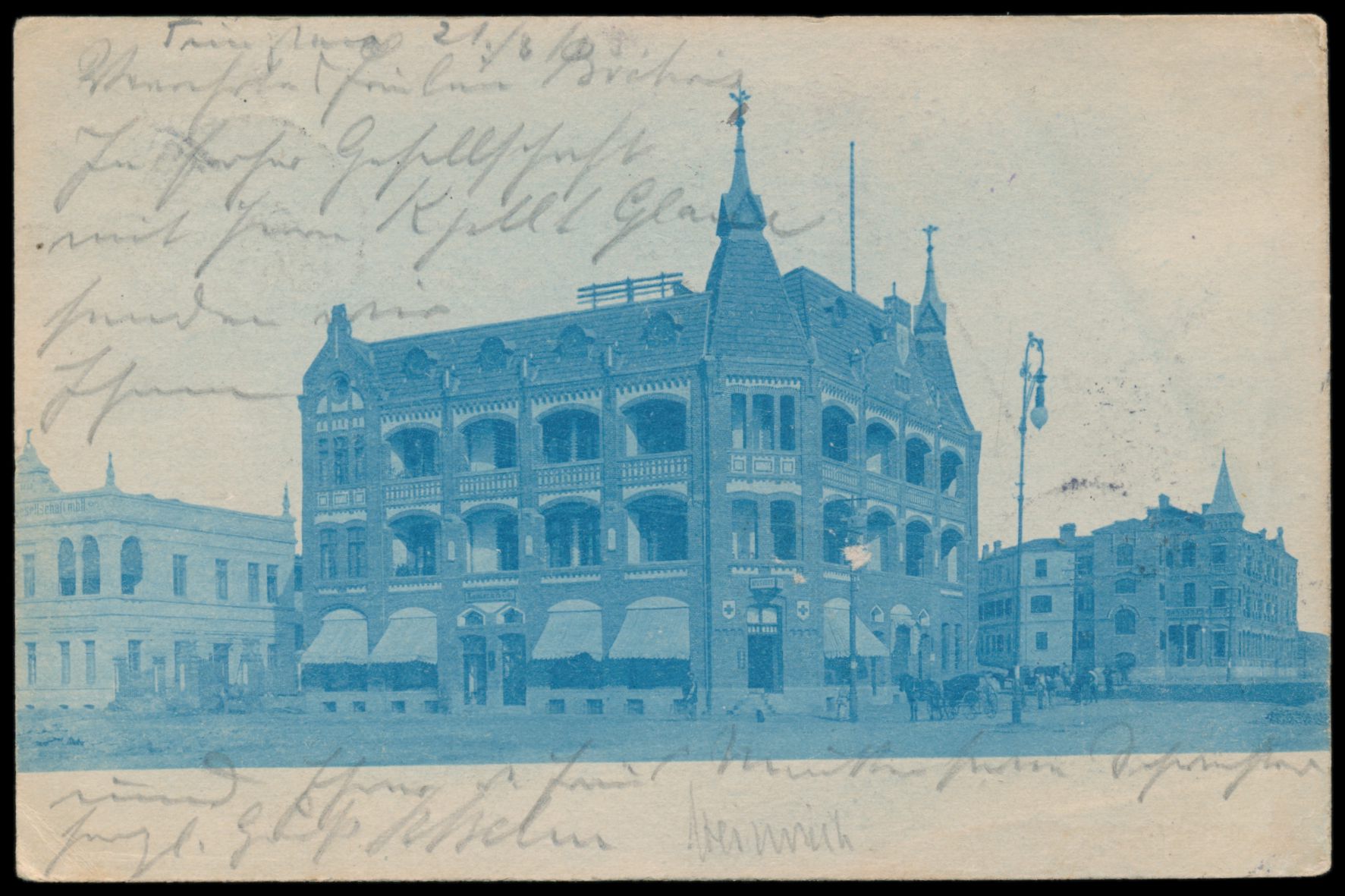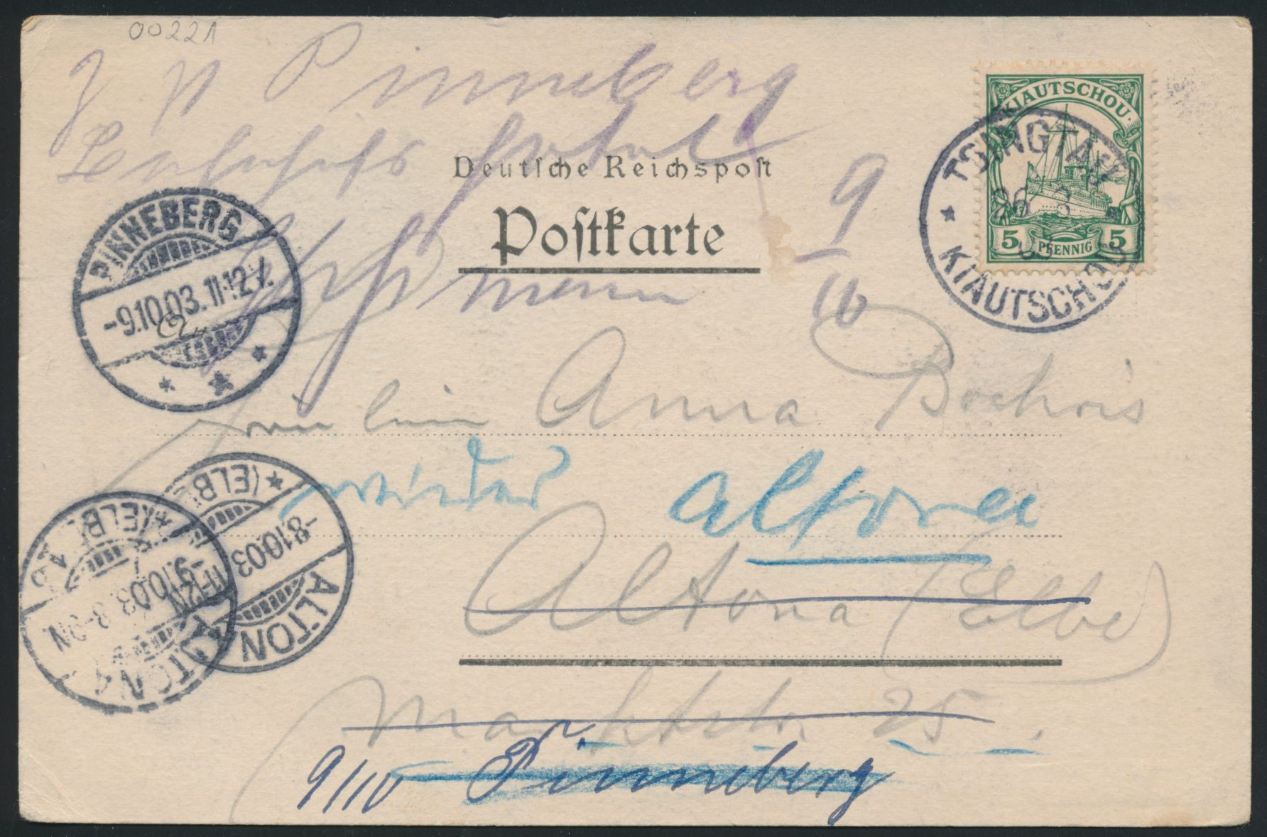 Ansichtskarte Tsingtau - Firmengebäude mit Rot Kreuz-Apotheke und Firma Kabisch & Co., Privataufnahme, winzige Schürfstelle im Bild, Frankatur 5 Pf., Stempel Tsingtau 26.8.03, nach Altona und nachgesandt nach Pinneberg, Ankunftstempel 9.10.03, Bedarf