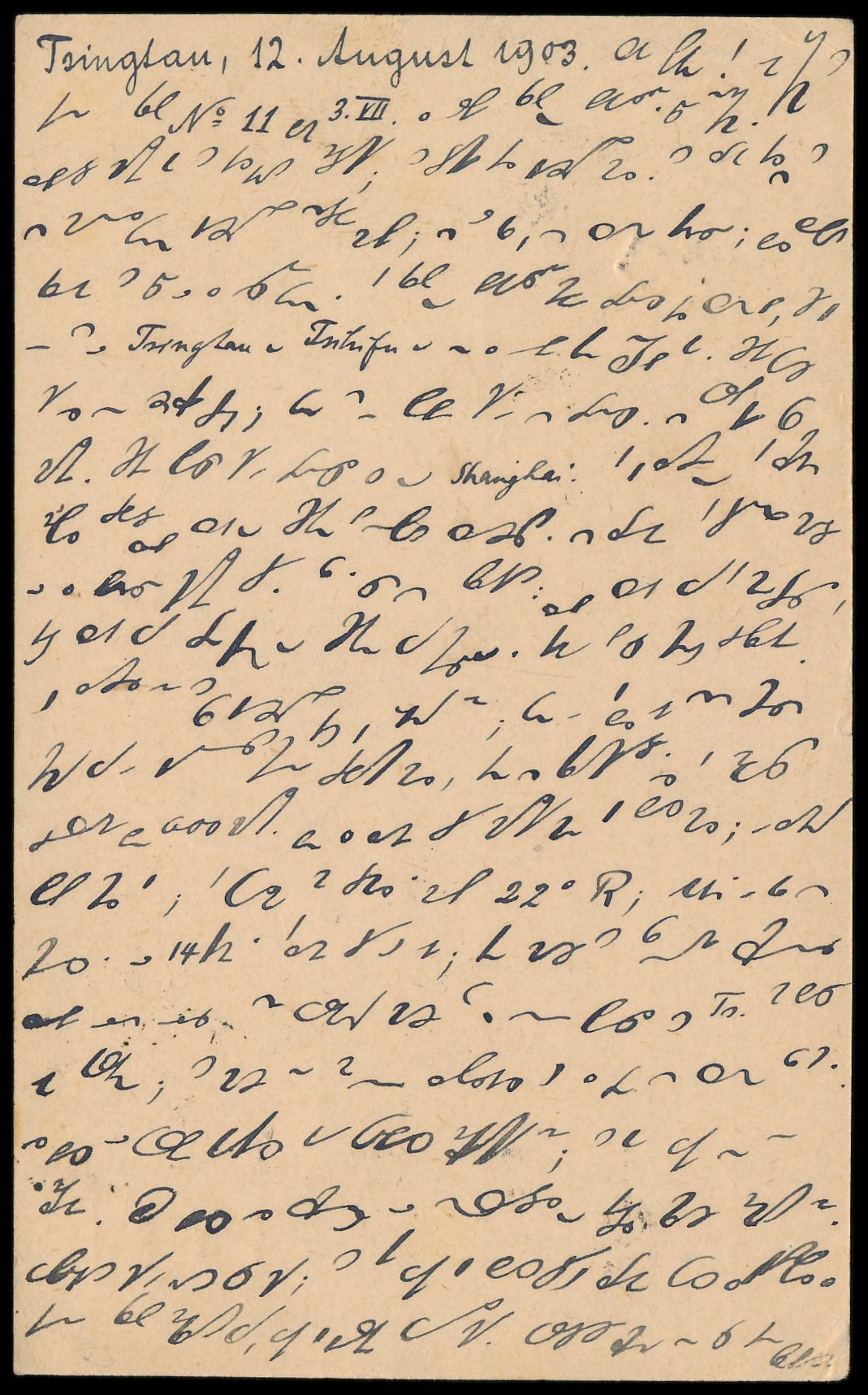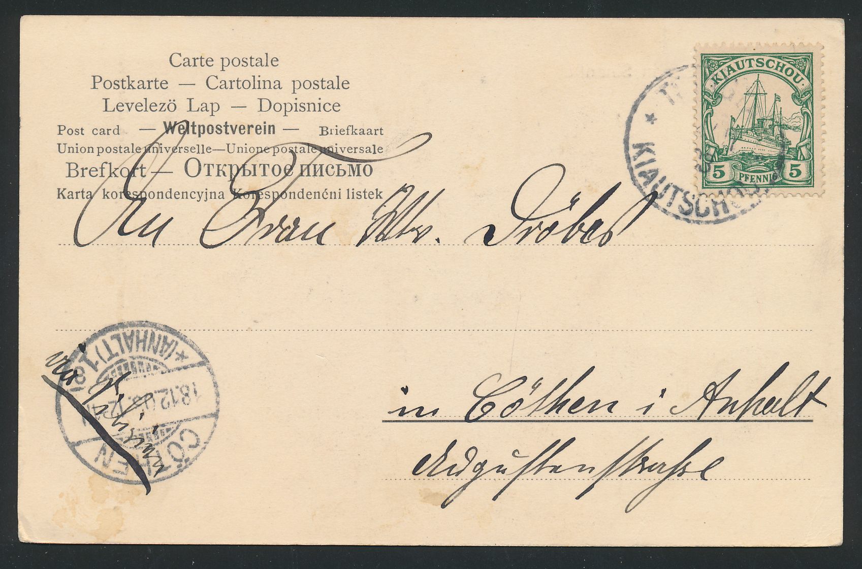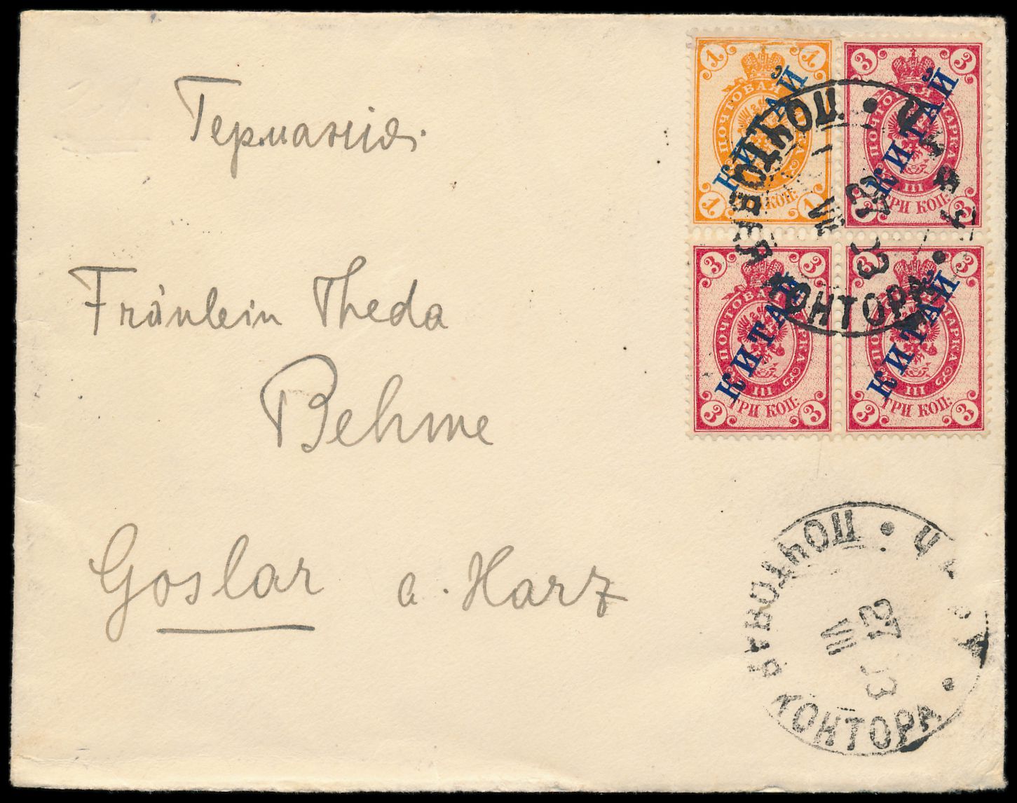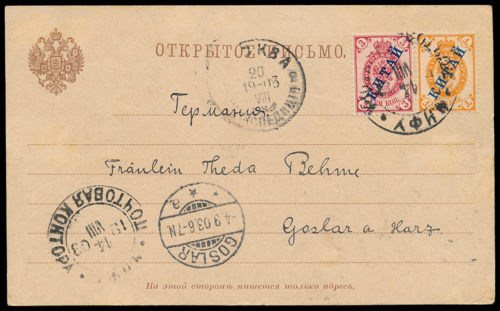 Russische Post in China 1 Kop. und 3 Kop. auf russischem Postkarten-Formblatt mit Stempel Tschifu 14.8.1903 via Sibirien nach Goslar, geschrieben in Tsingtau 12.8.1903 (Steno-Text), Durchgangsstempel Moskau 20.8.1903 und Ankunftstempel Goslar 4.9.03, vor Zulassung der deutschen Postämter zur Briefpostbeförderung über Sibirien im Oktober 1903, aus der Korrespondenz des Dr. Friedrich Behme, Bedarf