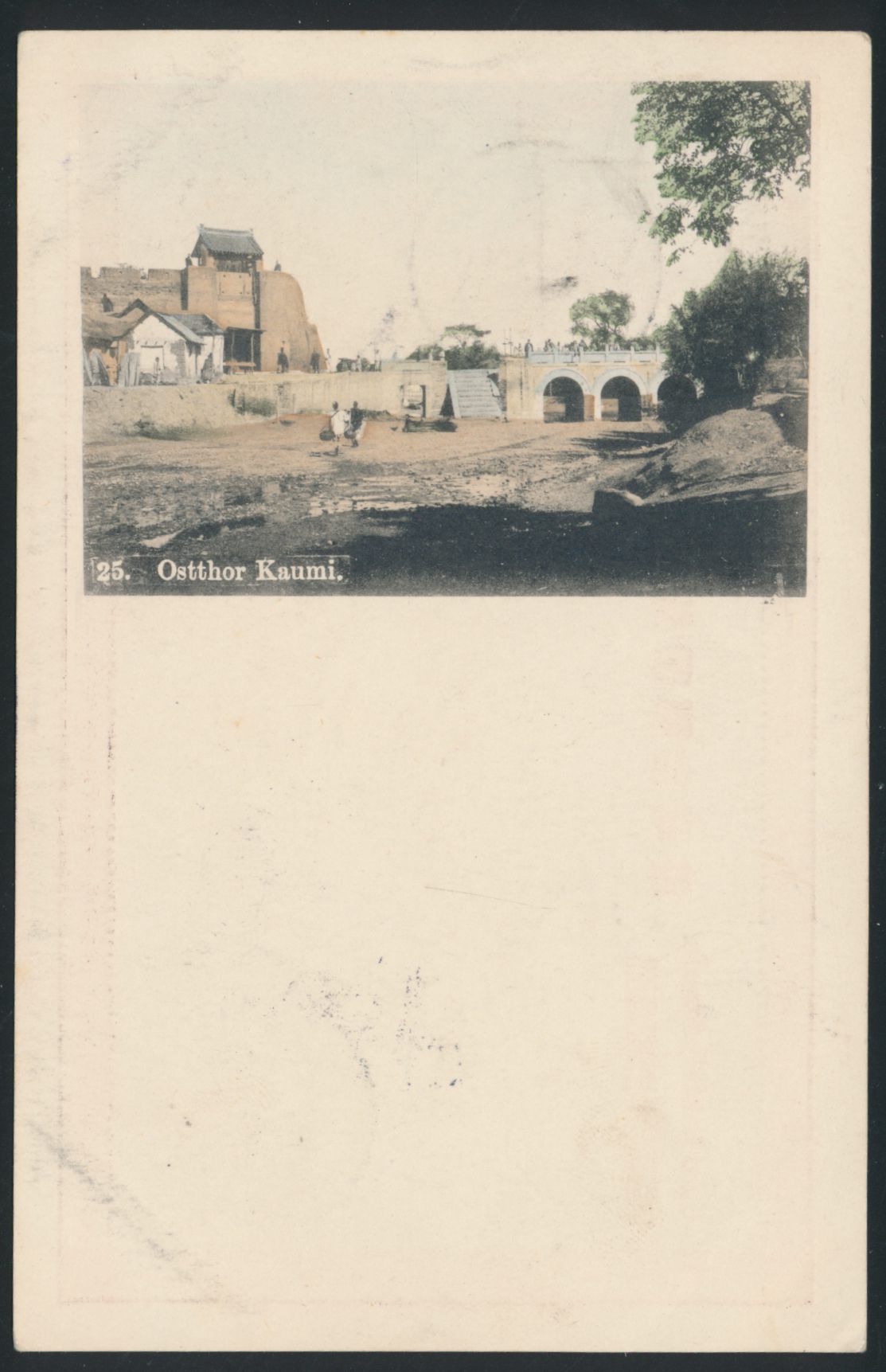 kolorierte Ansichtskarte Ostthor Kaumi (Vordruck im Muster der japanischen Ganzsachen) , Frankatur 5 Pf., Stempel Tsingtau 2.11.03, nach Hamburg, Ankunftstempel 14.12.03