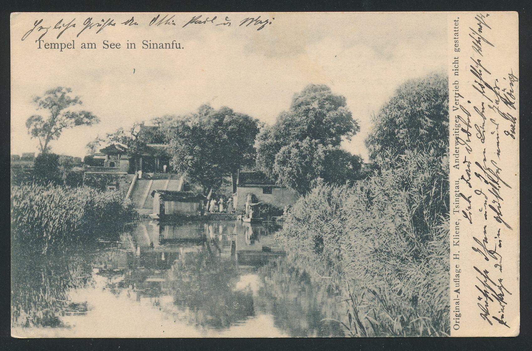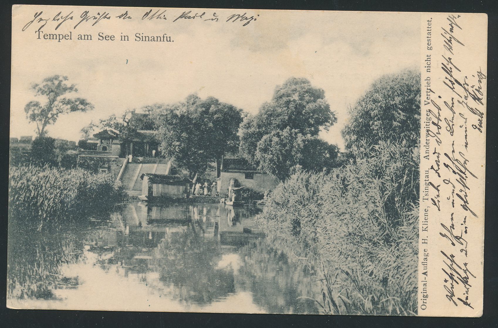 Ansichtskarte Tempel am See in Sinanfu, Verlag H. Kliene, Tsingtau, Frankatur 5 Pf., Stempel Tsingtau 4.11.03, nach Cöthen, Ankunftstempel 18.12.03, Bedarf