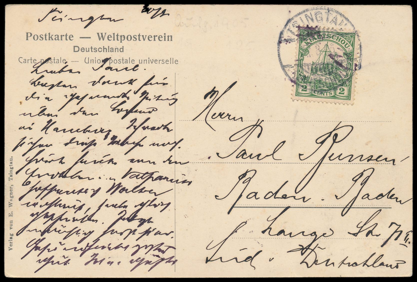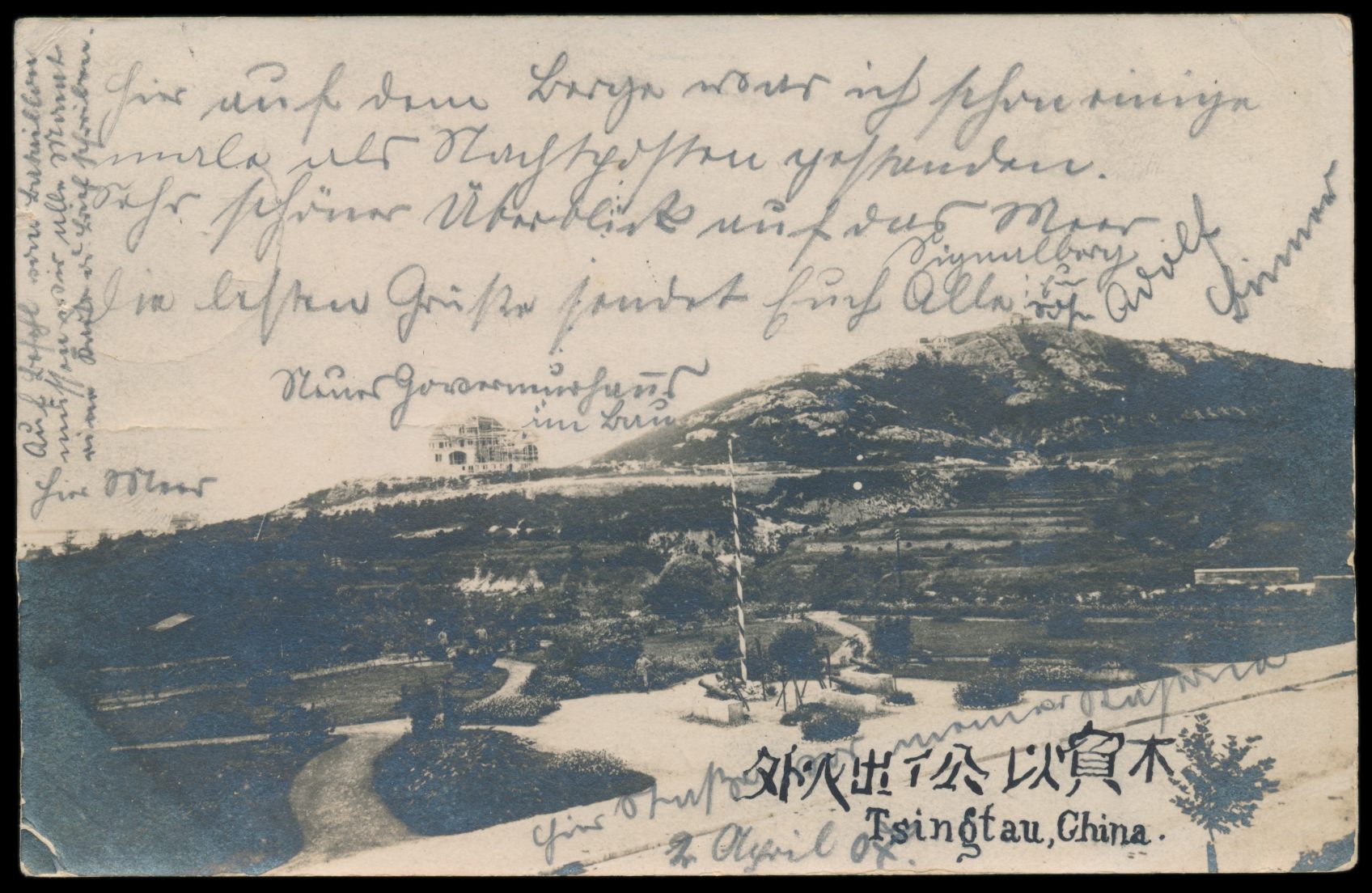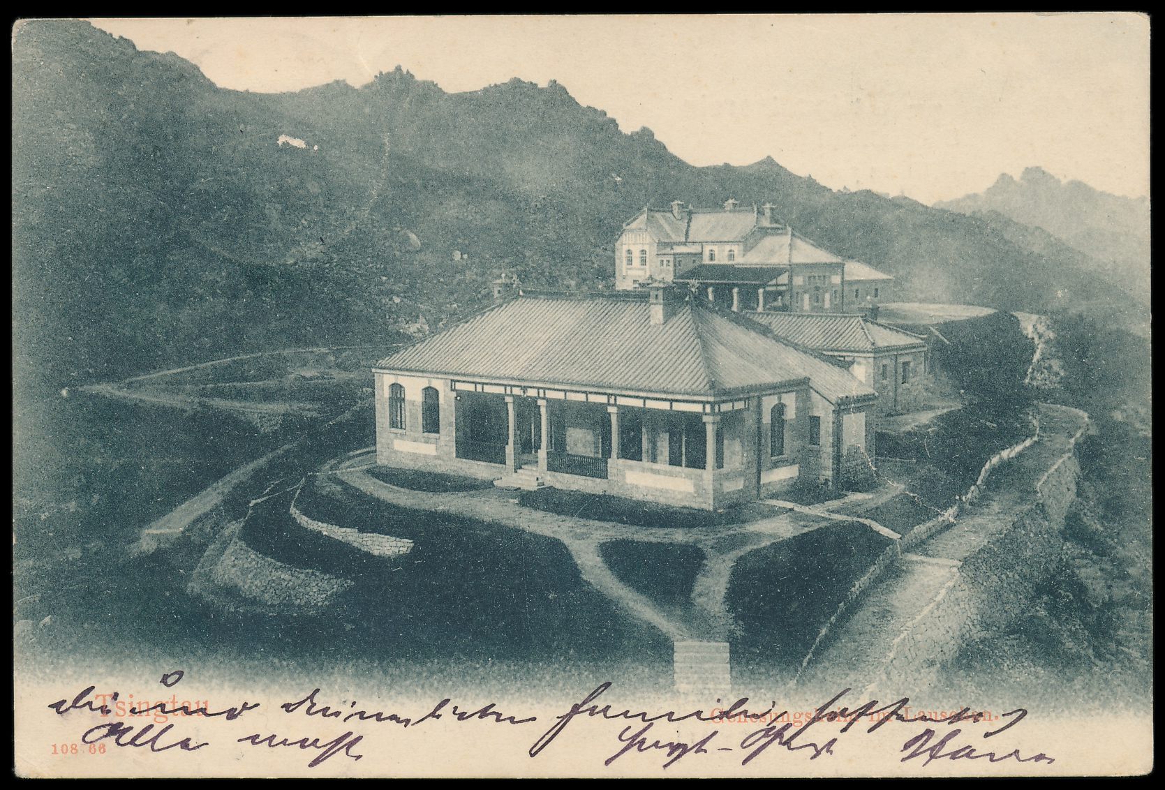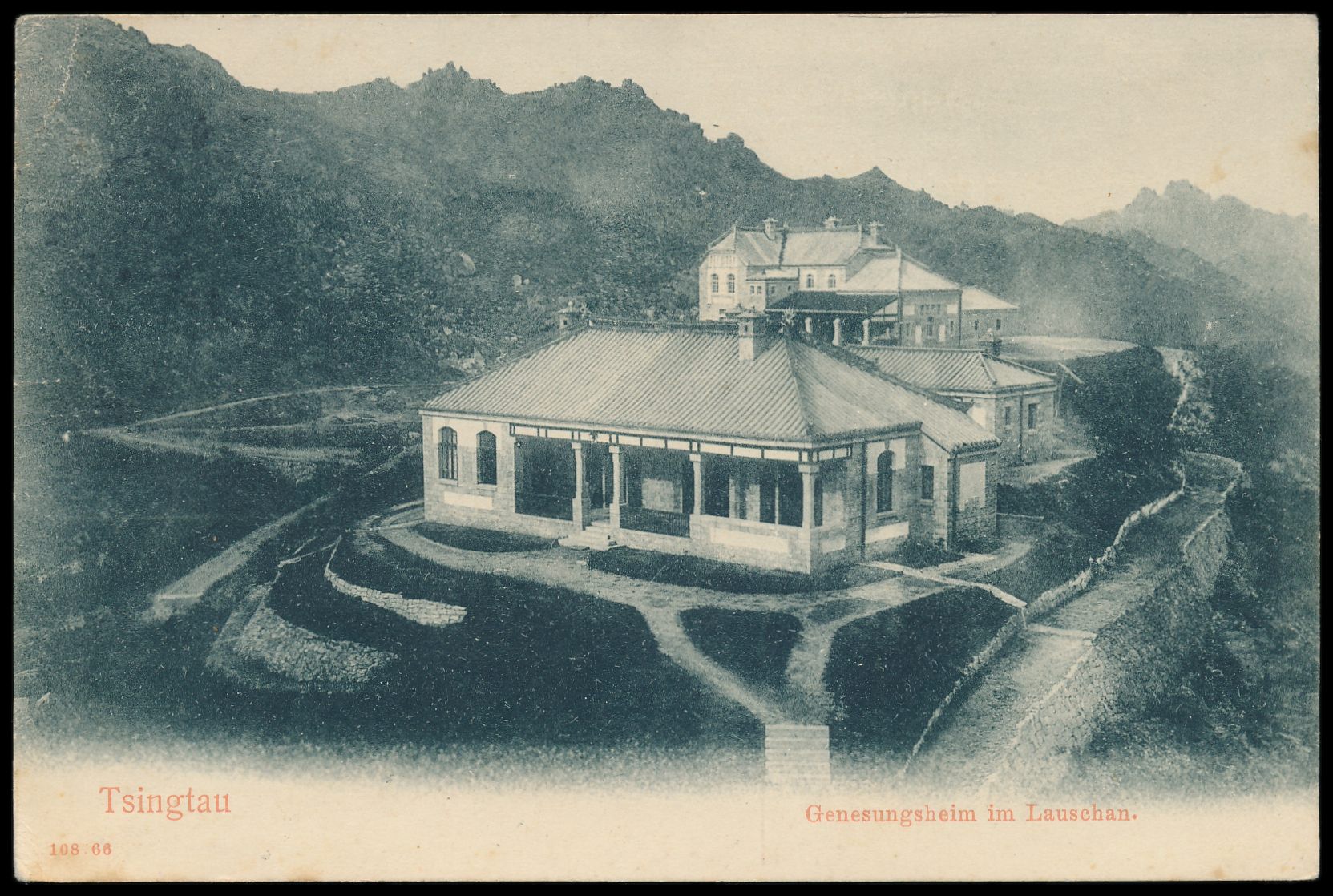 Ansichtskarte Genesungsheim im Lauschan, Verlag von E. Wagner, Tsingtau, Frankatur 2 C. (Tintenflecke), Gitterstempel Tsingtau c 22.8.1906, nach Baden-Baden, Bedarf