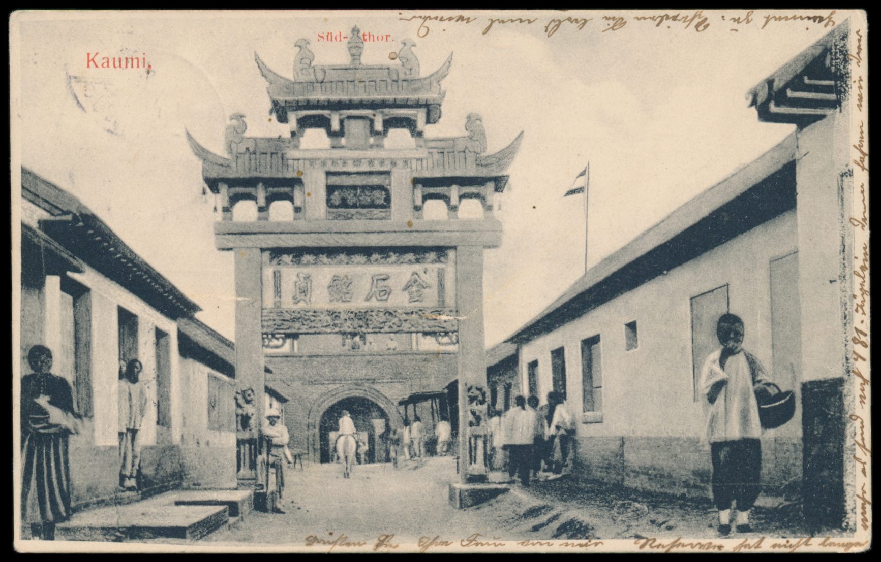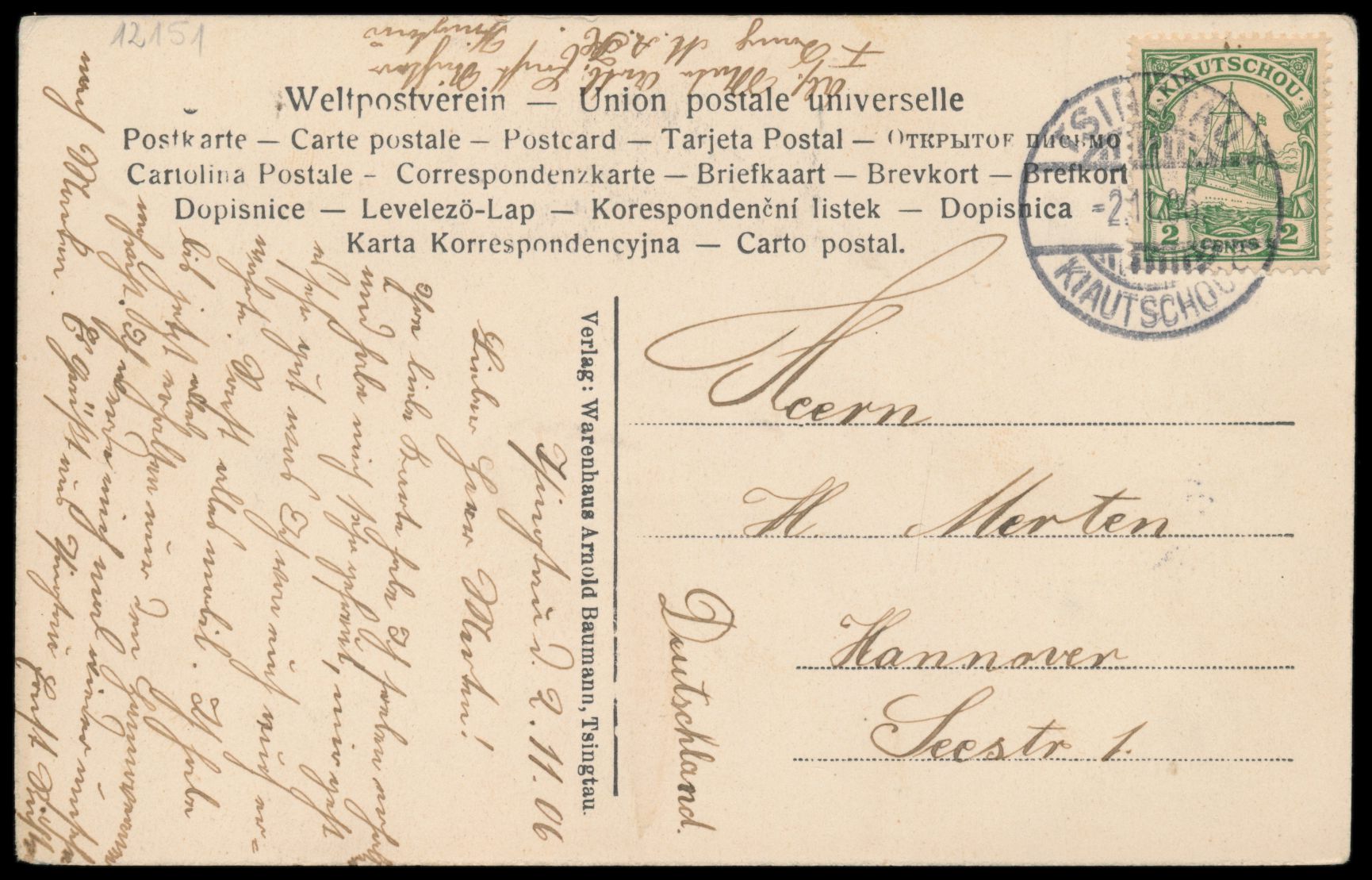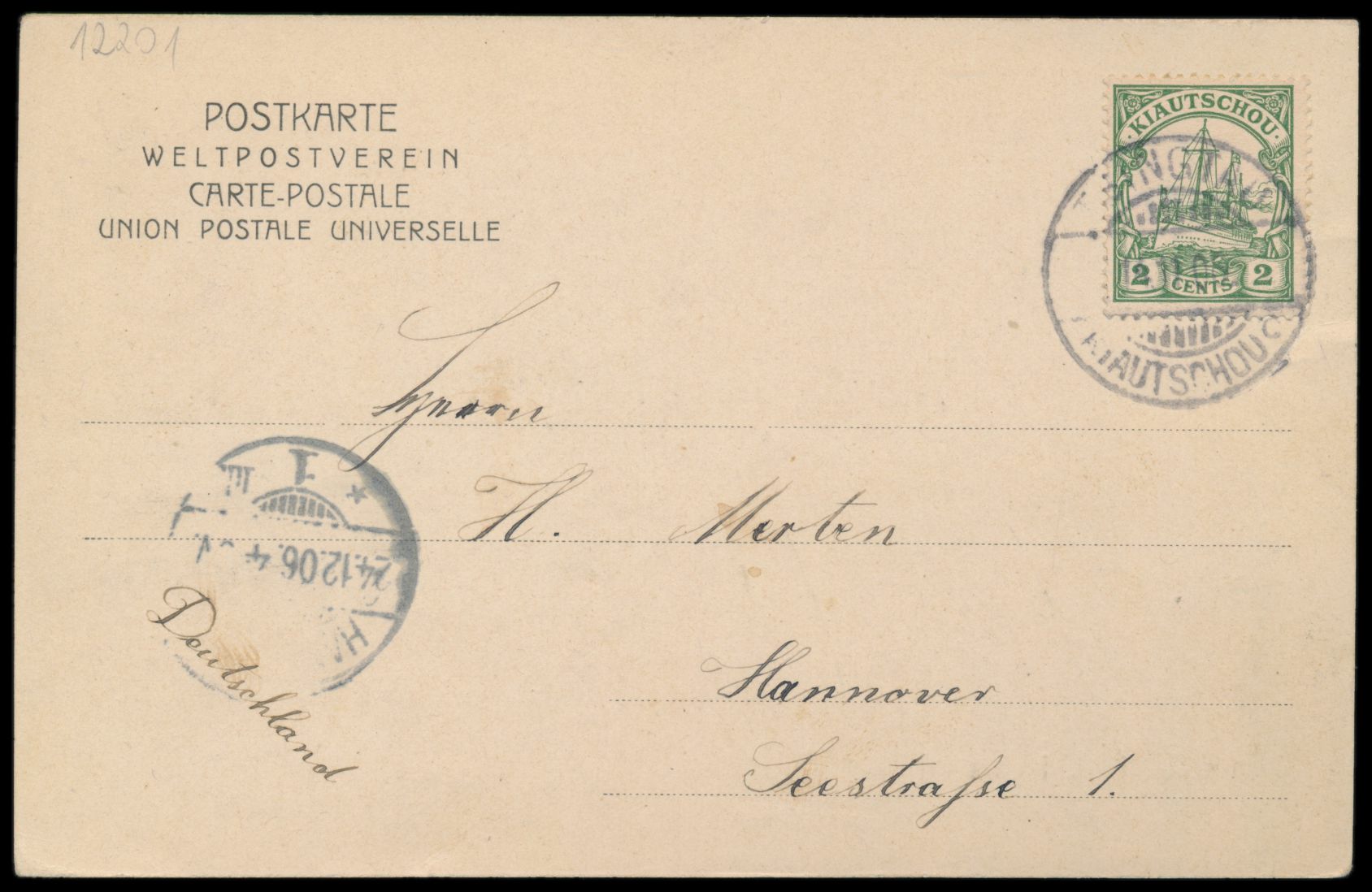 Ansichtskarte Kaumi - Süd-Thor, Verlag Warenhaus Arnold Baumann, Tsingtau, Frankatur 2 C., Gitterstempel Tsingtau c 2.11.06 ohne Stundenangabe, nach Hannover, Bedarf