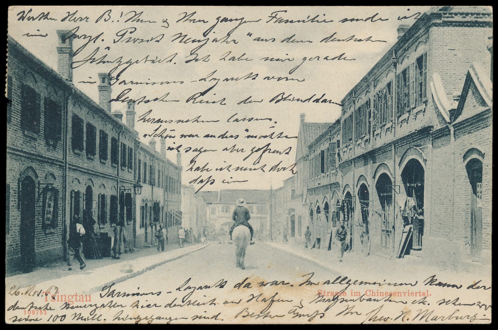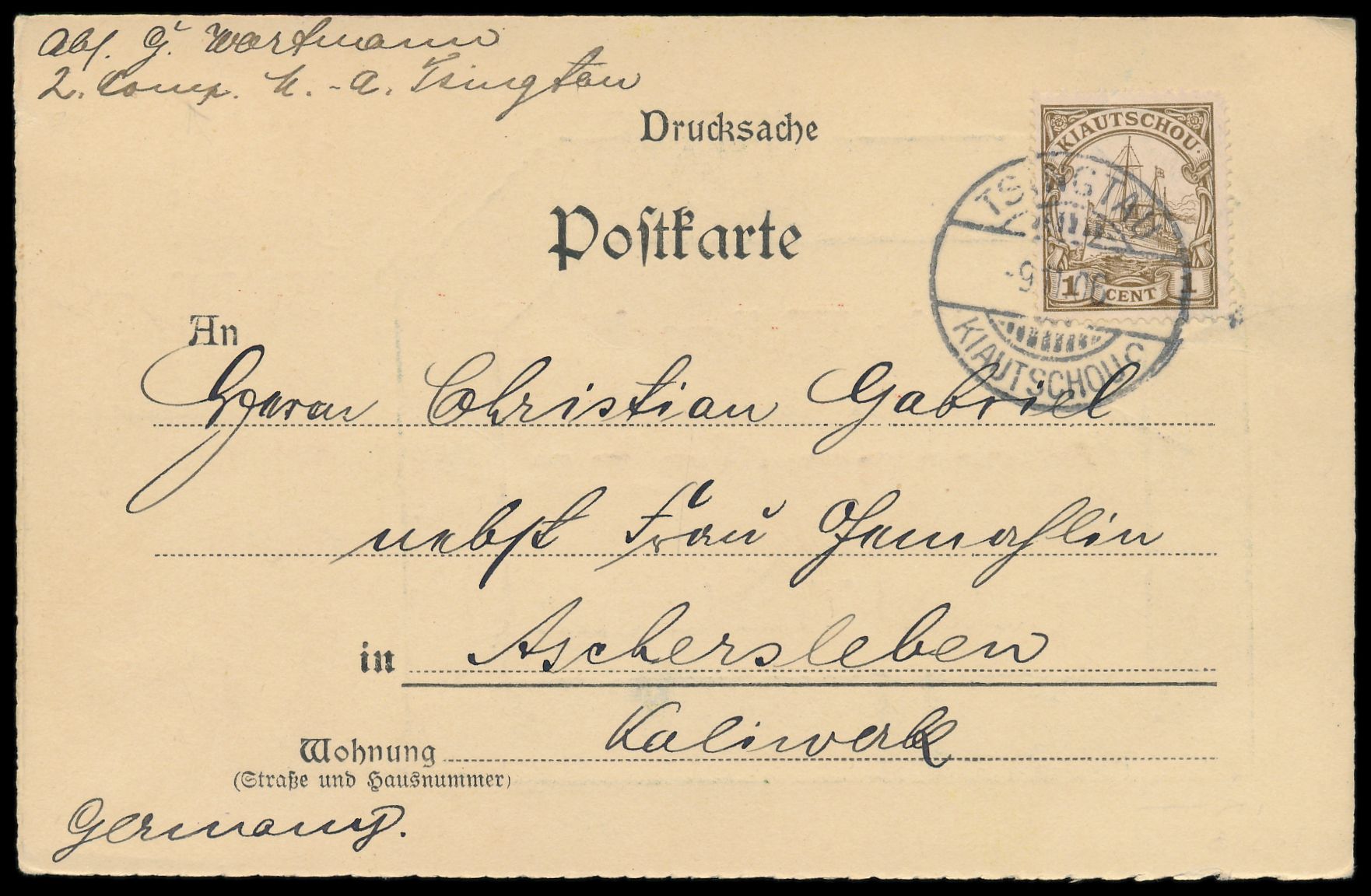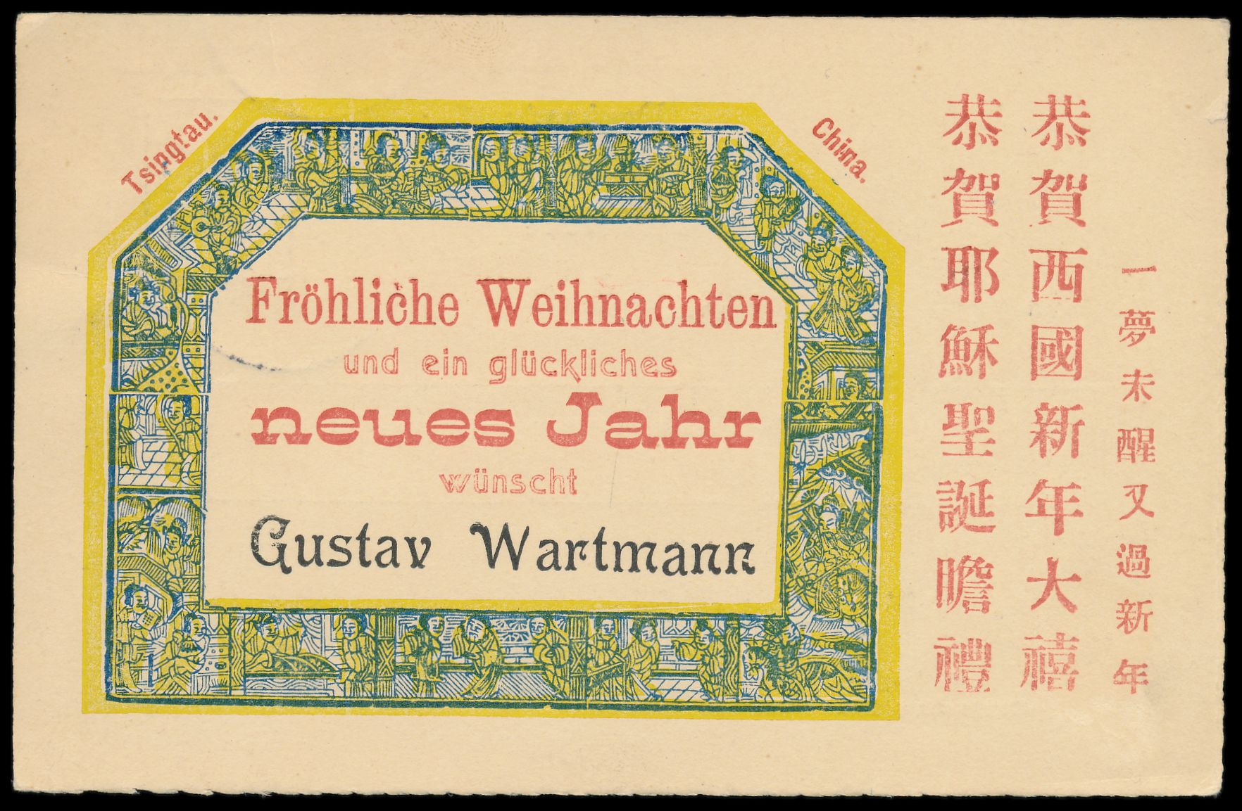 dekorative zweisprachige Weihnachtskarte mit Zierahmen aus chinesischen Alltagsszenen und extra eingedrucktem Namen des Absenders "Gustav Wartmann", Frankatur 1 C., Gitterstempel Tsingtau c 9.11.06 ohne Stundenangabe, als Drucksache nach Aschersleben