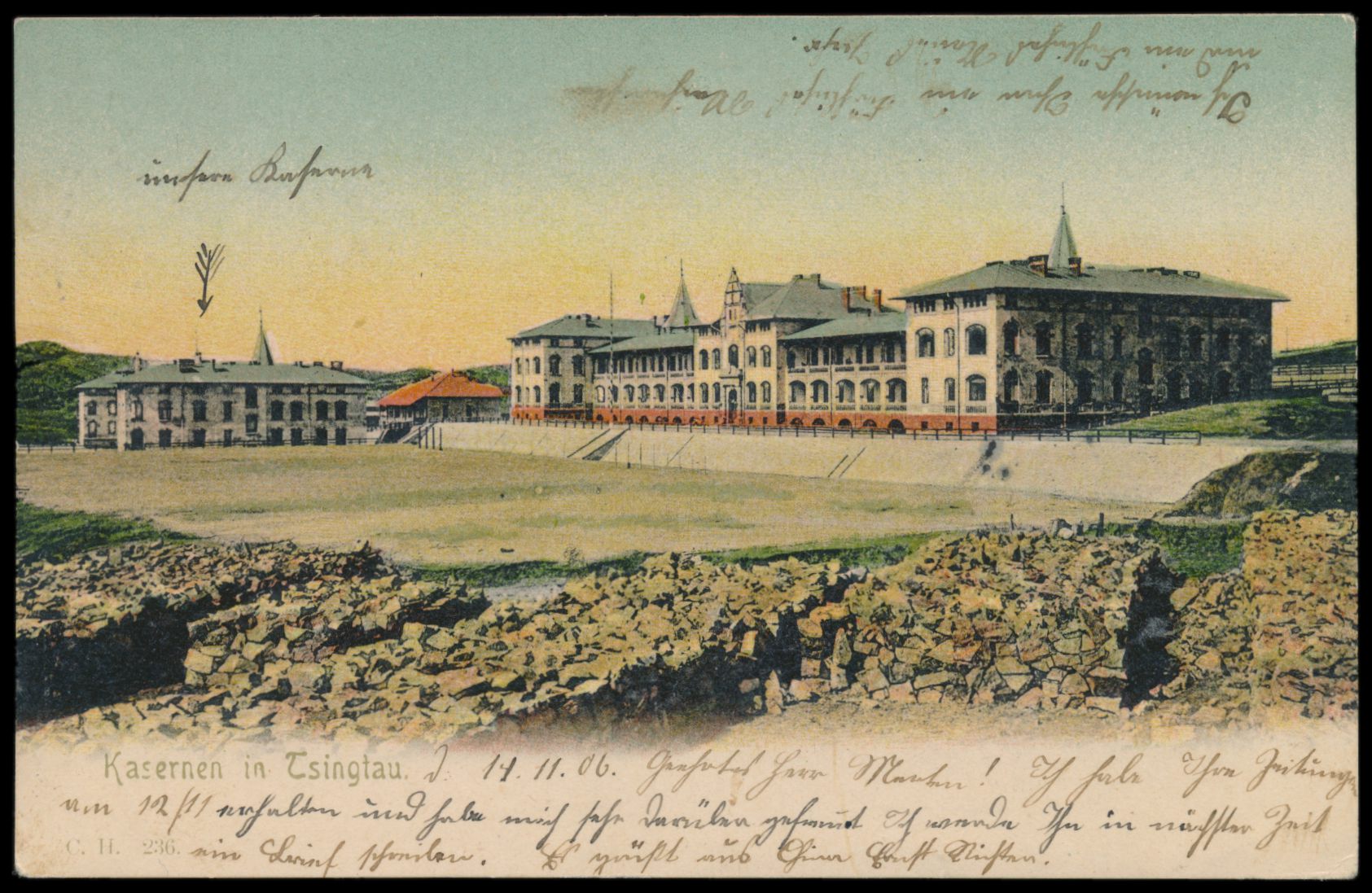 mehrfarbige Ansichtskarte Kasernen in Tsingtau, ohne Verlagangabe, Frankatur 2 C., Gitterstempel Tsingtau c 14.11.06 (ohne Stundenangabe), nach Hannover, Ankunftstempel 24.12.06, Bedarf