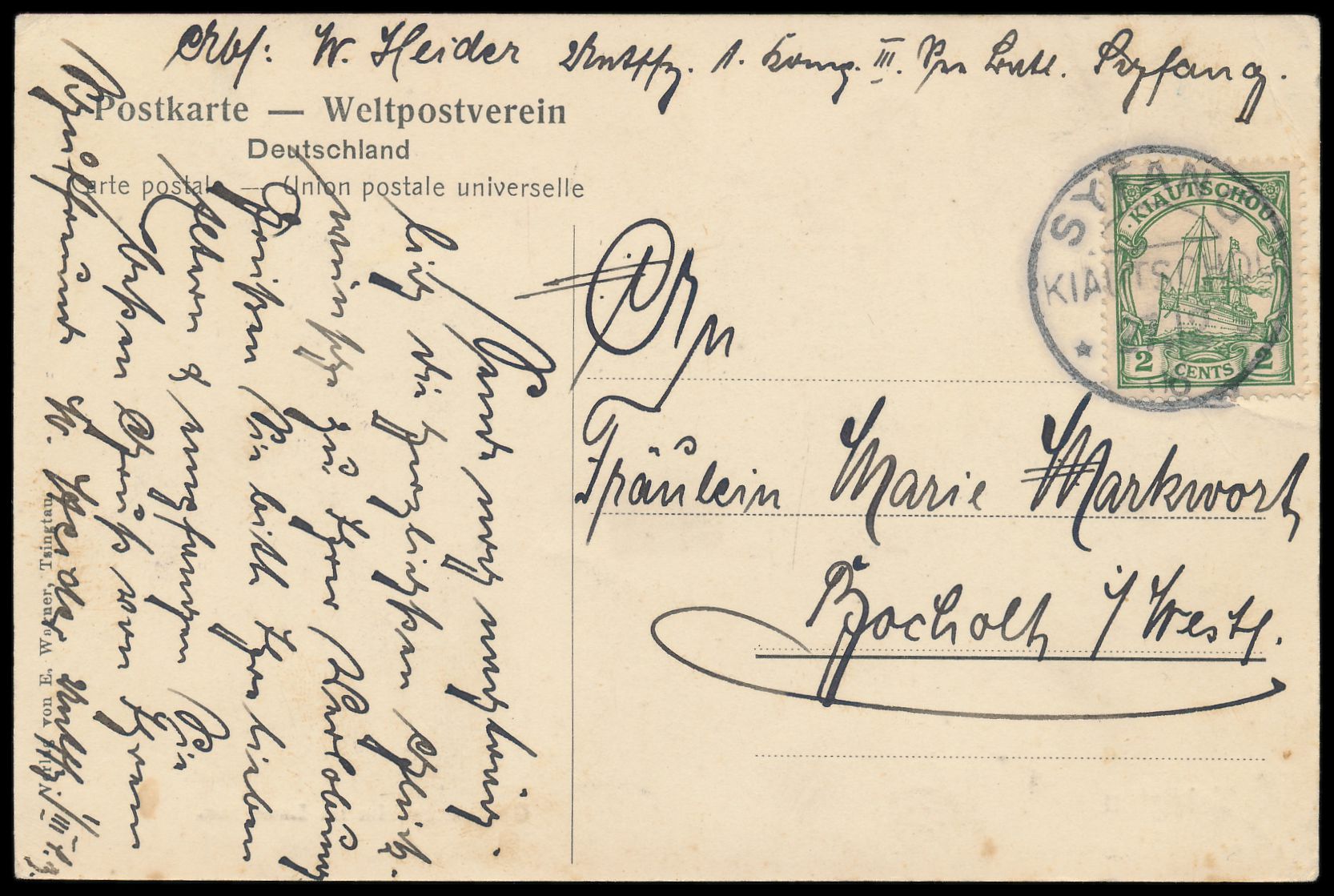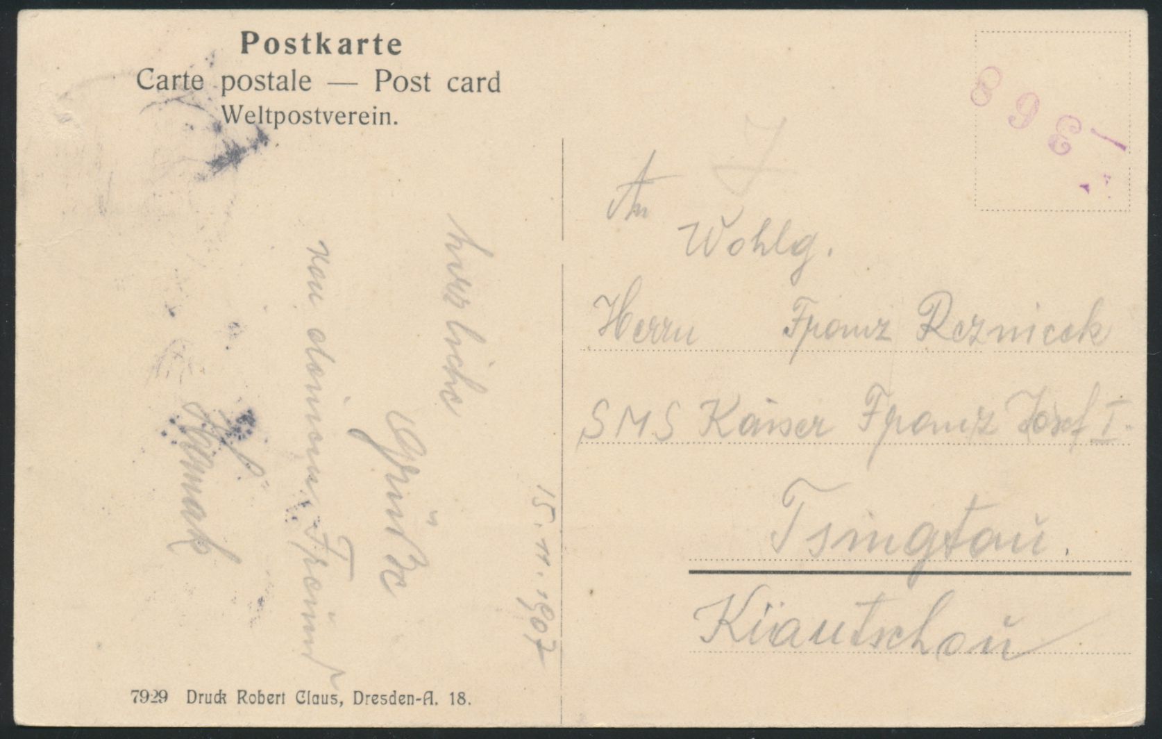 2 C. bildseitig auf Panorama-Ansichtskarte, Verlag Robert Claus, Dresden, Stempel Tsingtau 15.11.07, als Ortskarte an einen Matrosen des österreichischem S.M.S. Kaiser Franz Josef I.