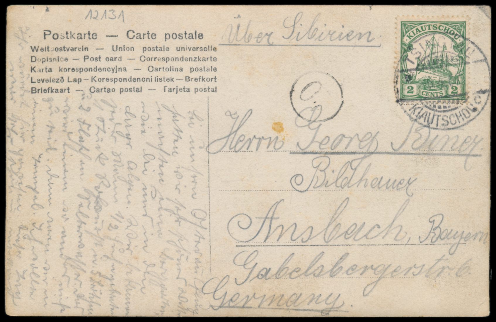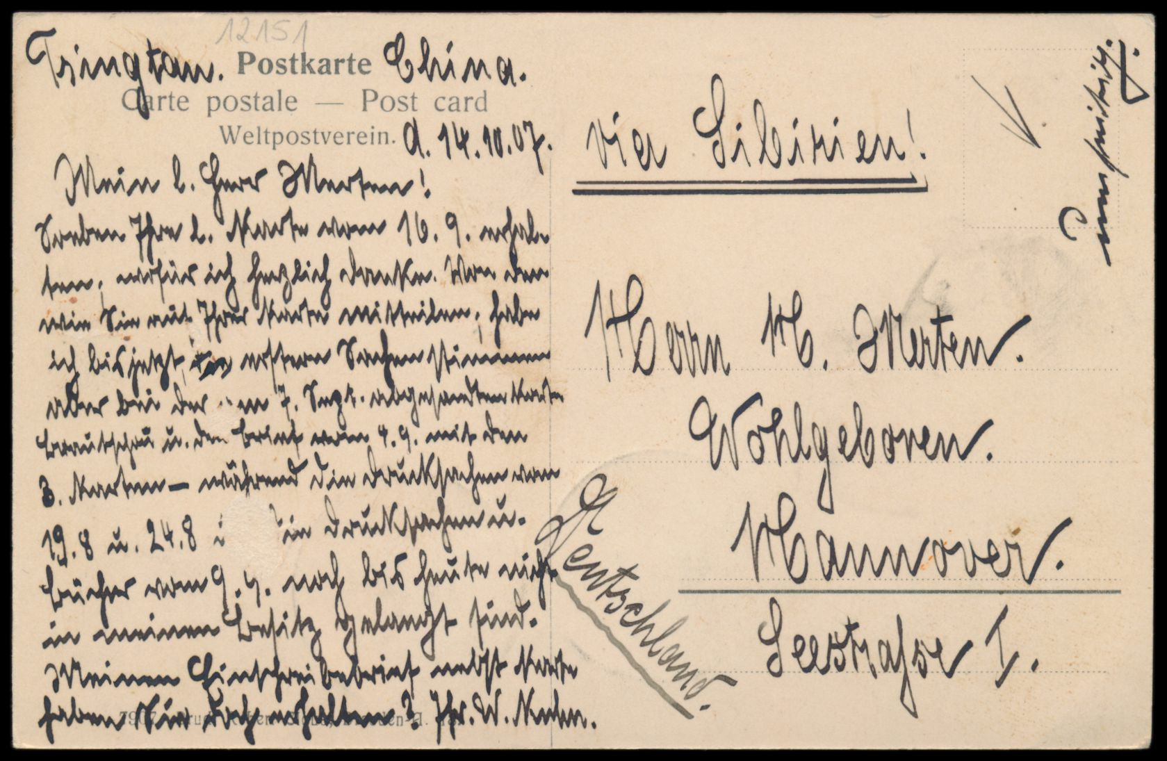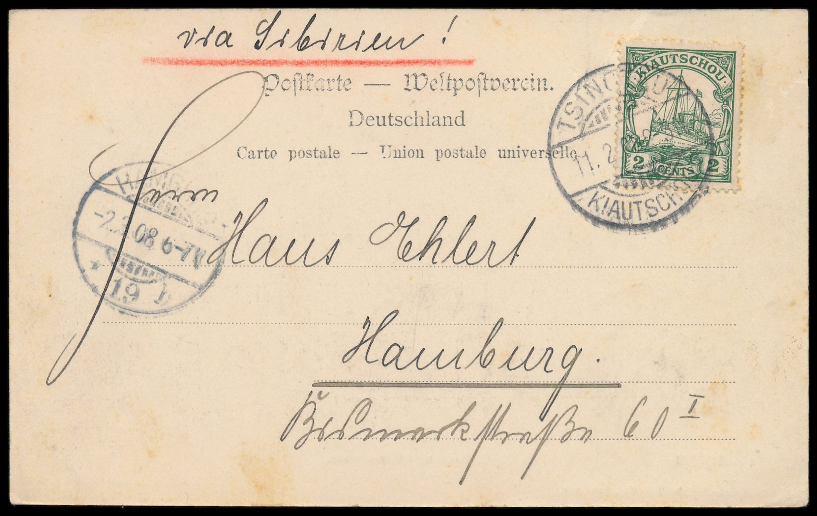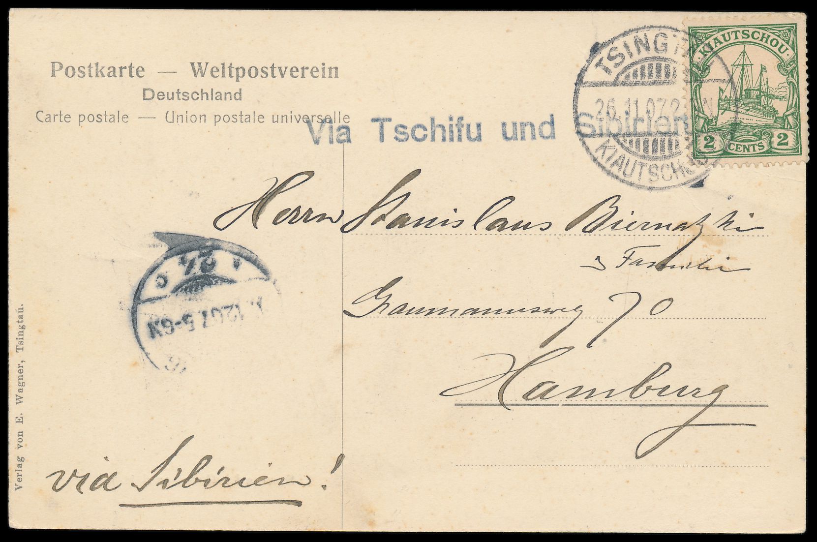 2 C. auf Ansichtskarte Tsingtau - Strasse im Chinesenviertel, Verlag von E. Wagner, Tsingtau, Gitterstempel Tsingtau c 26.11.07, nach Hamburg, Leitstempel "Via Tschifu und Sibirien", Bedarf