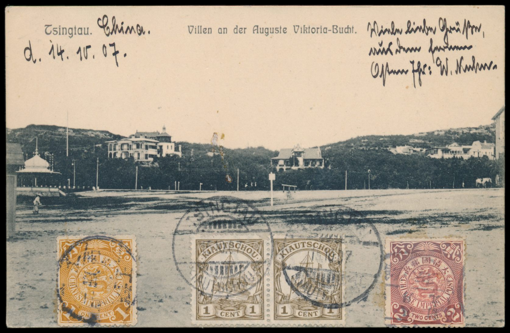 Ansichtskarte Tsingtau - Villen an der Auguste Viktoria-Bucht, ohne Verlagangabe, bildseitig zwei chinesische Marken als Dekoration und bildseitige Frankatur 2 x 1 C., Gitterstempel Tsingtau c 15.10.07 (ohne Stundenangabe), nach Hannover, Bedarf