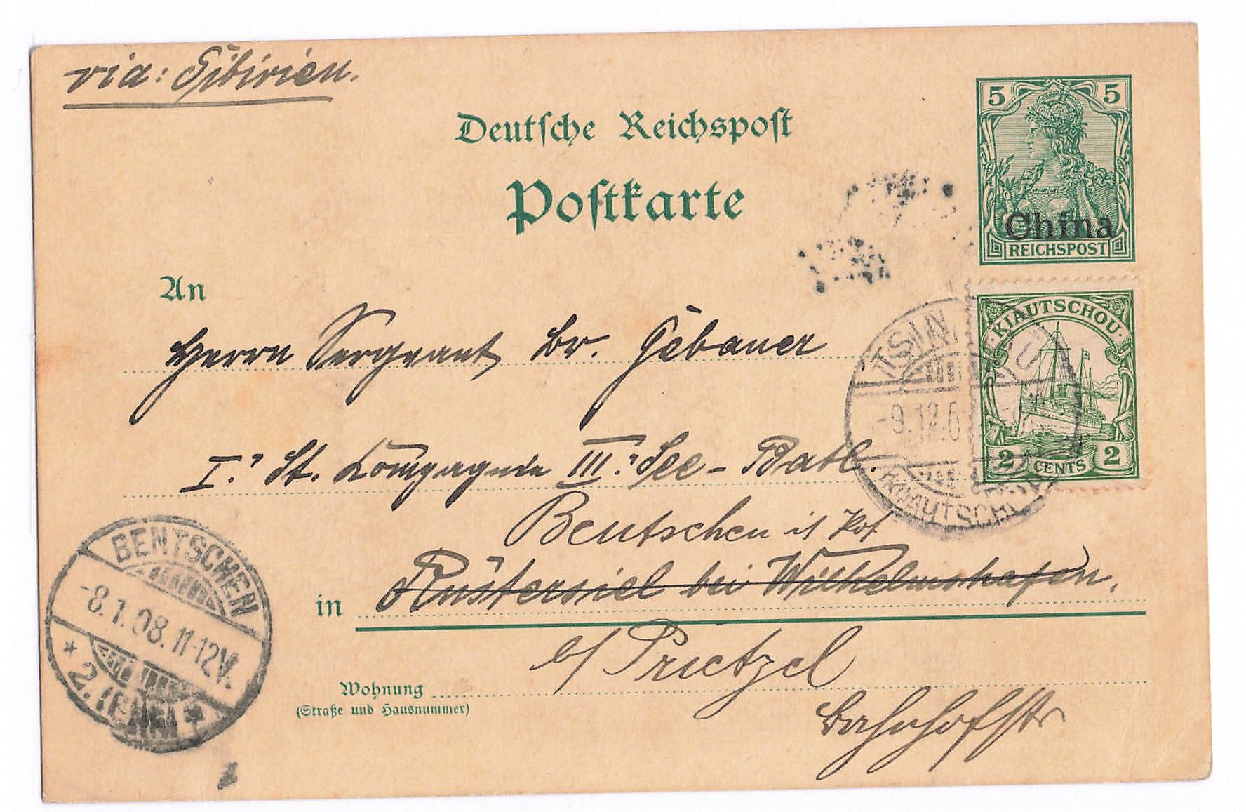 2 C. auf ungültiger Ganzsache der Dt. Post in China 5 Pf., Gitterstempel Tsingtau c 9.12.07, nach Rüstersiel, nachgesandt nach Ventschen, Ankunftstempel 8.1.08, Bedarf