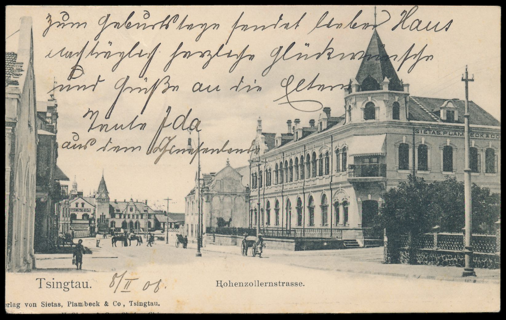 Ansichtskarte Tsingtau - Hohenzollernstrasse (mit Geschäftshaus von Sietas, Plambeck & Co.) , Verlag von Sietas, Plambeck & Co, Frankatur 2 C., Gitterstempel Tsingtau 11.2.08, nach Hamburg, Ankunftstempel 2.3.08, Bedarf