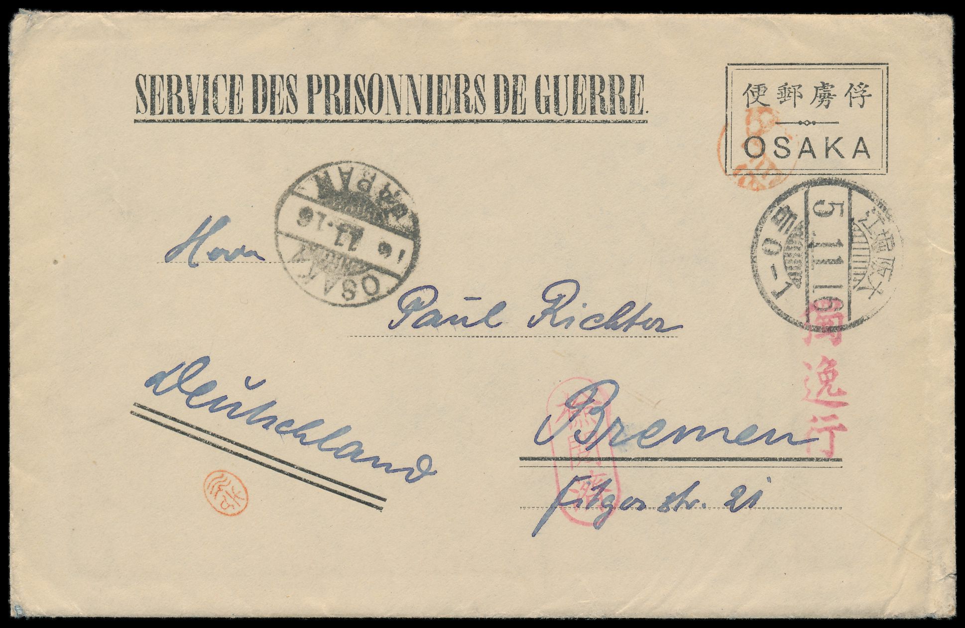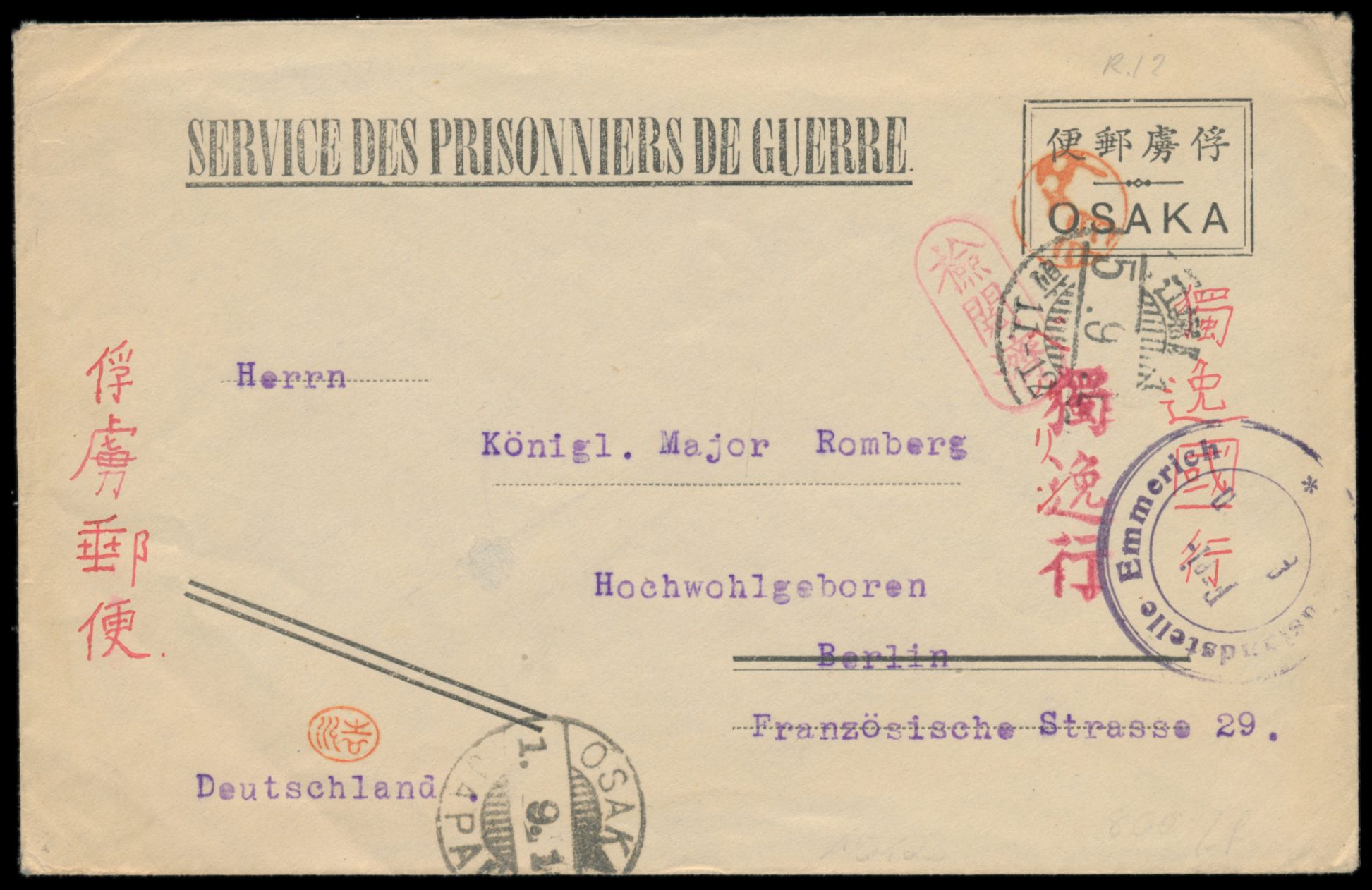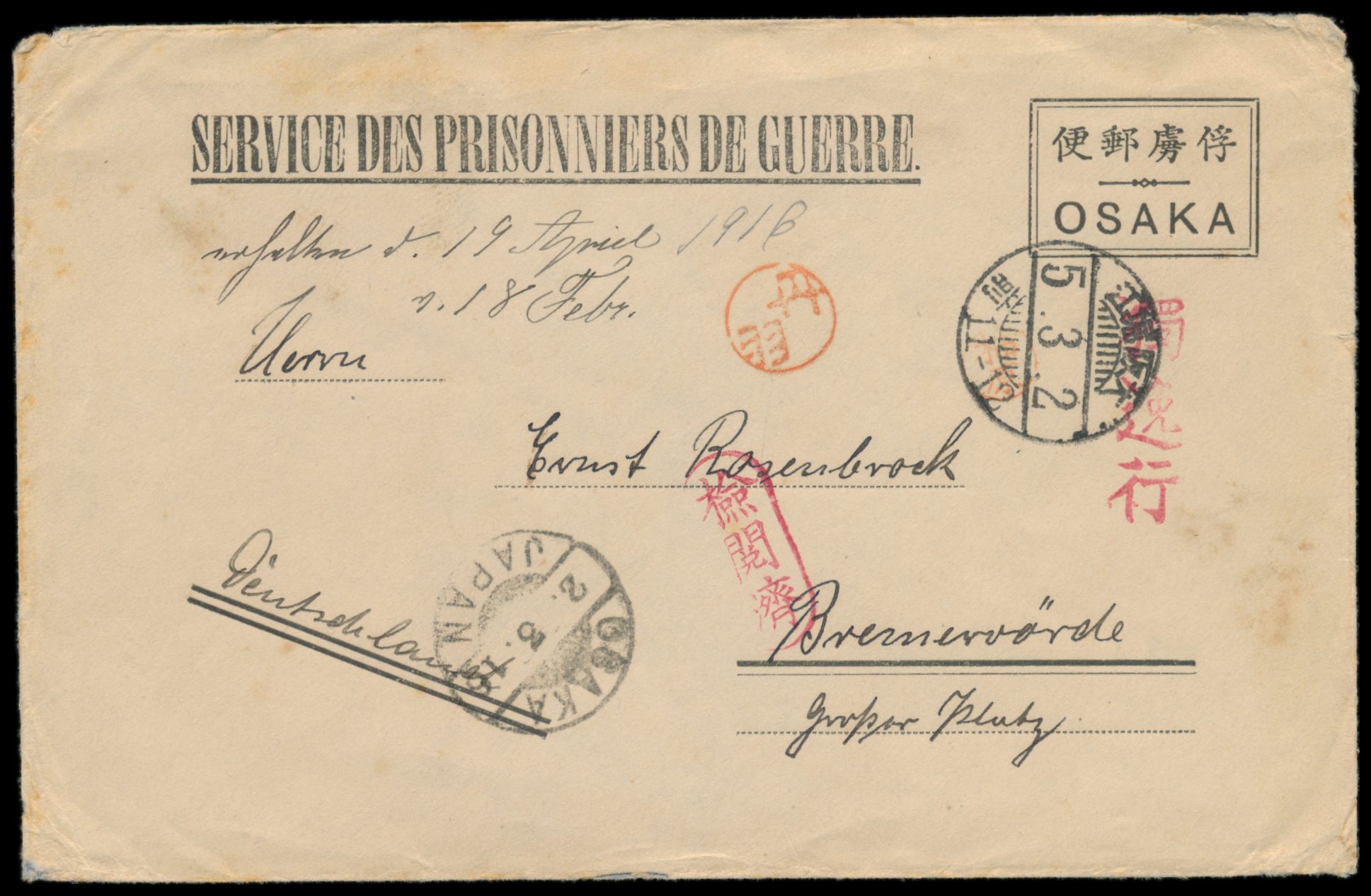 Osaka, Ganzsachenumschlag (Type II) nach Berlin, roter Einzelstempel Kenetsuzumi und roter Leitstempel Doitsu, zwei orangene Han Niwa und Yoshikawa, Poststempel Osaka-Horie und Osaka / Japan 1.9.1916, deutsche Eingangszensur Emmerich. Absender ist Marine-Zahlmeister Heinrich Stern, bei Mobilmachung an Bord Kanonenboot S.M.S. Iltis, später in der Marine-Kompanie