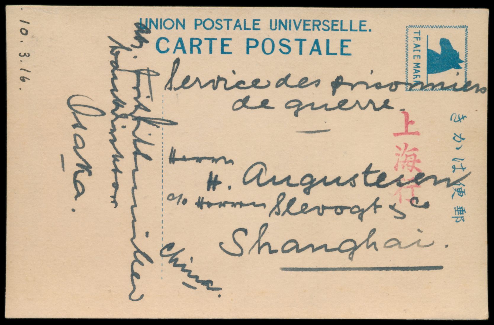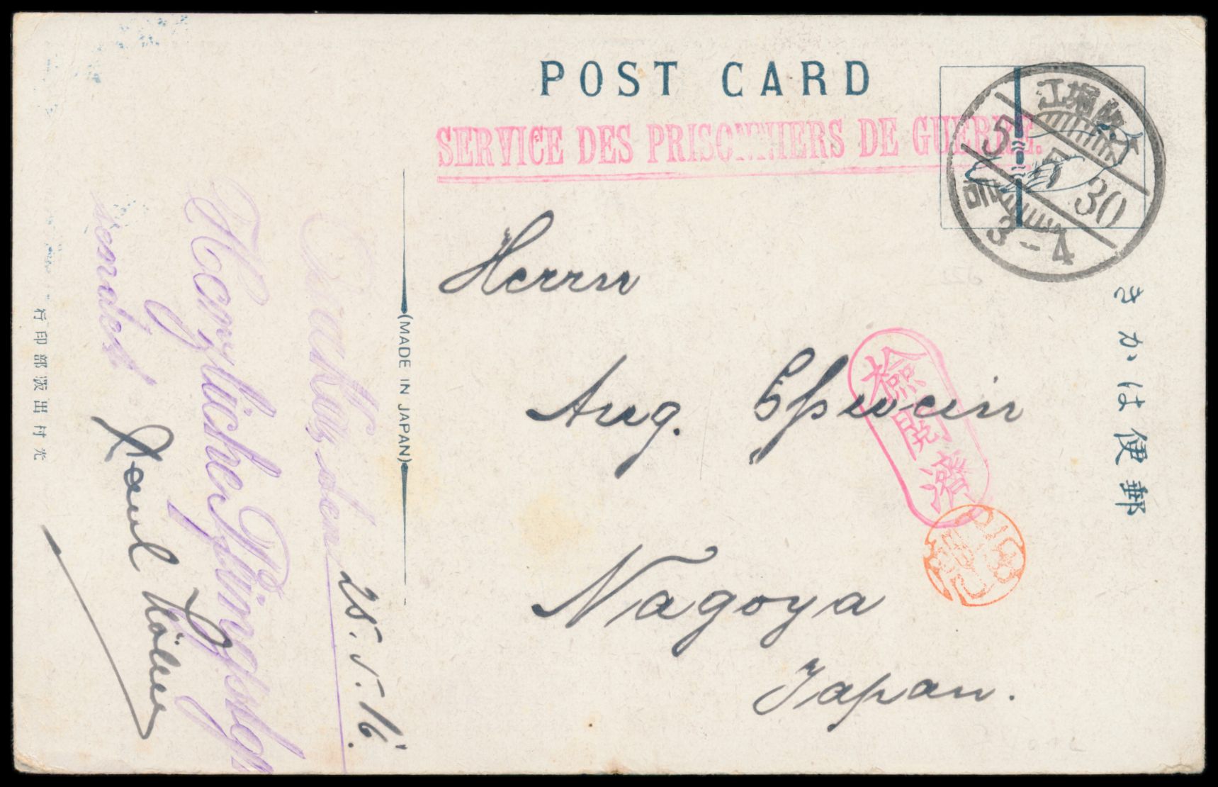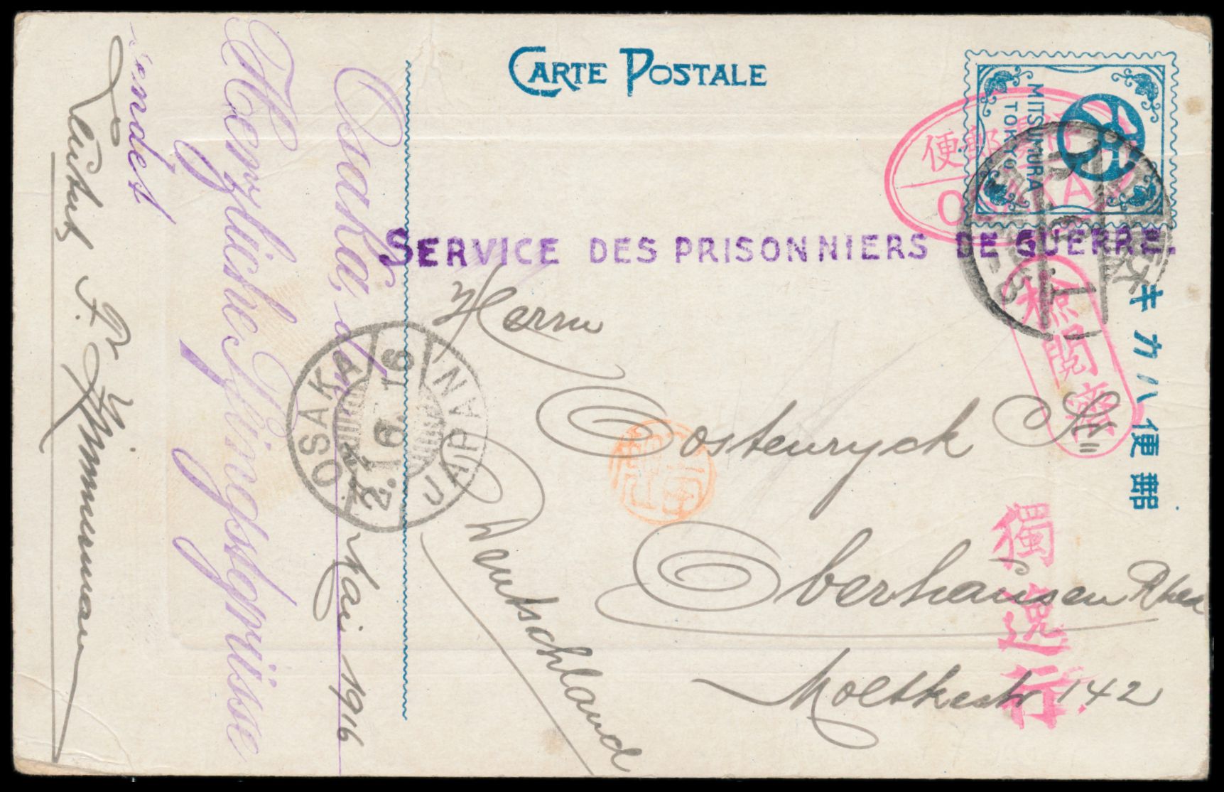 Osaka, Ganzsachenumschlag (Type II) nach Berlin, roter Einzelstempel Kenetsuzumi und roter Leitstempel Doitsu, zwei orangene Han Niwa und Yoshikawa, Poststempel Osaka-Horie und Osaka / Japan 1.9.1916, deutsche Eingangszensur Emmerich. Absender ist Marine-Zahlmeister Heinrich Stern, bei Mobilmachung an Bord Kanonenboot S.M.S. Iltis, später in der Marine-Kompanie
