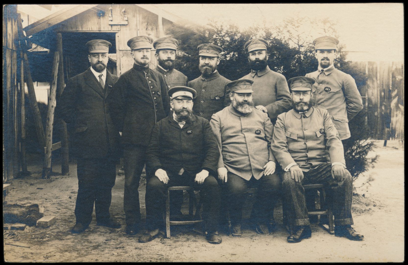 Osaka, Foto-Ansichtskarte (Gruppenaufnahme von 9 Personen) adressiert nach Shanghai, geschrieben am 10.3.1916, roter Leitstempel Shanghai, keine weiteren Stempel (im Umschlag befördert?). Absender ist Fritz Rittmüller, Direktor der Deutsch-Asiatischen Bank in Tsingtau