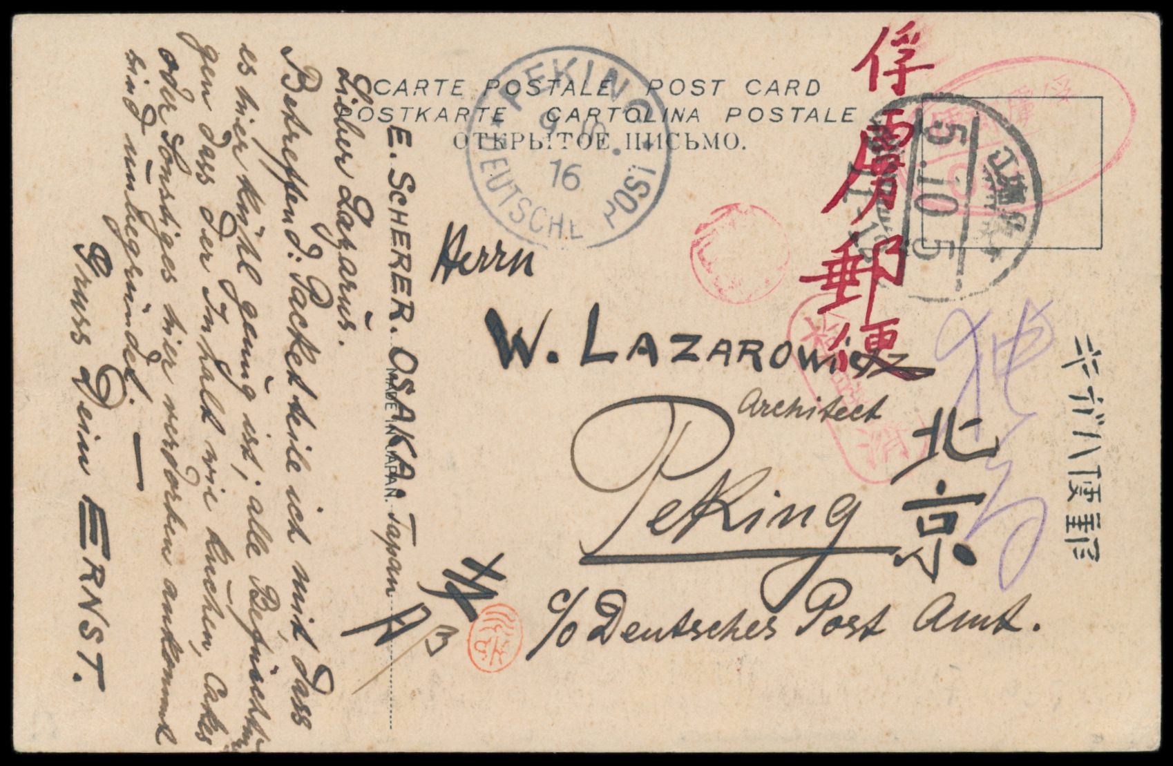 Osaka, japanische Ansichtskarte aus dem Kriegsgefangenenlager nach Peking, ovaler Lagerstempel, Einzelstempel Kenetsuzumi und Han Watato, alle in rot, dazu orangener Han Yoshikawa, Poststempel Osaka-Horie 5.10.1916, Ankunftstempel Peking / Deutsche Post 9.10.16