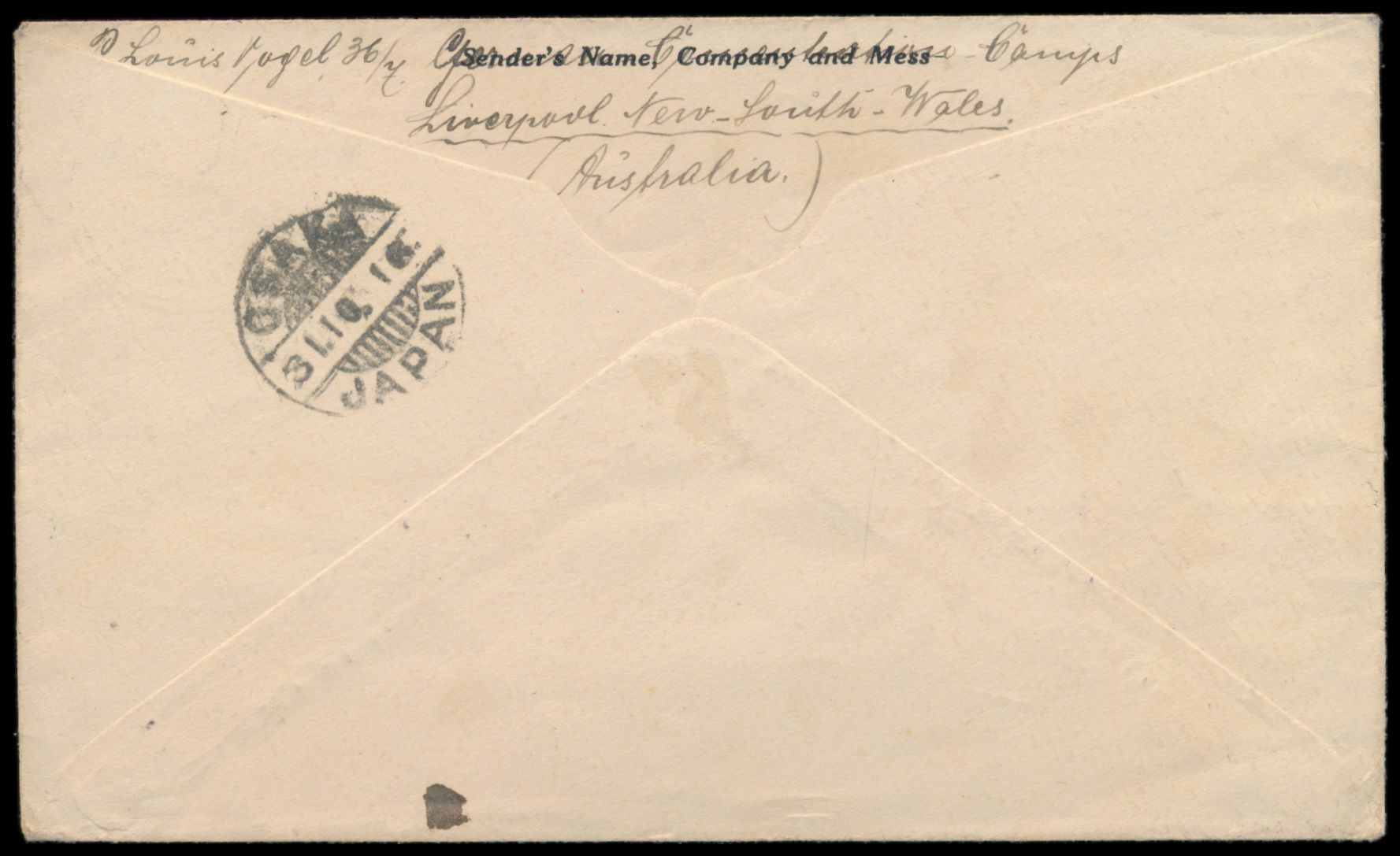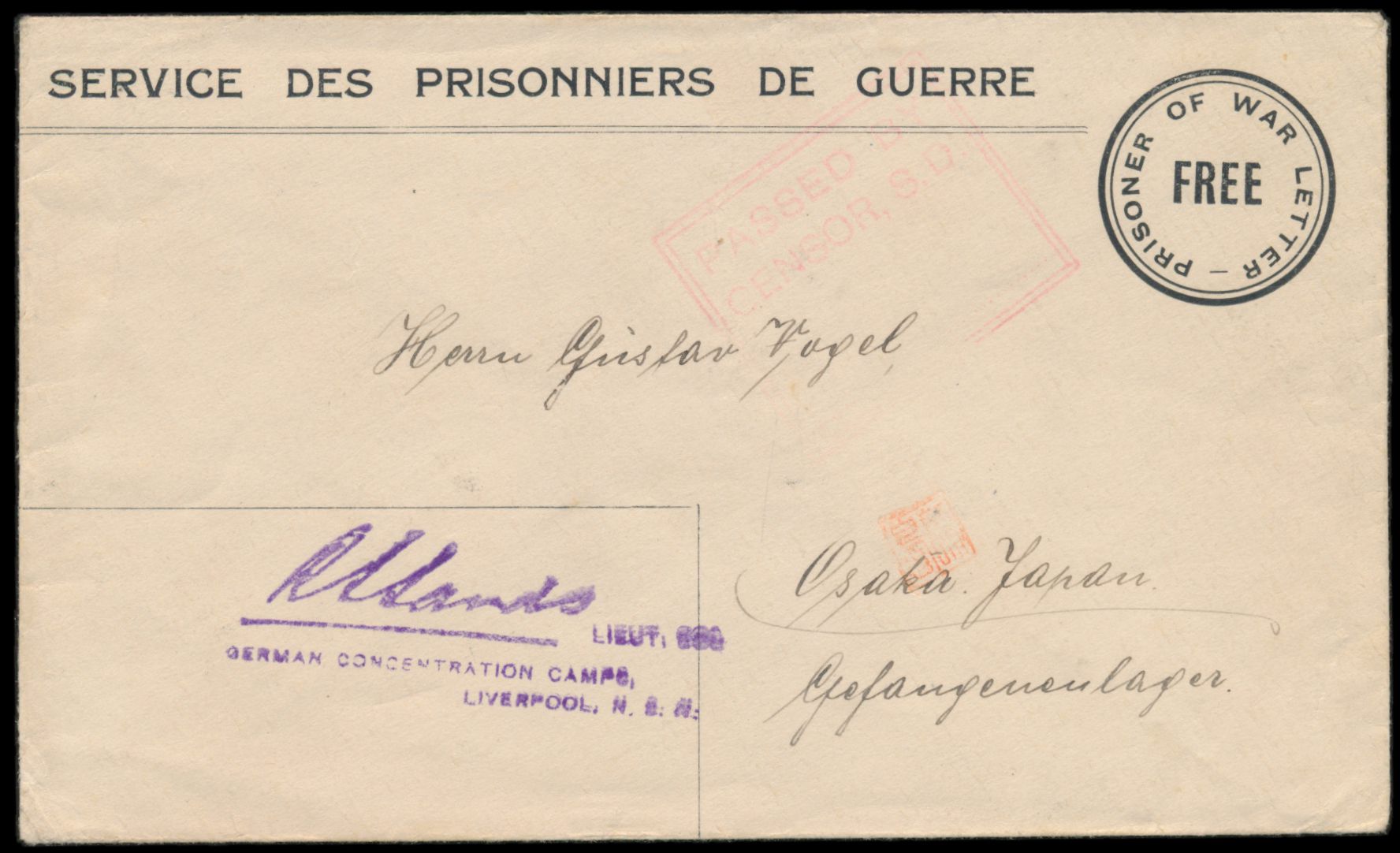 Liverpool, New South Wales (Australien), Vordruckumschlag "Prisoner of War letter / Free", violetter Stempel des Lagerkommandanten Sands und roter Rahmenstempel "Passed By censor, S.D.", Absender ist Matrosenartillerist Louis Vogel, in Tsingtau schwer verwundet und an die Briten übergeben, erst nach Hongkong und dann nach Australien verlegt, an Gustav Vogel (Bruder?) im japanischen Lager Osaka, Ankunftstempel Osaka / Japan 31.10.16 und orangener Han Iijima