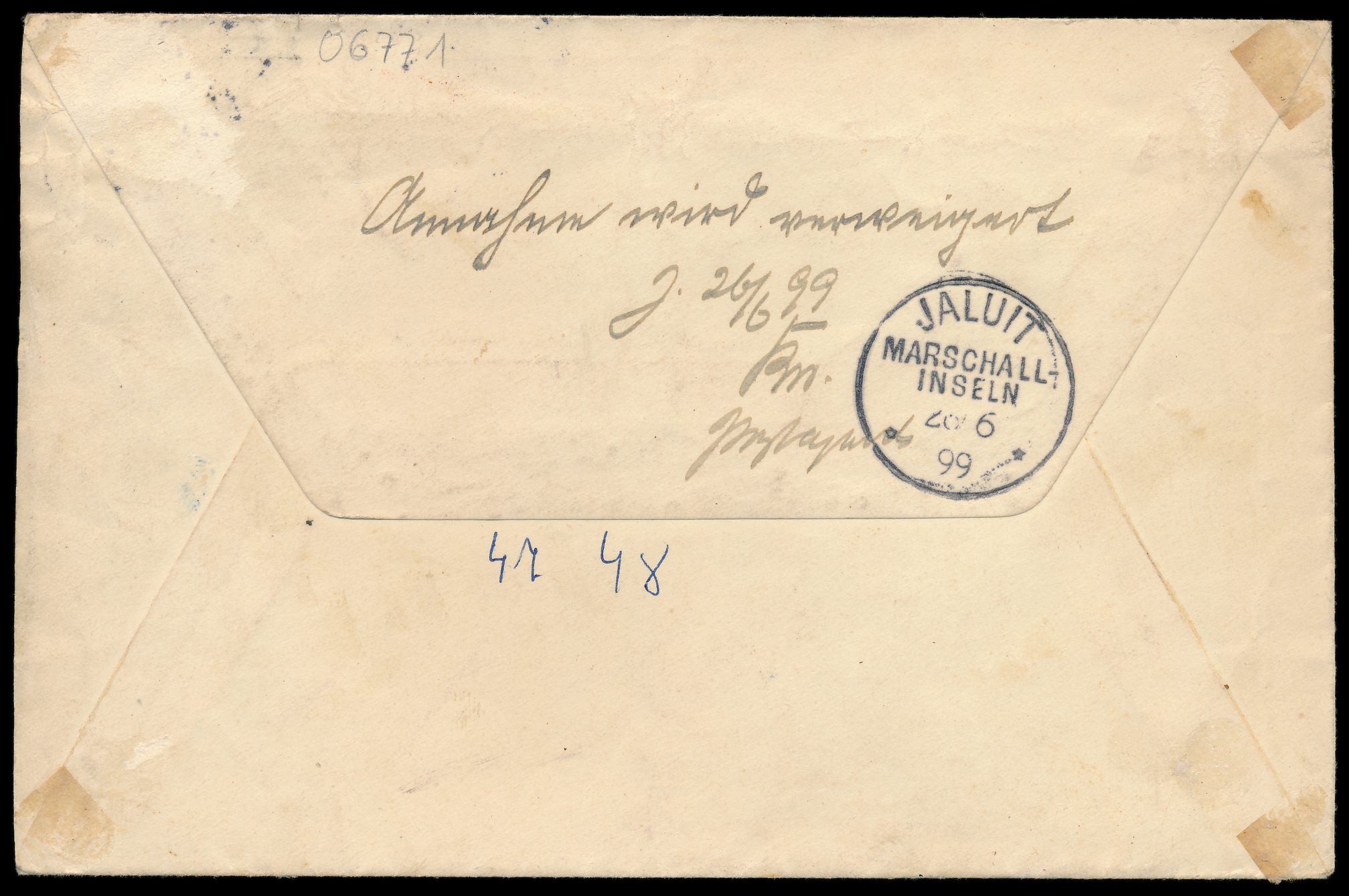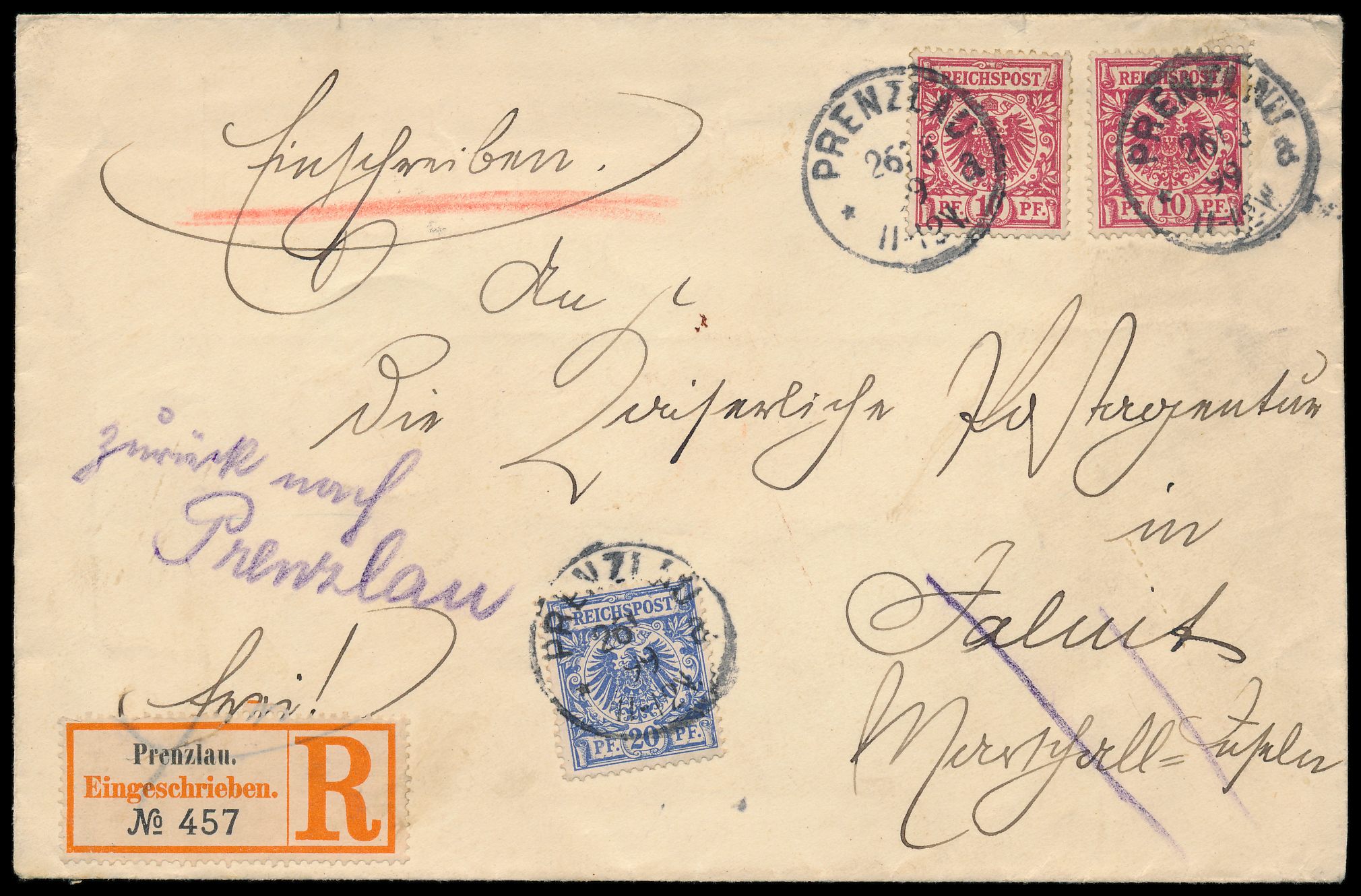 2 x 10 Pf. und 20 Pf. auf Einschreibbrief von Prenzlau 26.3.99 an die Kaiserliche Postagentur Jaluit, rückseitig handschriftlicher Vermerk "Annahme wird verweigert J. 26.6.99 ... Postagent" und Stempel Jaluit / Marschall-Inseln 26.6.99, vorderseitig handschriftlich "zurück nach Prenzlau"
