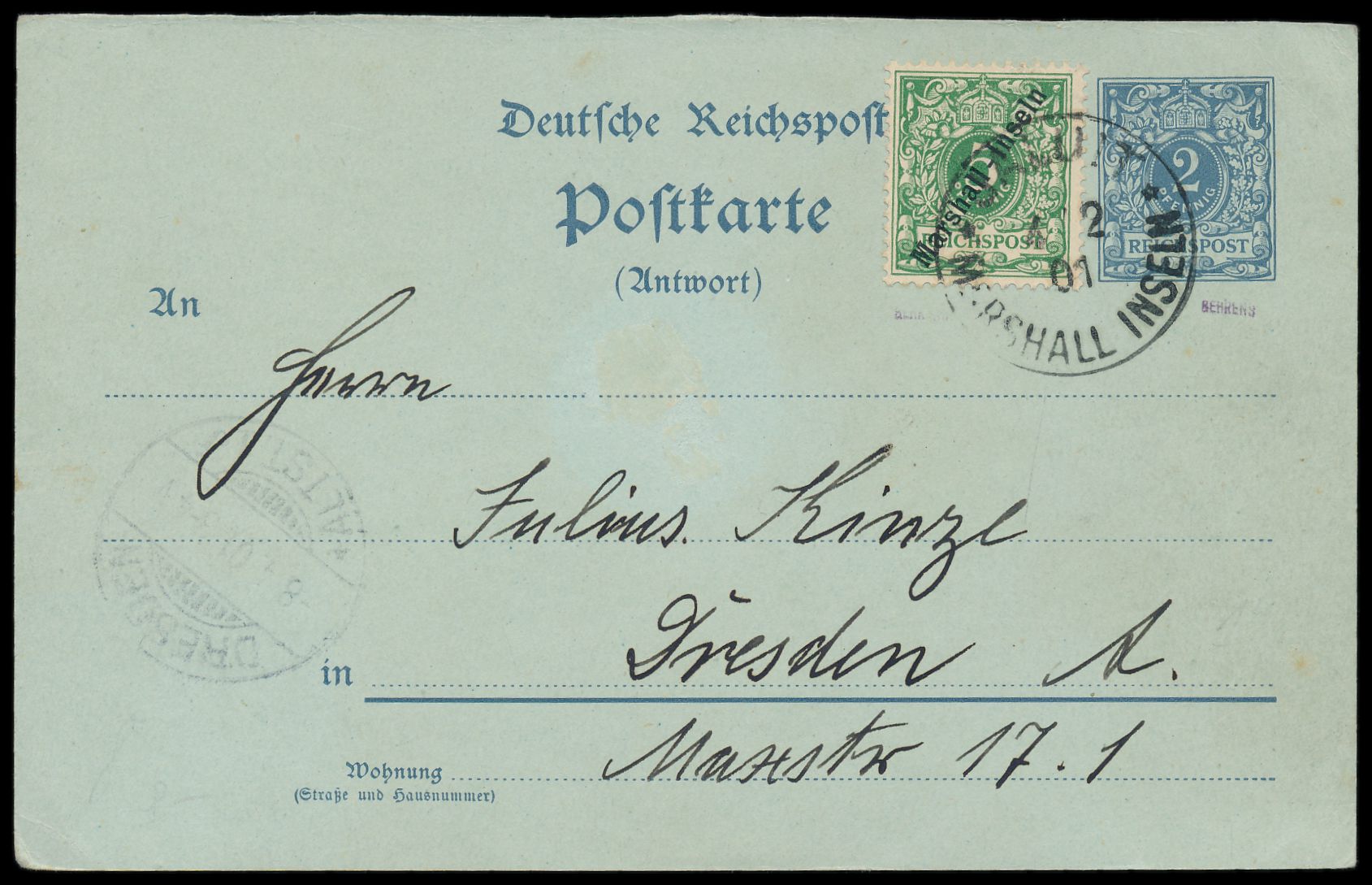 Ganzsachen-Antwortteil 2 Pf. mit Zusatzfrankatur 5 Pf., Stempel Jaluit 4.2.01, nach Dresden, Ankunftstempel 8.4.01, kein Text