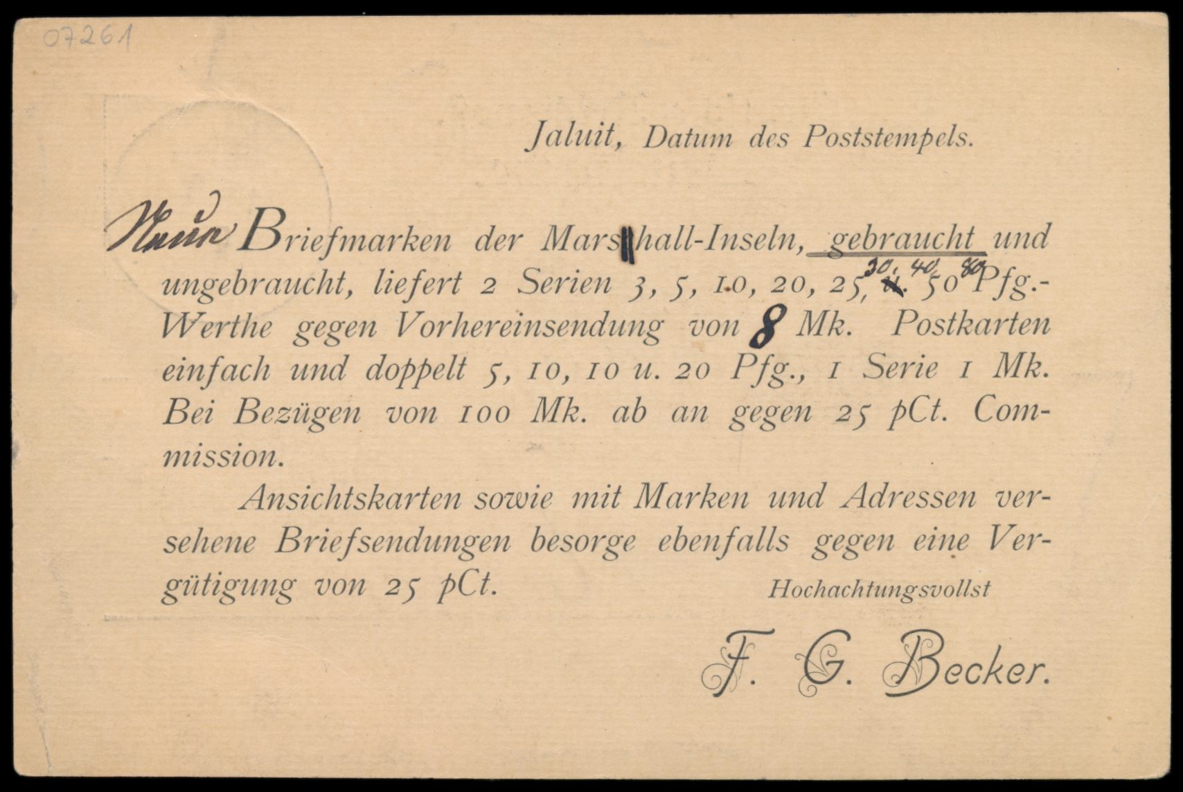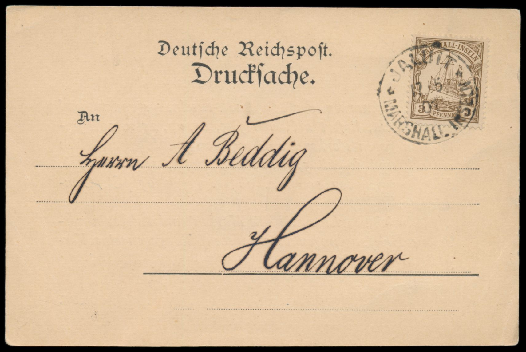 Einzelfrankatur 3 Pf. mit Stempel Jaluit 17.5.01 auf Drucksachenkarte nach Hannover, rückseitig gedruckte Briefmarken-Offerte von F.G. Becker, Bedarf