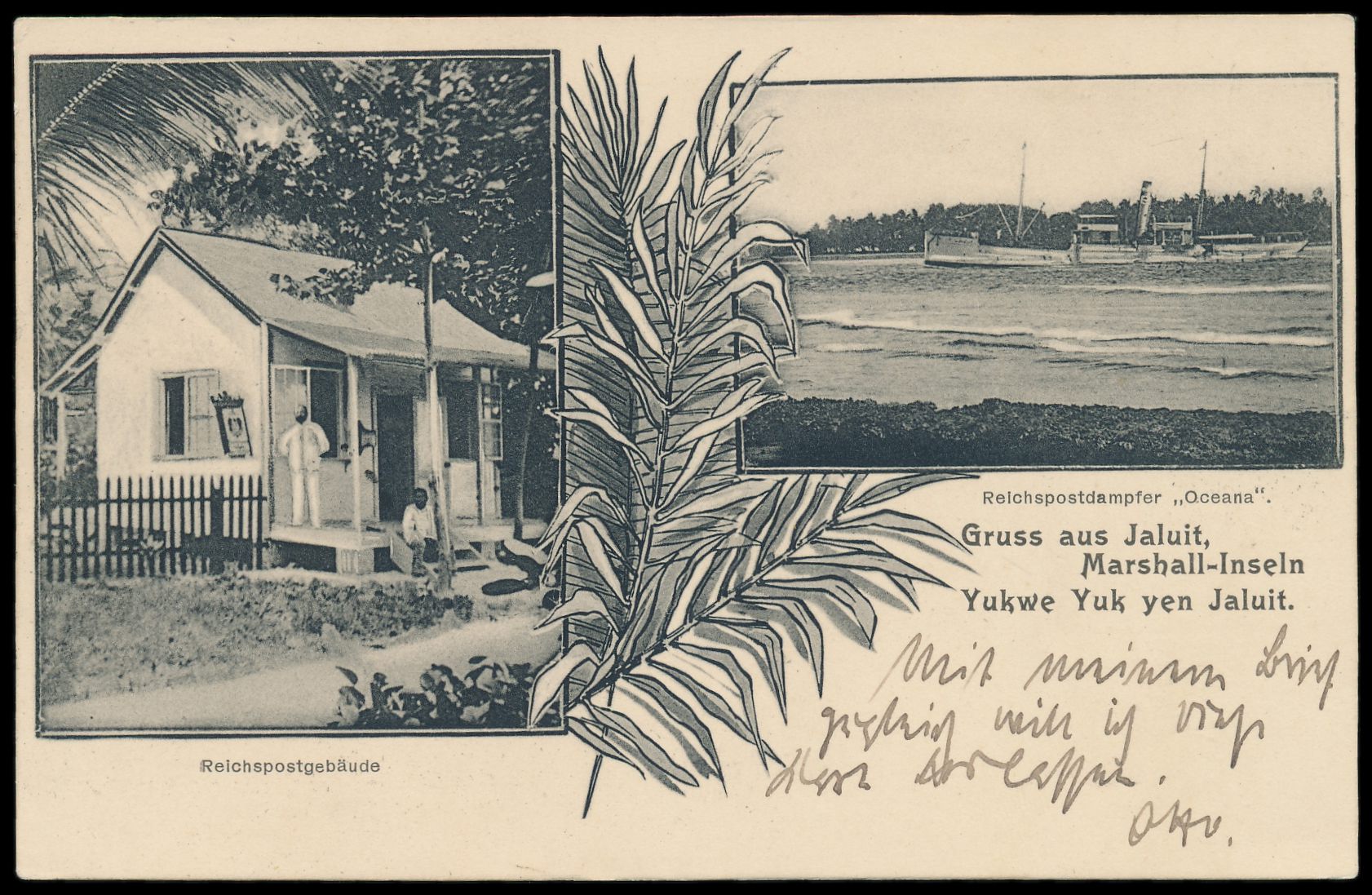 Zweibild-Ansichtskarte Gruss aus Jaluit - Reichspostgebäude / Reichspostdampfer "Oceana", Frankatur 2 x 3 Pf. und 5 Pf., Stempel Jaluit 20.12.03, nach Lausanne / Schweiz, Bedarf