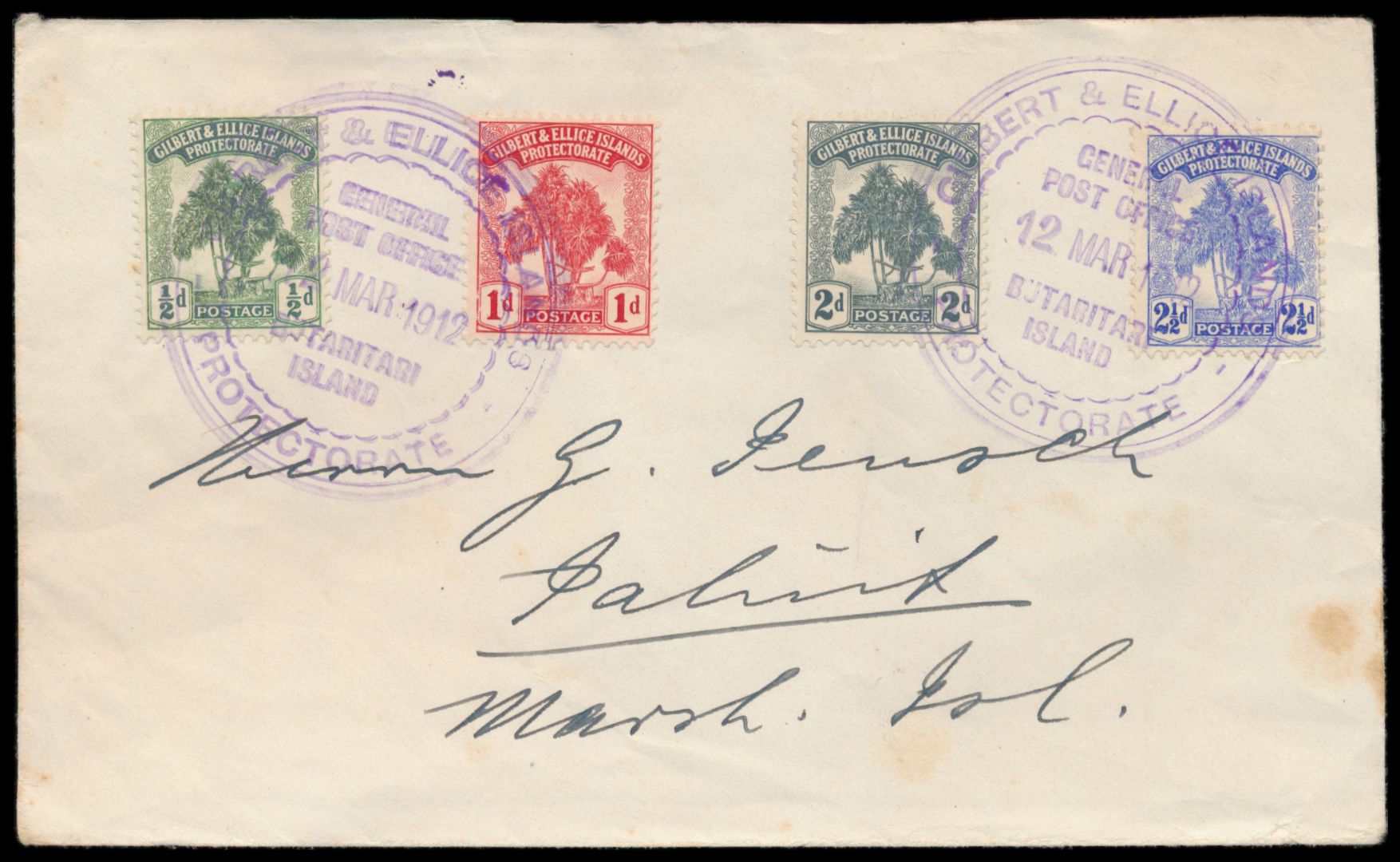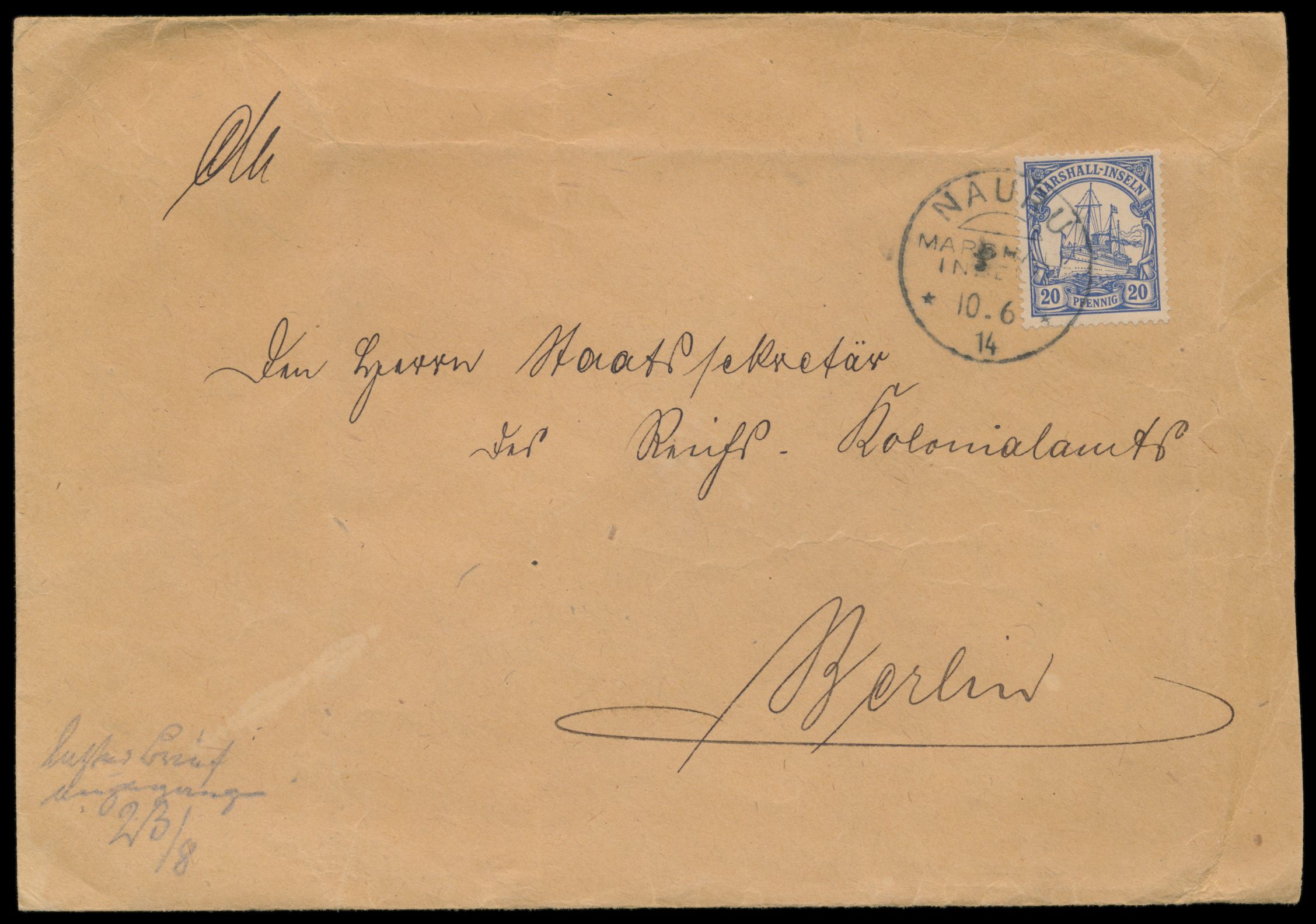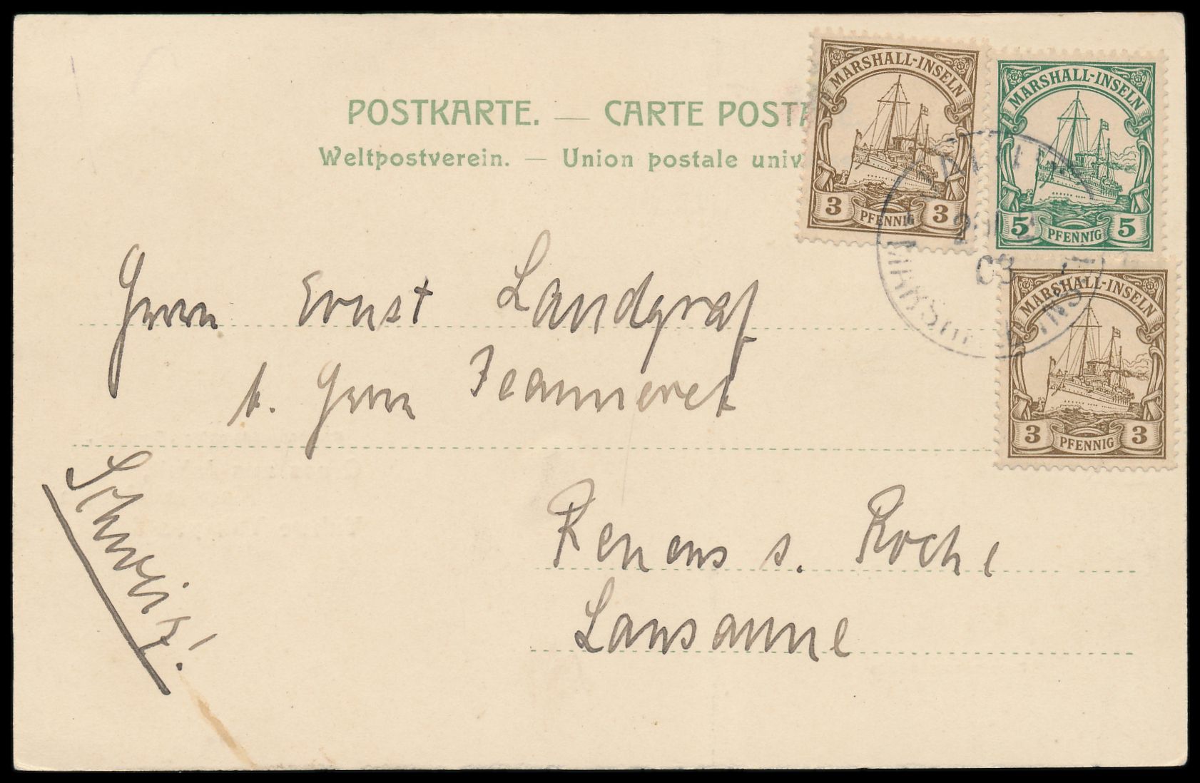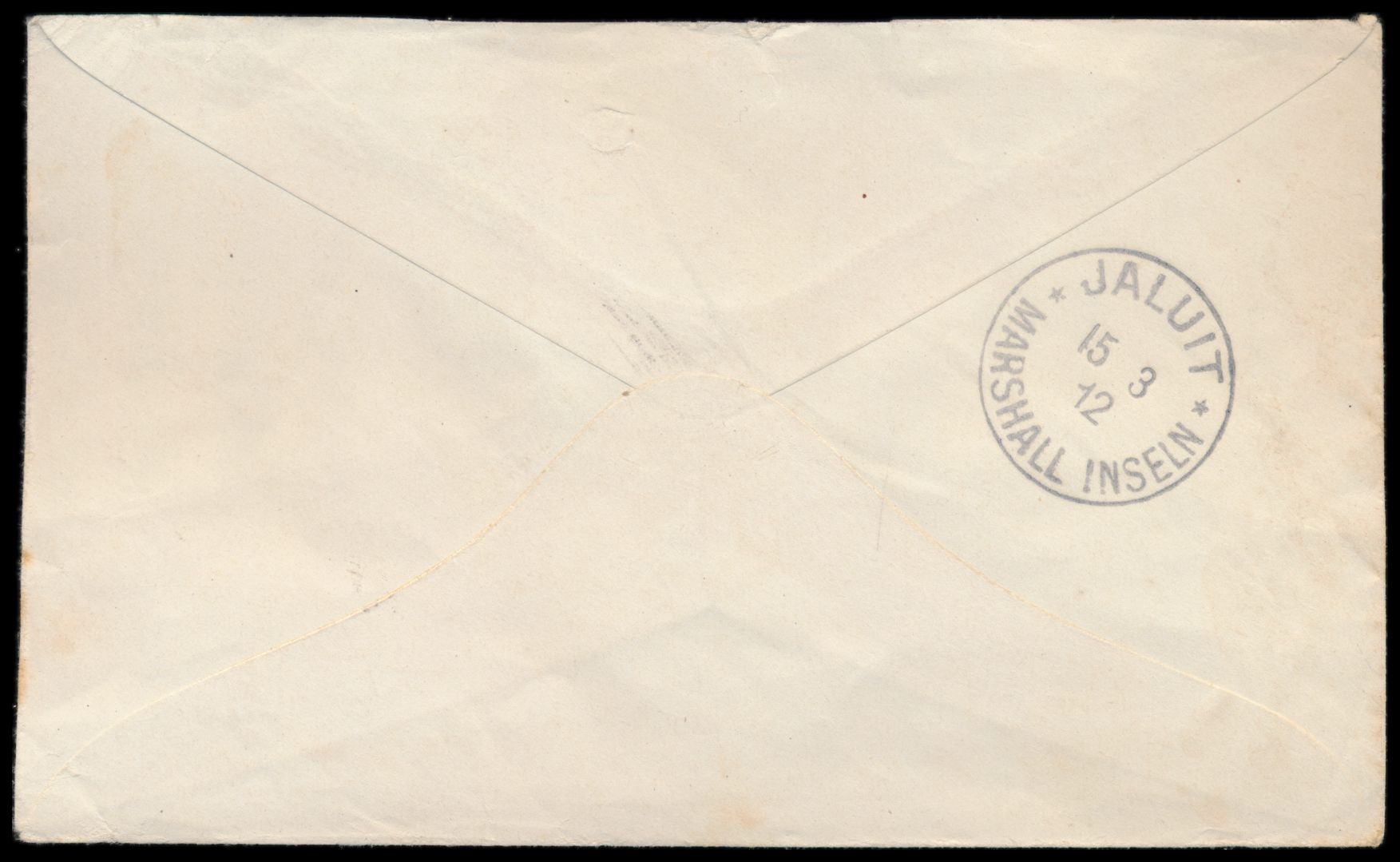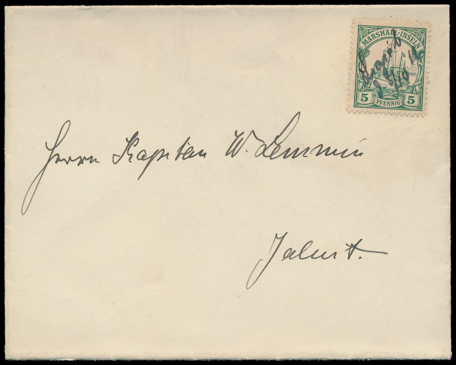 5 Pf. mit handschriftlicher Atollpost-Entwertung "Ligieb d. 5.10.12" auf Brief an Kapitän W. Lemmin in Jaluit, Ankunftstempel Jaluit 12.10.12