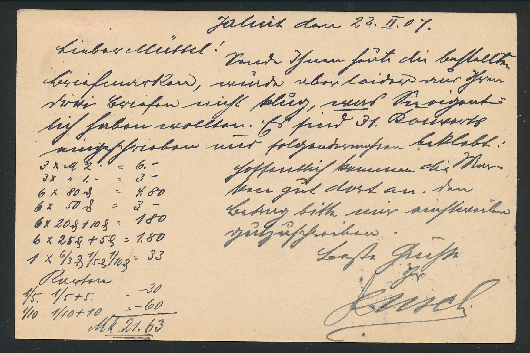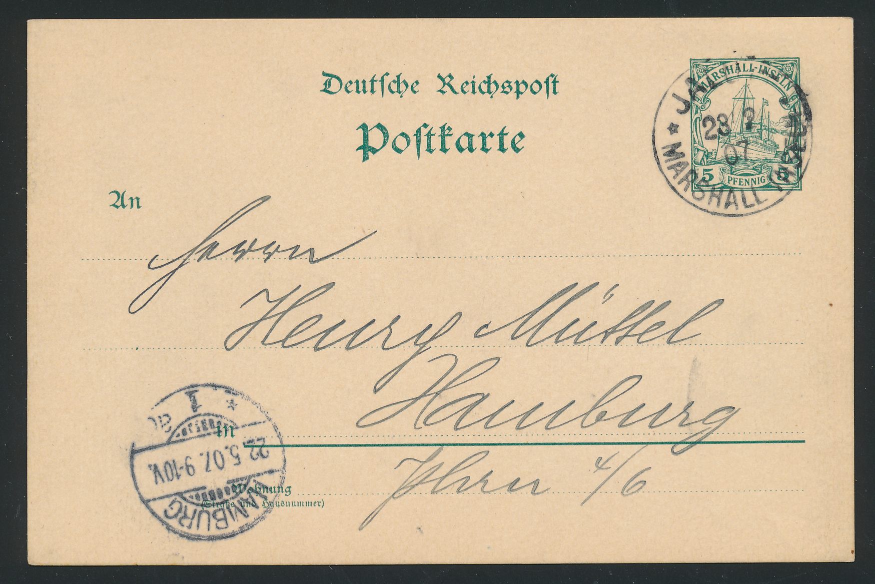 Ganzsache 5 Pf. mit Stempel Jaluit 28.2.07 nach Hamburg, Ankunftstempel 22.5.07, Mitteilung über den Versand von 33 Einschreibbriefen und deren Frankierung, Bedarf
