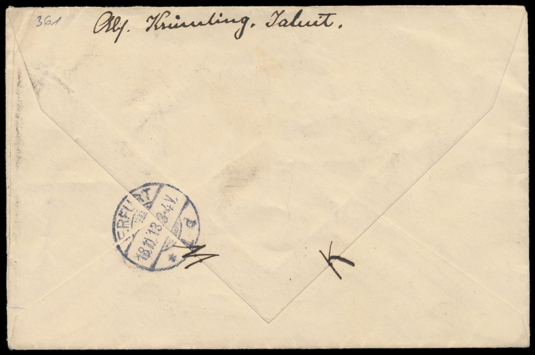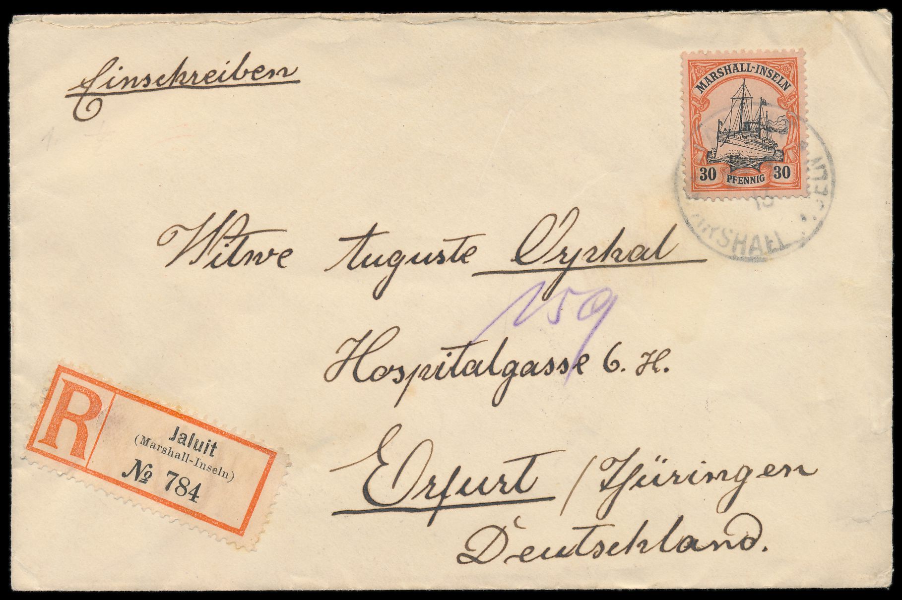 30 Pf. auf Einschreibbrief mit Stempel Jaluit 22.9.13 nach Erfurt, R-Zettel Einfeldt Nr. 11, Ankunftstempel 18.11.13, Absenderangabe "Krümling, Jaluit", Bedarf