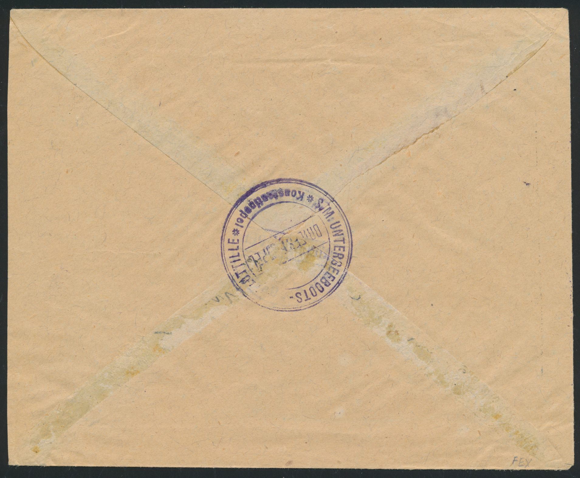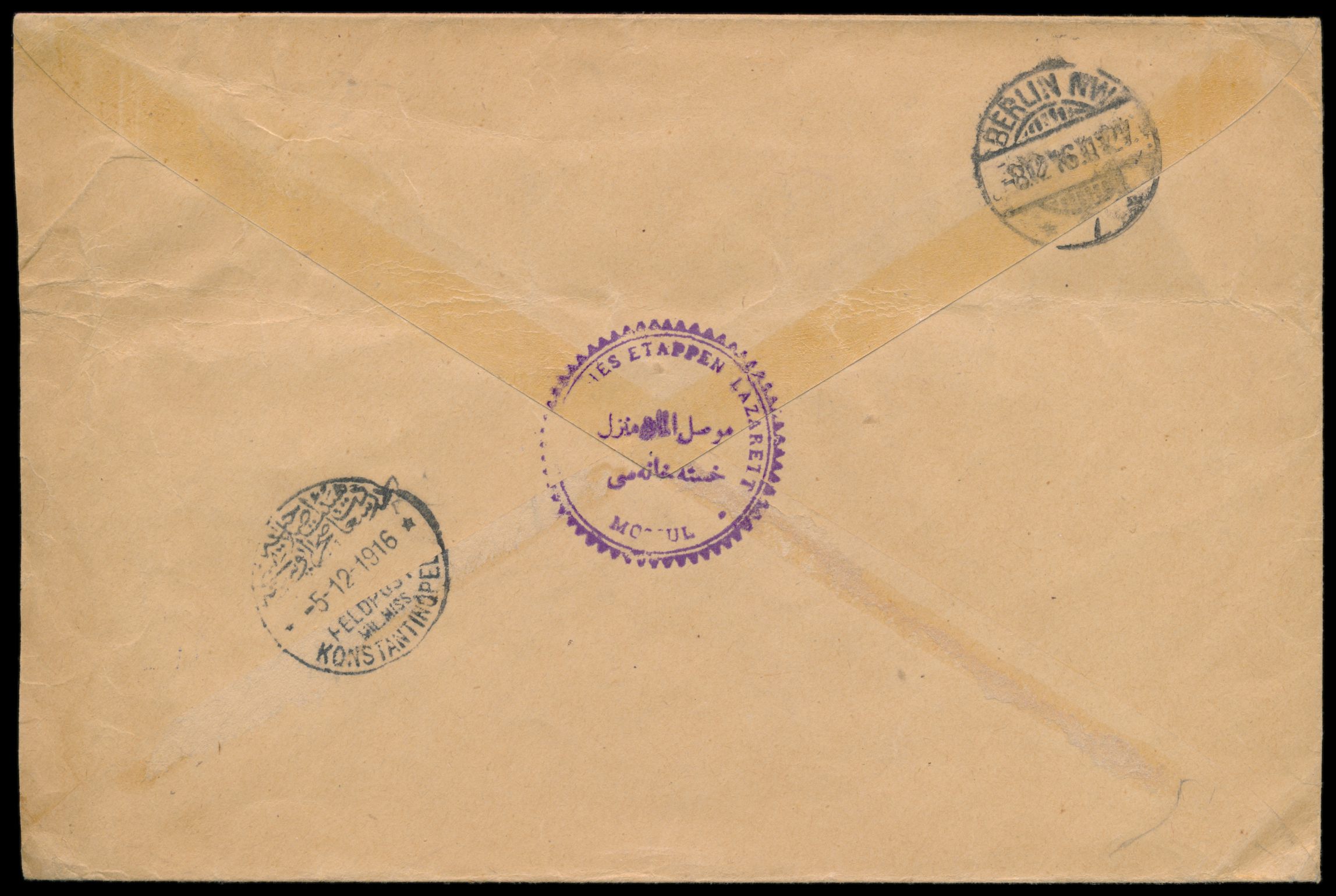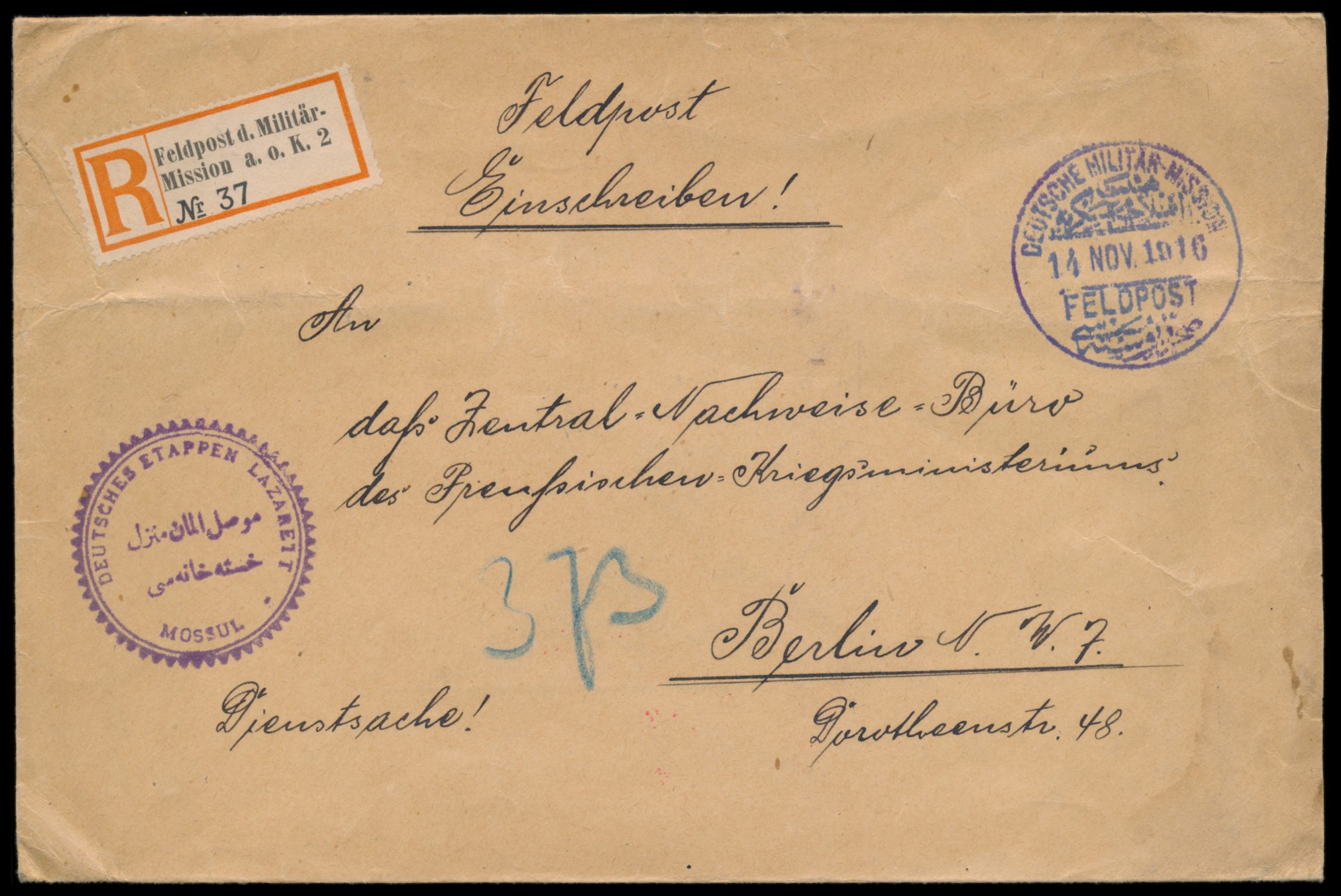 violetter zweisprachiger Stempel Feldpost Deutsche Militär-Mission 14. Nov. 1916 während der Verwendung in Mossul auf Einschreibbrief nach Berlin, beidseitig violettes zweisprachiges Dienstsiegel "Deutsches Etappen Lazarett Mossul", R-Zettel "Feldpost d. Militär-Mission a. o. K. 2" mit Nr. 37, Durchgangsstempel Feldpost Mil. Miss. Konstantinopel 5.12.1916 und Ankunftstempel Berlin 8.12.16, einer von drei bekannten R-Briefen