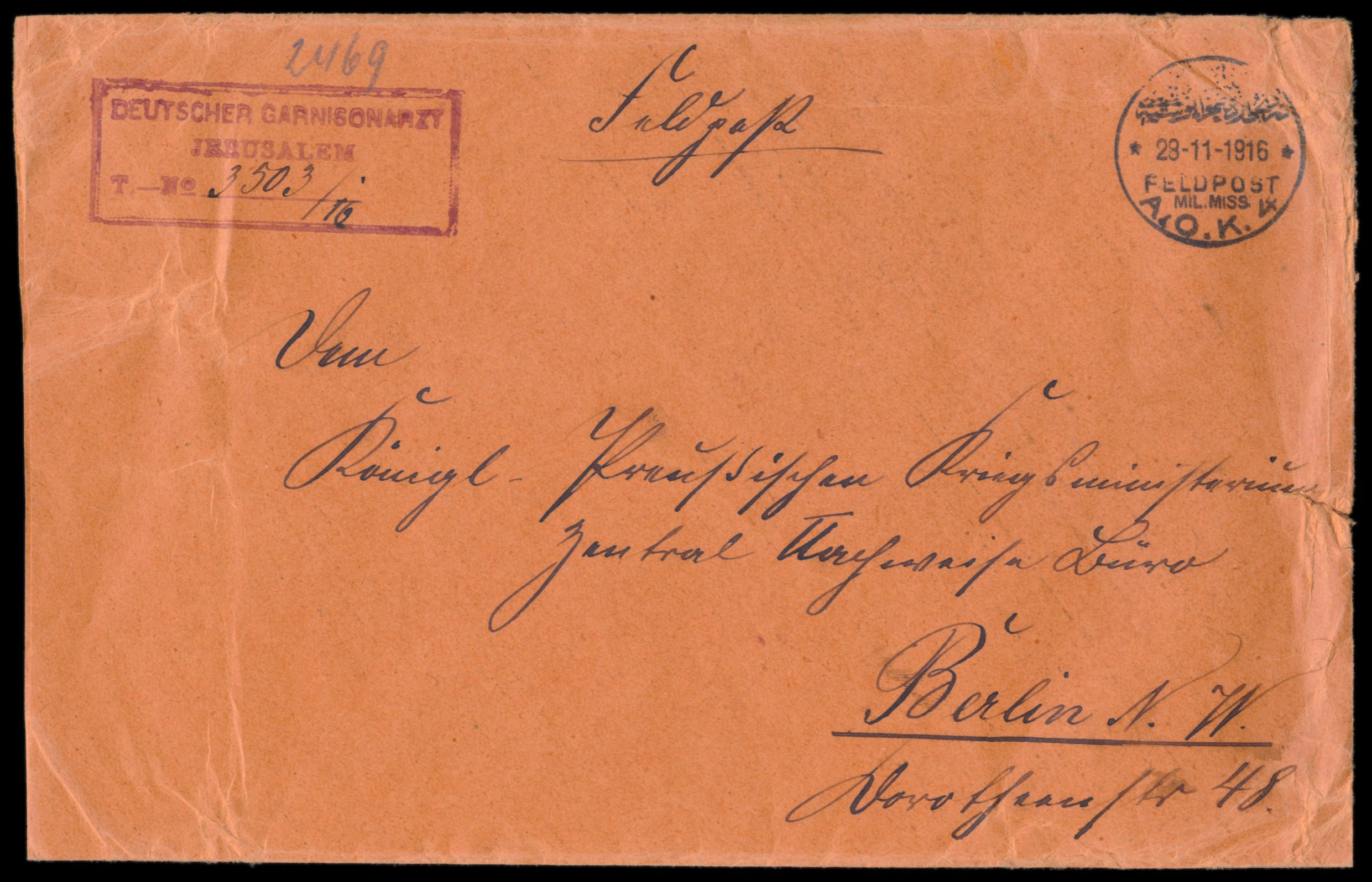 Stempel Feldpost Mil. Miss. A.O.K.4 28.11.1916 in Jerusalem und seltener Rahmenstempel "Deutscher Garnisonarzt / Jerusalem / ..." auf Feldpostbrief nach Berlin, rechts schwache Randknitter und kleiner Einriss, Bedarf
