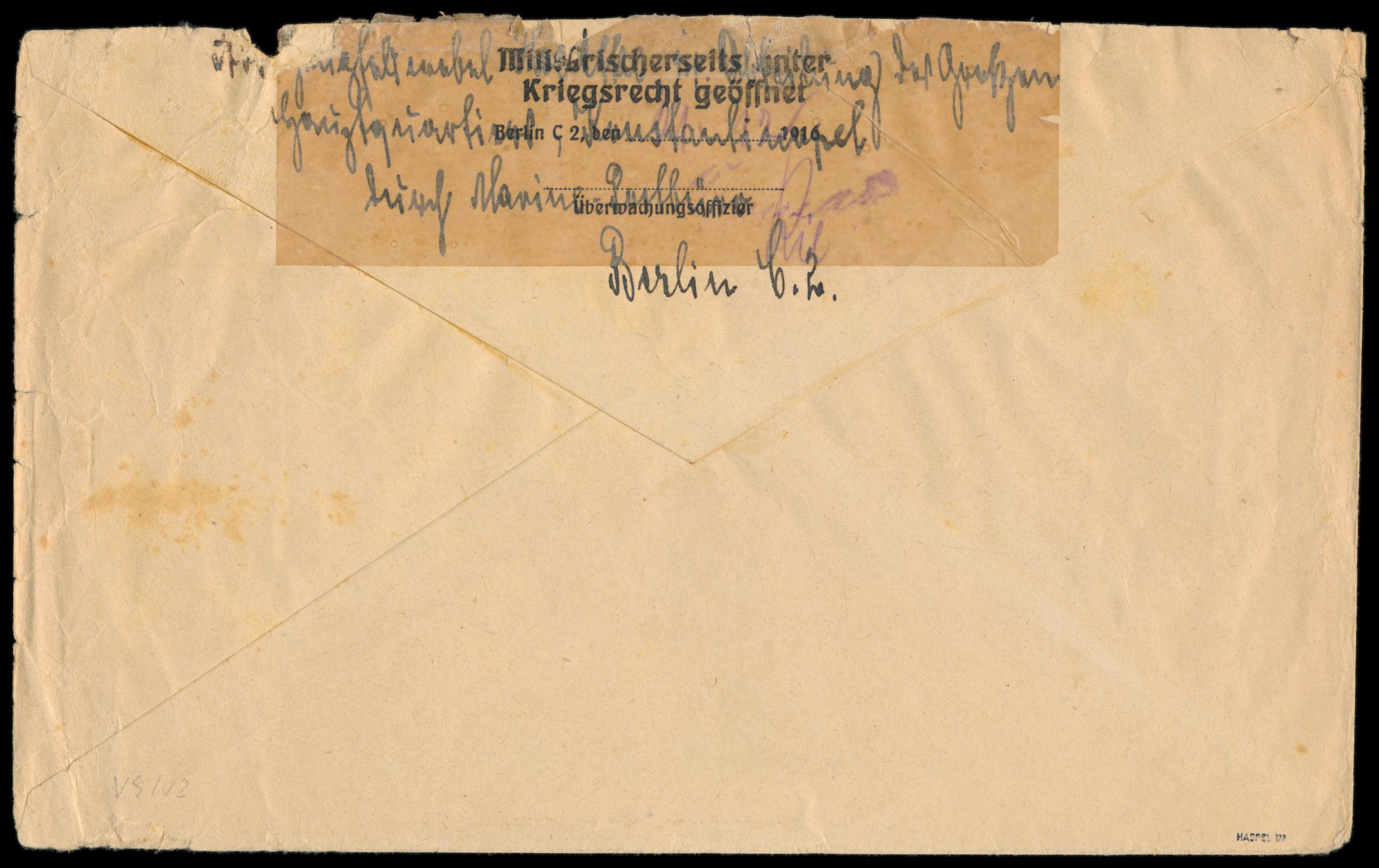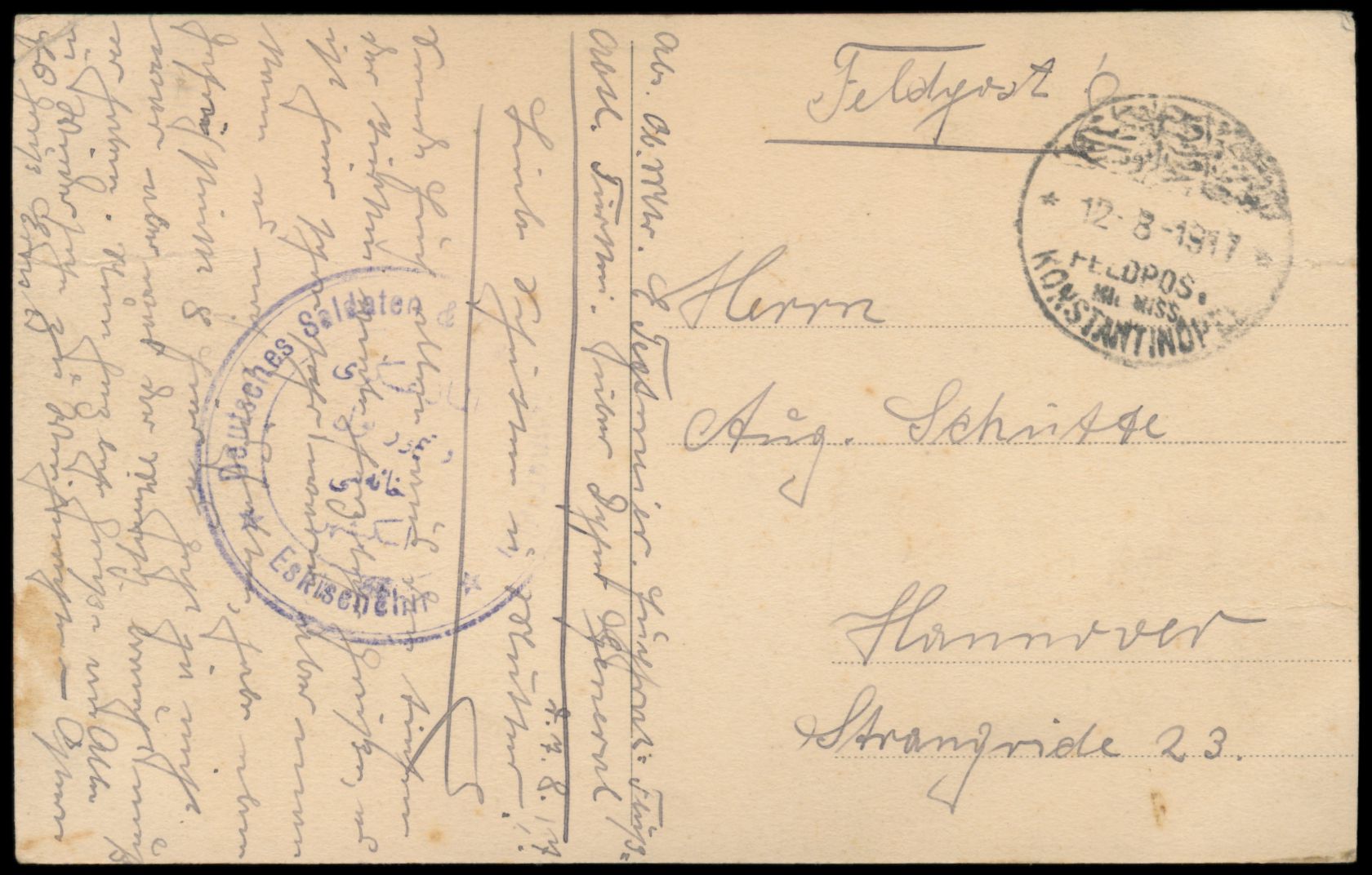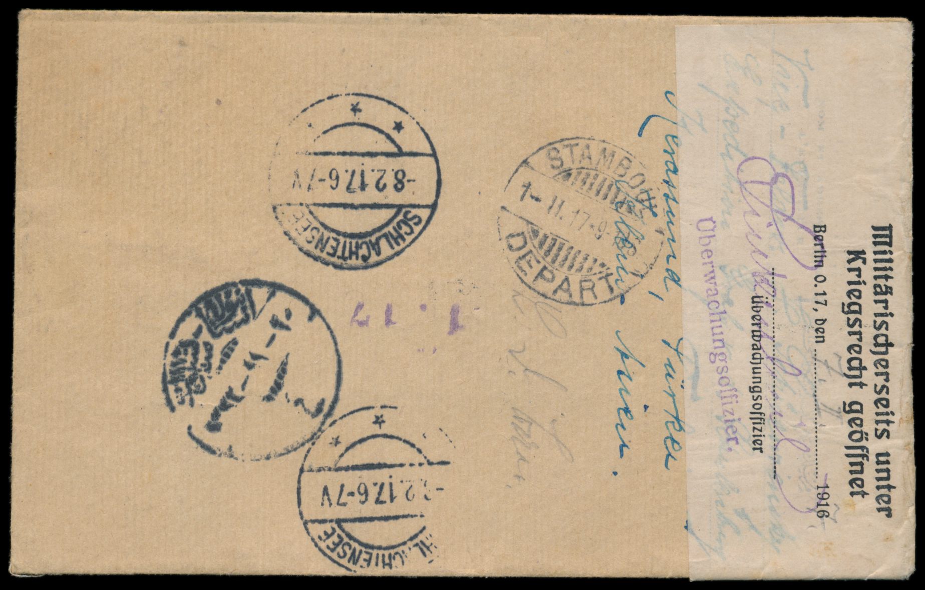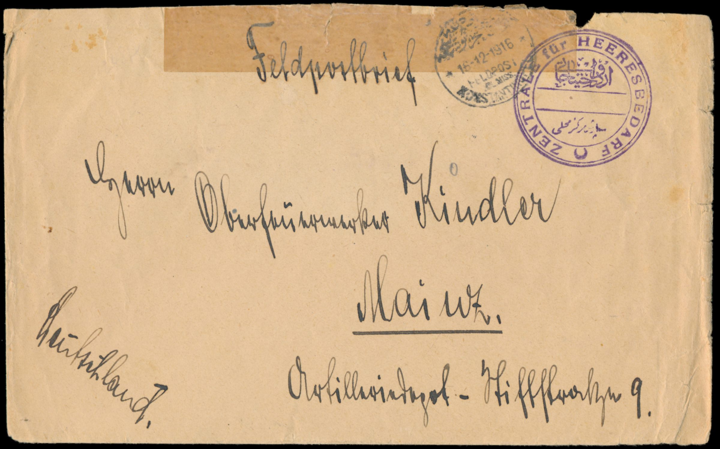 Stempel Feldpost Mil. Miss. Konstantinopel 16.12.16 und seltener zweisprachiger (deutsch / arabisch) Briefstempel Zentralstelle für Heeresbedarf auf Feldpostbrief nach Mainz, rückseitig handschriftliche Absenderangabe, oben Pergamin-Zensurverschlußzettel von Berlin C. 2, leichte Alterungsspuren, oben winziger Ausriss, leichte Randknitter, Bedarf