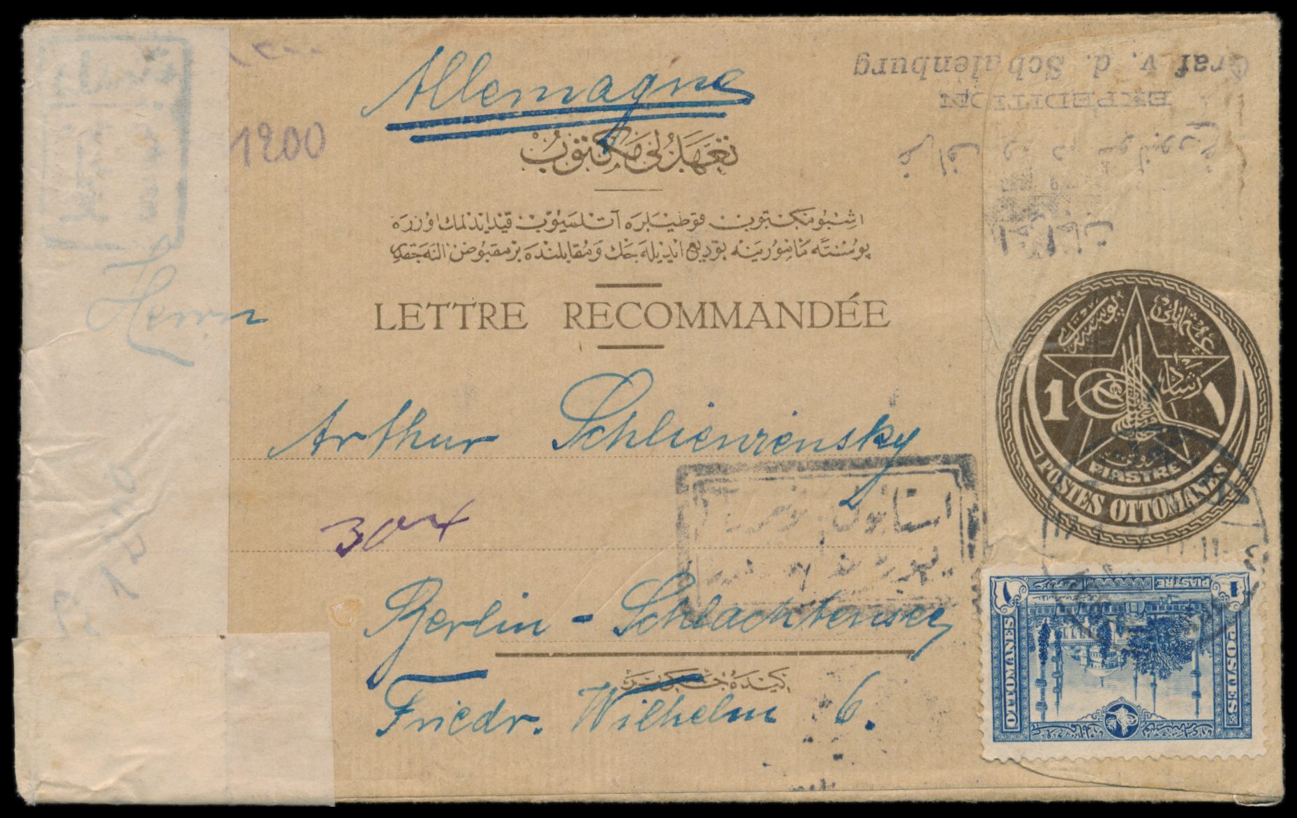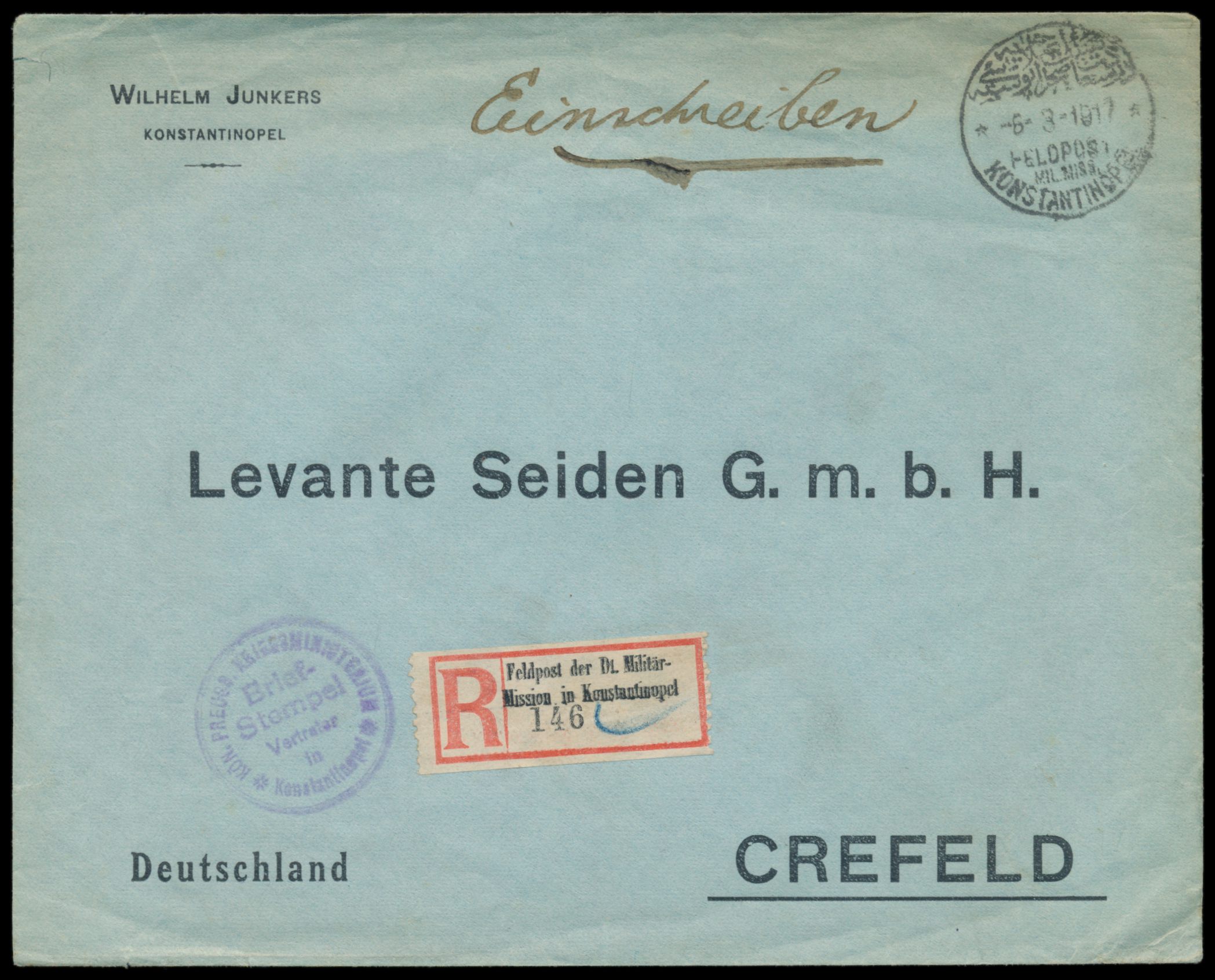 Stempel Feldpost Mil. Miss. Konstantinopel 8.3.1917 auf Einschreibbrief nach Deutschland, R-Zettel "... in Konstantinopel" (Einfeldt Nr. 4), vorder- und rückseitig Briefstempel Kön. Preuss. Kriegsministerium / Vertreter in Konstantinopel, Ankunftstempel Crefeld 14.3.17, Bedarf
