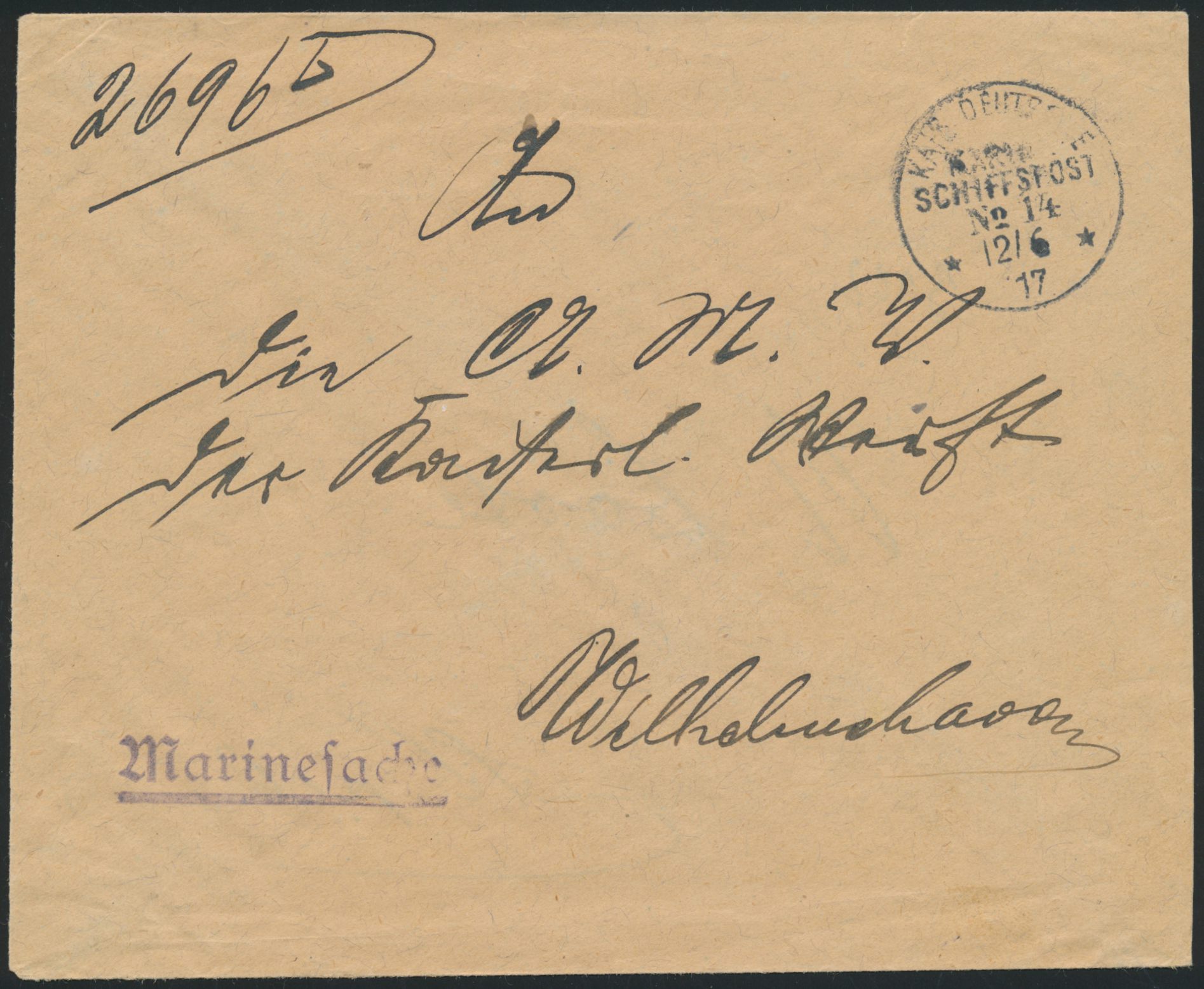 Stempel MSP No. 14 12.6.17, Dampfer General, gewendeter Briefumschlag (dreiseitig offen) als Marinesache nach Wilhelmshaven, rückseitig Briefstempel S. M. Unterseeboots-Flottille Konstantinopel