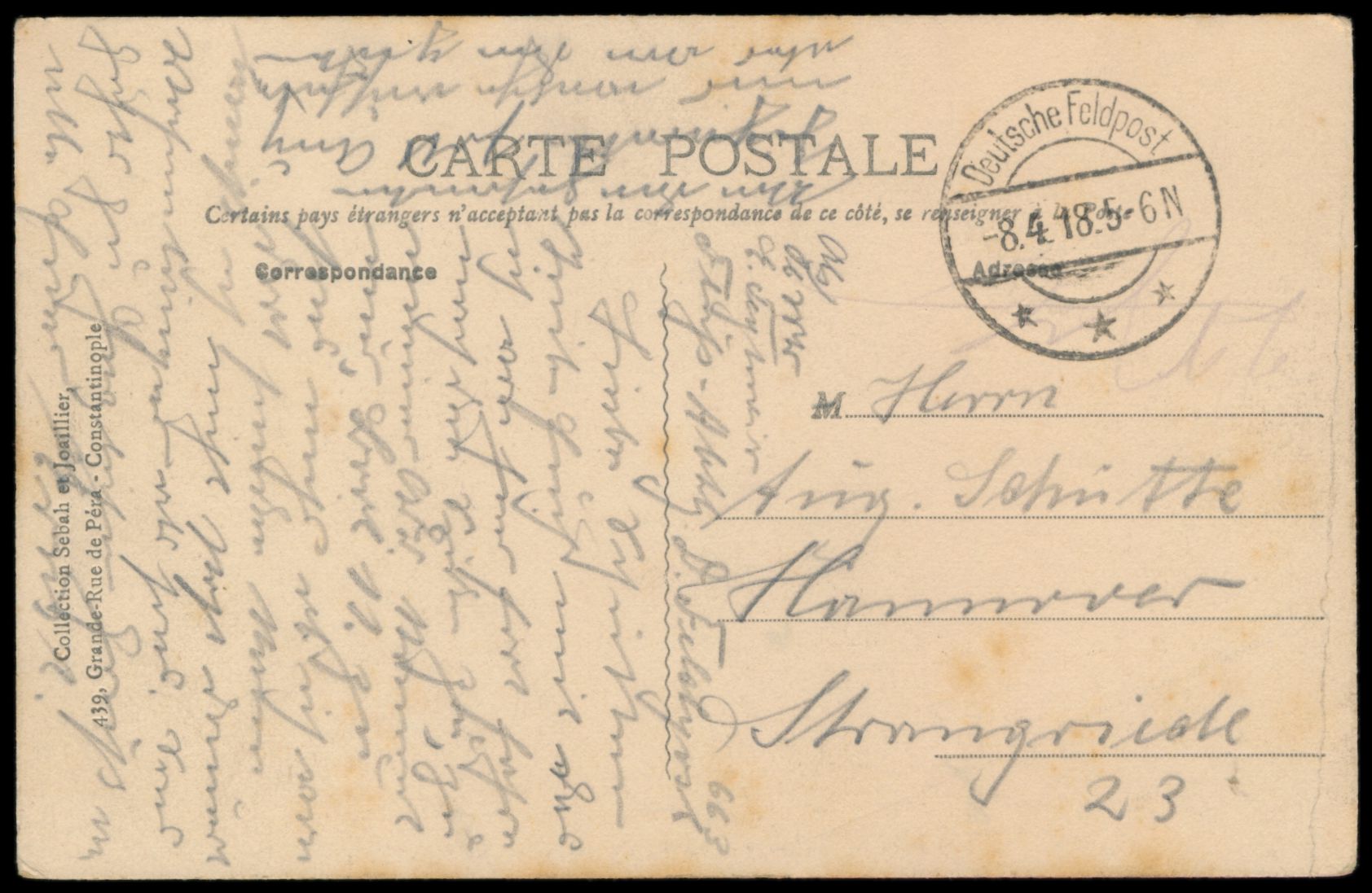3 Feldpostkarten einer Korrespondenz aus der Türkei nach Hannover, alle mit Tarnstempel Deutsche Feldpost 5.10.17, 5.11.71 (Fehleinstellung) und 8.4.18, alle mit Absenderangabe "Ob. Matr. ... Fluss-Abtl., Dt. Feldpost 663", saubere Stempelabschläge, Bedarf