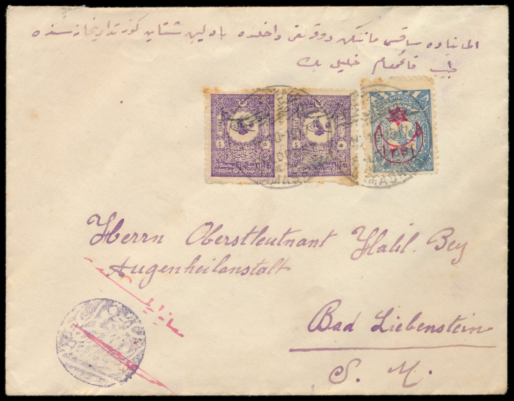 Stempel Feldpost Mil. Miss. Damaskus 16.10.1917 als Entwertung auf Brief mit Türkei 2 x 5 Pa. und 1 Pia. (Marken Stockflecke) an Hakil Bey in Bad Liebenstein, arabische Absenderangabe und links unten arabischer Siegelstempel