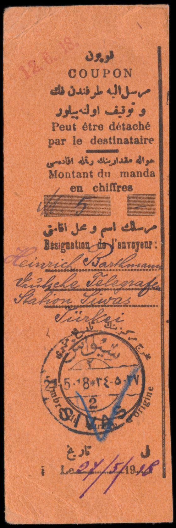 Einlieferungsabschnitt einer türkischen Postanweisung auf 5 M., handschriftlich Absender "Heinrich Barthmann, Deutsche Telegrafen-Station Siwas, Türkei", Stempel Sivas 27.5.18, seltener Beleg aus Zentralanatolien, Bedarf