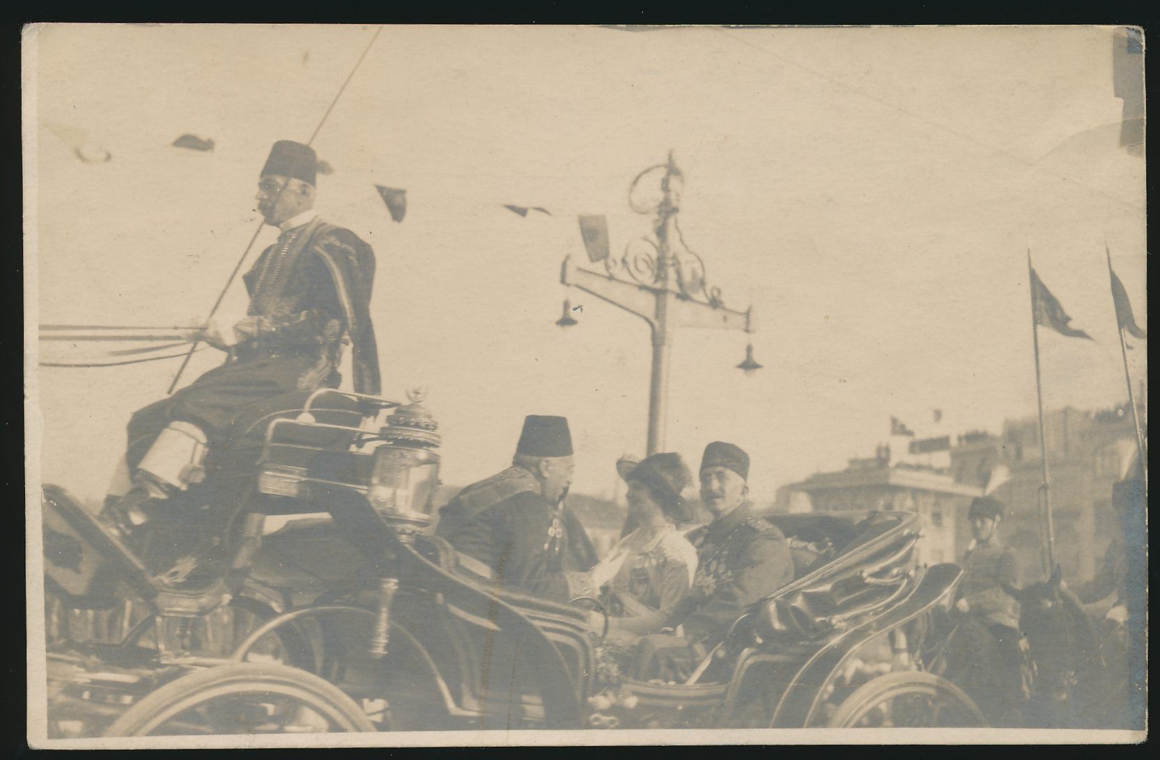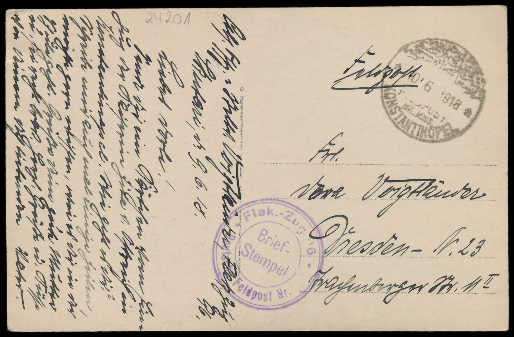 Stempel Feldpost Mil. Miss. Konstantinopel 10.6.1918 und seltener Briefstempel Flak.-Zug 96 / Deutsche Feldpost Nr. ... (aptiert), durch Karl Heimann seinerzeit nicht belegt, auf Foto-Ansichtskarte "Einzug der Kaiserin Zita v. Österreich in Konstantinopel ..." laut Kartentext, seltene Privataufnahme, nach Dresden, Bedarf